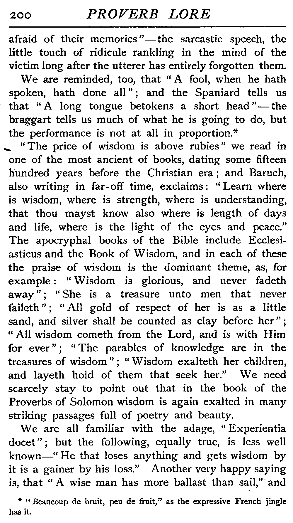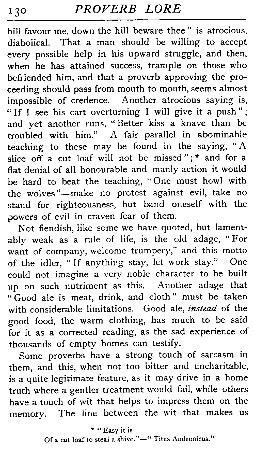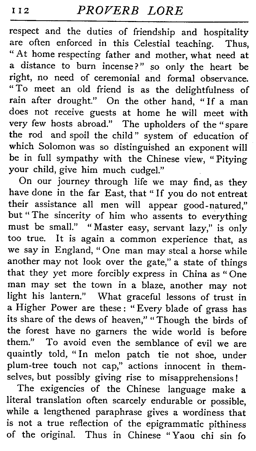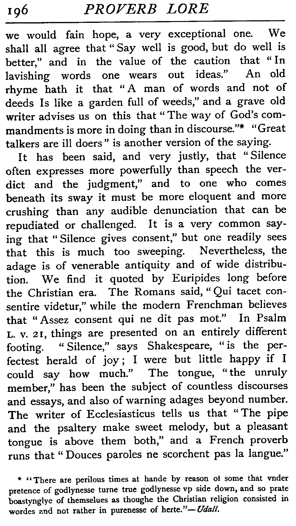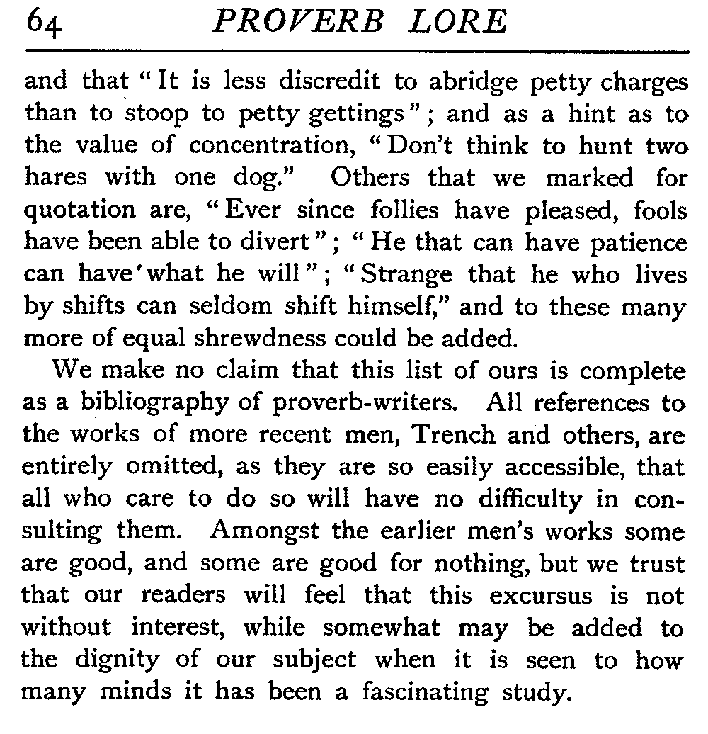 That a proverb should be plain in language and teaching is, we take it, by no means an essential. It rather owes often somewhat of its value to the fact that there is something in it that compels analysis, possibly awakens doubt or resistance, startles us by an apparent [9]contradiction, and compels us to delve at some trouble to ourselves before we grasp its significance. Ray, one of the best known students of proverb-lore, realises this when he stipulates for "an instructive sentence in which more is generally designed than expressed" as his ideal.