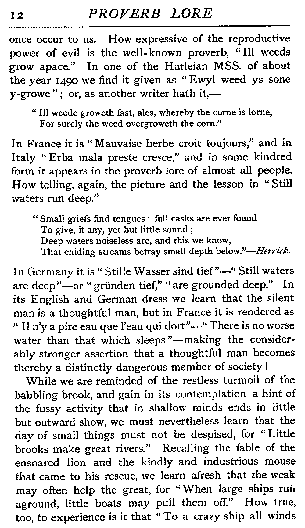 In France it is "Mauvaise herbe croit toujours," and in Italy "Erba mala preste cresce," and in some kindred form it appears in the proverb lore of almost all people. How telling, again, the picture and the lesson in "Still waters run deep."