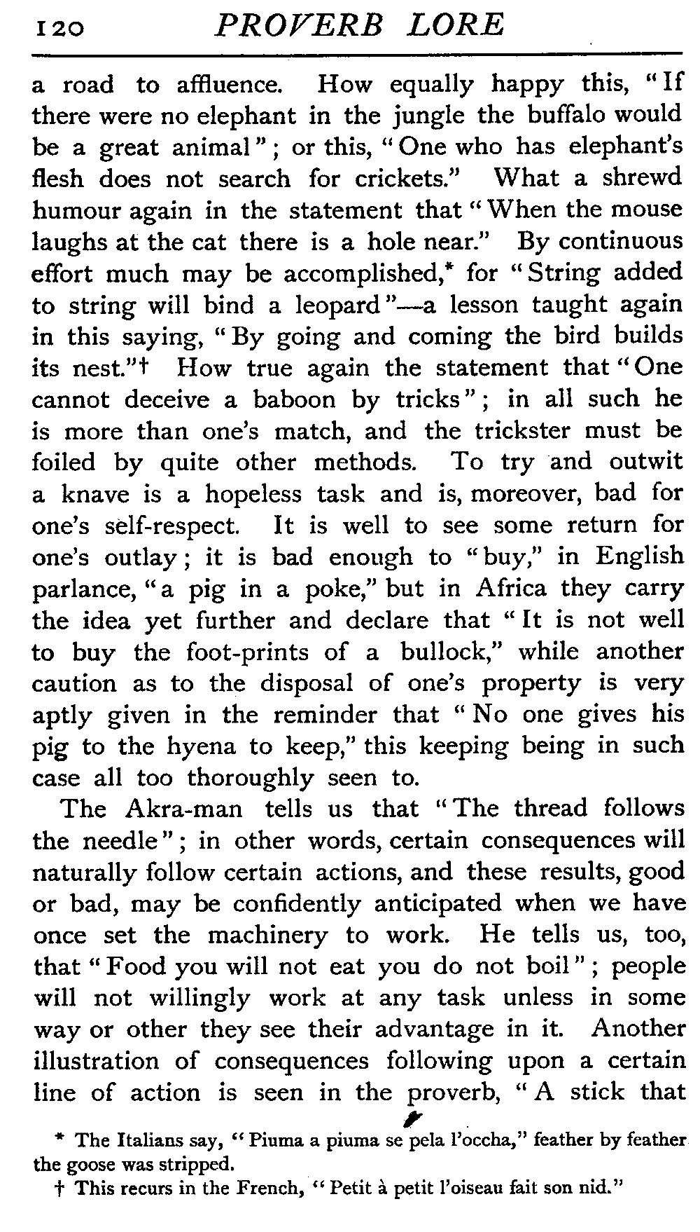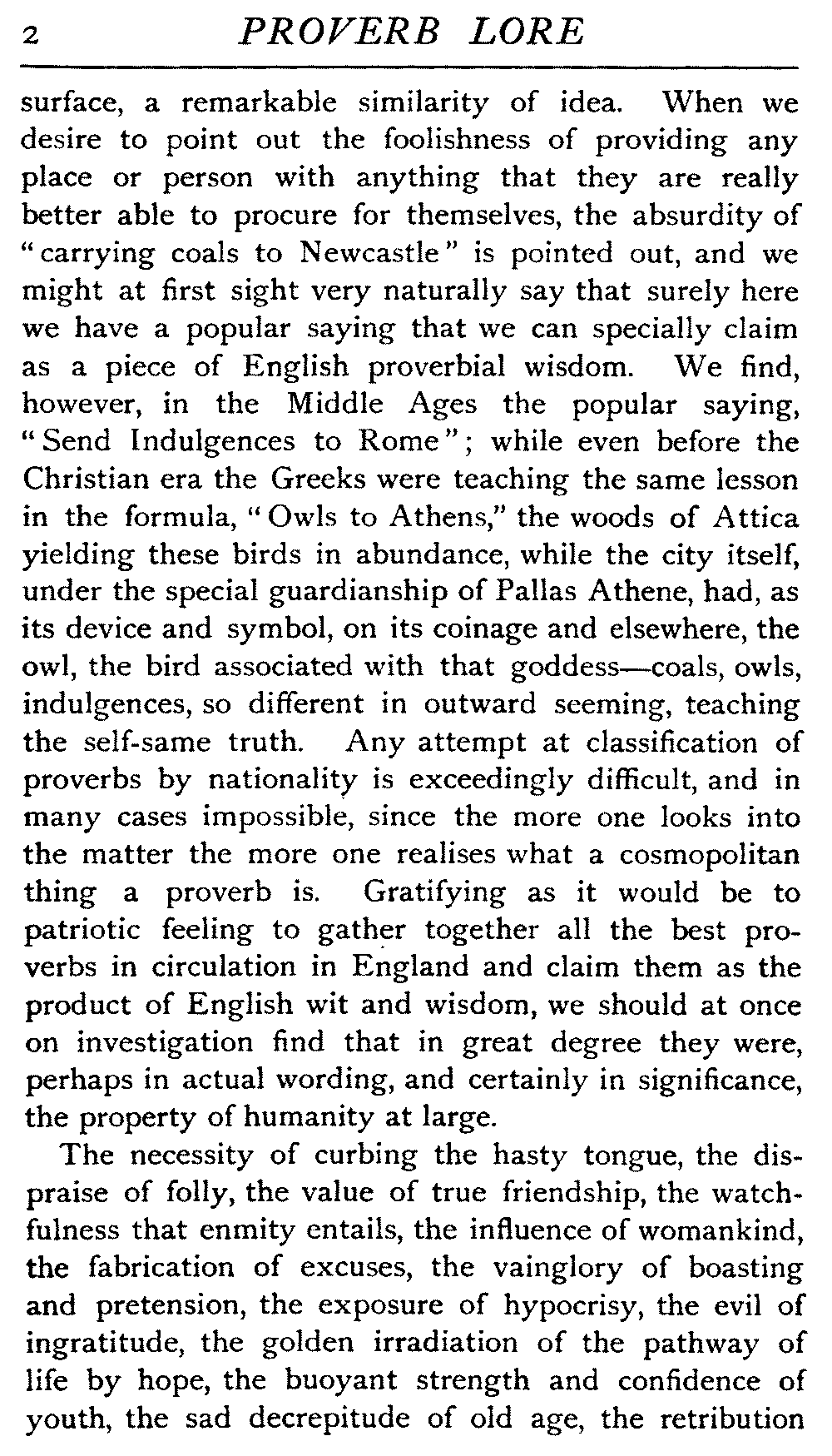 The study of proverbs is one of exceeding interest and value. By means of it our thoughts travel back through the ages to the childhood of the world, and we see at once how amidst the surroundings that vary so greatly in every age and in every clime the common inherent oneness of humanity asserts itself: how, while fashions change, motives of action remain; how, beneath the burning sun of Bengal or Ashanti, in the tents of the Crees, or amidst the snows of Lapland, the thoughts of men on the great problems that confront the race are strikingly at one. Hence, while the outward garb and phraseology of these proverbial utterances must necessarily greatly vary, we find, when we pierce below the [2]surface, a remarkable similarity of idea. When we desire to point out the foolishness of providing any place or person with anything that they are really better able to procure for themselves, the absurdity of "carrying coals to Newcastle" is pointed out, and we might at first sight very naturally say that surely here we have a popular saying that we can specially claim as a piece of English proverbial wisdom. We find, however, in the Middle Ages the popular saying, "Send Indulgences to Rome"; while even before the Christian era the Greeks were teaching the same lesson in the formula, "Owls to Athens," the woods of Attica yielding these birds in abundance, while the city itself, under the special guardianship of Pallas Athene, had, as its device and symbol, on its coinage and elsewhere, the owl, the bird associated with that goddess—coals, owls, indulgences, so different in outward seeming, teaching the self-same truth. Any attempt at classification of proverbs by nationality is exceedingly difficult, and in many cases impossible, since the more one looks into the matter the more one realises what a cosmopolitan thing a proverb is. Gratifying as it would be to patriotic feeling to gather together all the best proverbs in circulation in England and claim them as the product of English wit and wisdom, we should at once on investigation find that in great degree they were, perhaps in actual wording, and certainly in significance, the property of humanity at large.