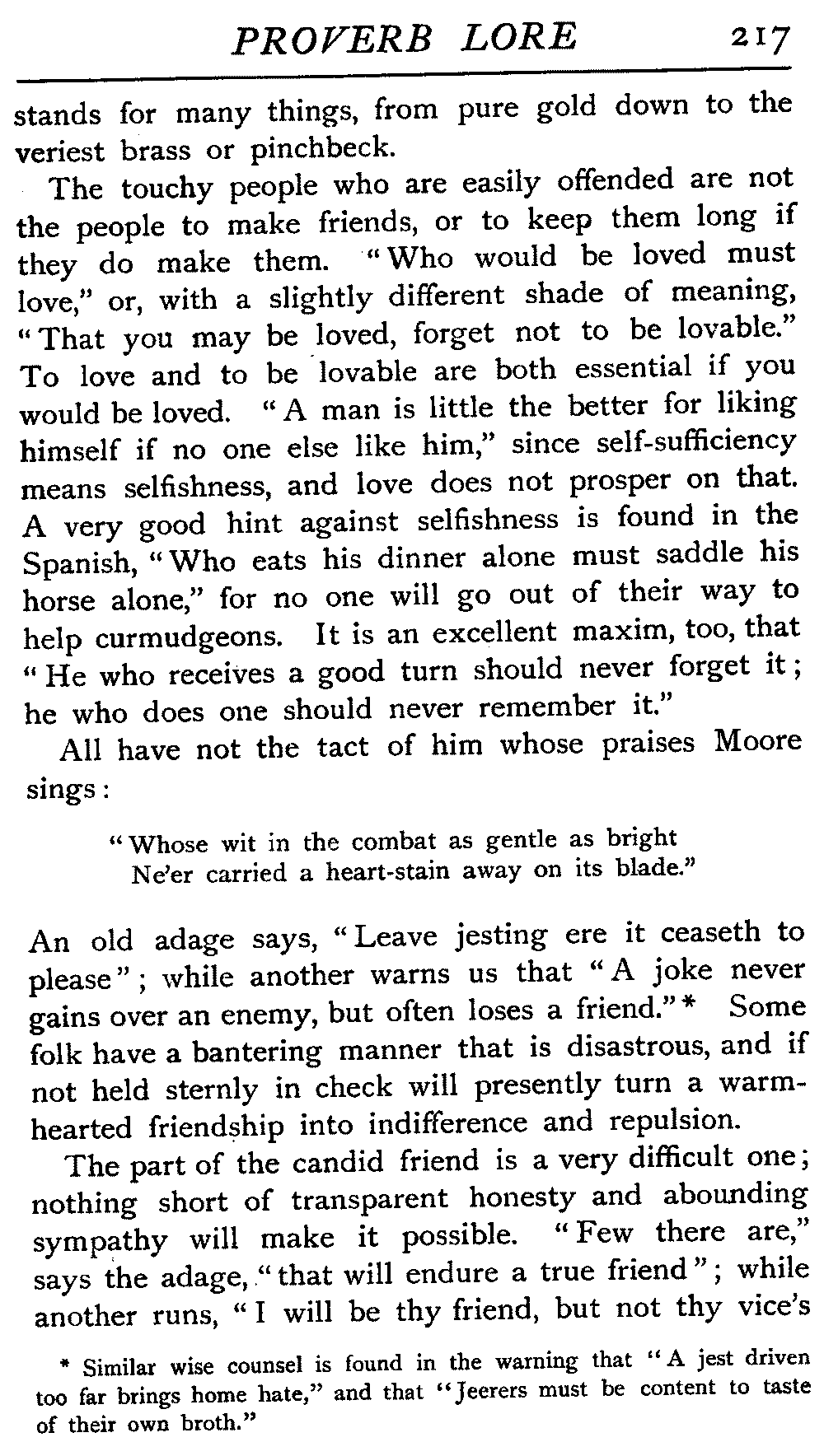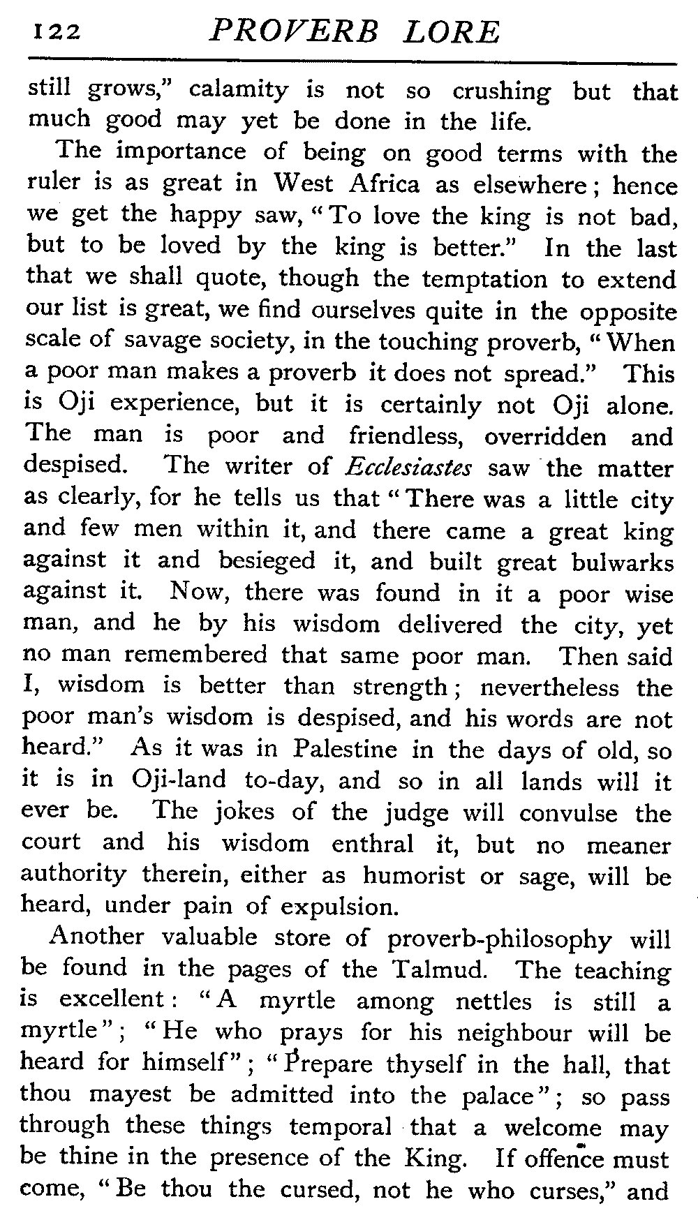 The necessity of curbing the hasty tongue, the dispraise of folly, the value of true friendship, the watchfulness that enmity entails, the influence of womankind, the fabrication of excuses, the vainglory of boasting and pretension, the exposure of hypocrisy, the evil of ingratitude, the golden irradiation of the pathway of life by hope, the buoyant strength and confidence of youth, the sad decrepitude of old age, the retribution [3]that awaits wrongdoers, were as keenly understood three thousand years ago as to-day, and the trite expression of these verities, crystallised into warning, encouragement, or reproof, is as much a part of the equipment of life to the date-seller of Damascus as to the ploughman in an English shire.