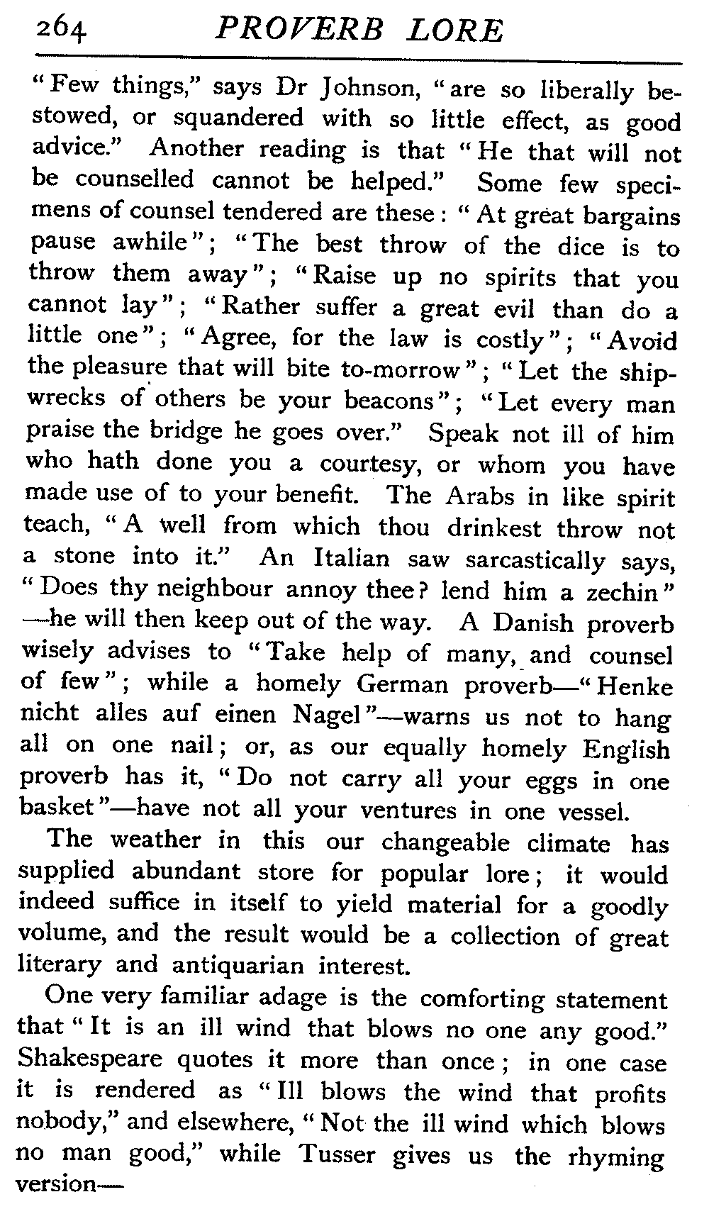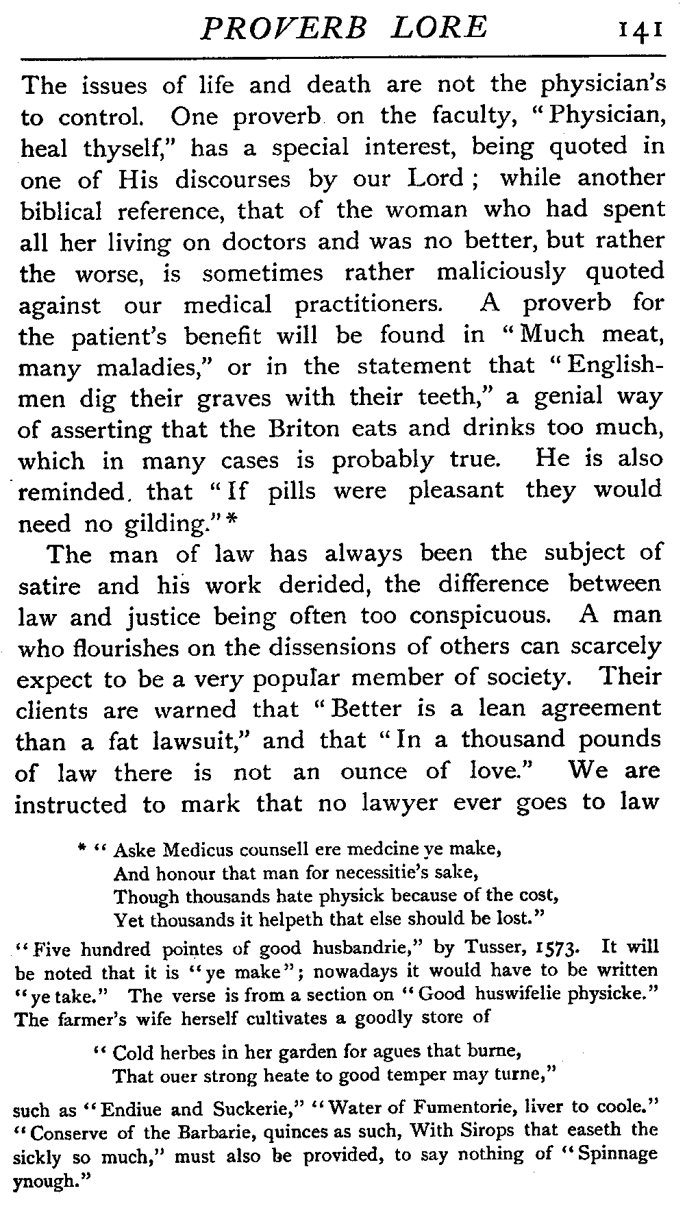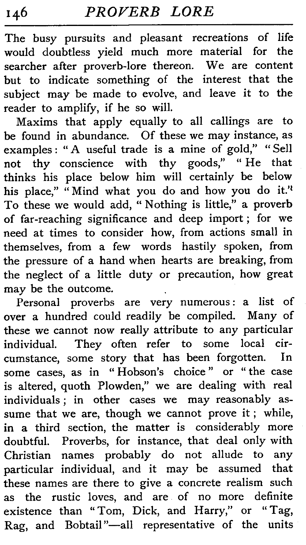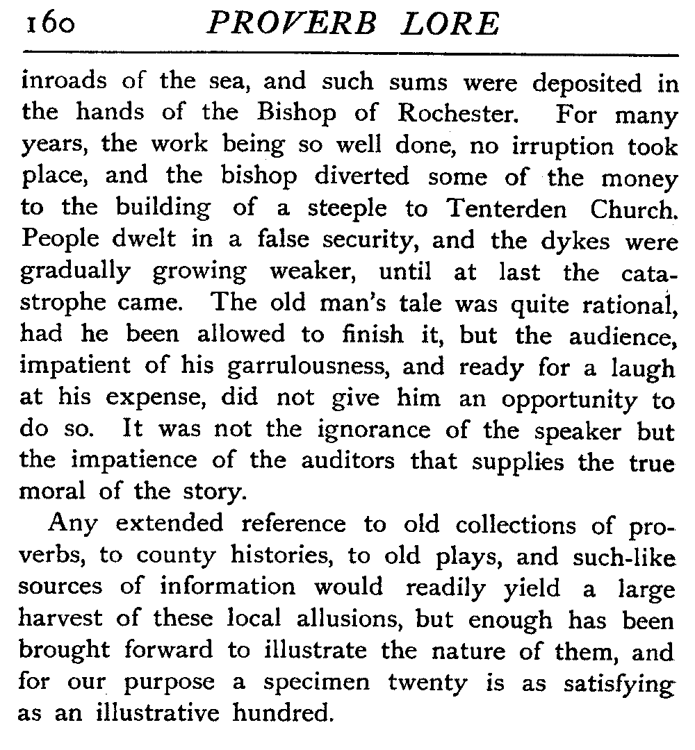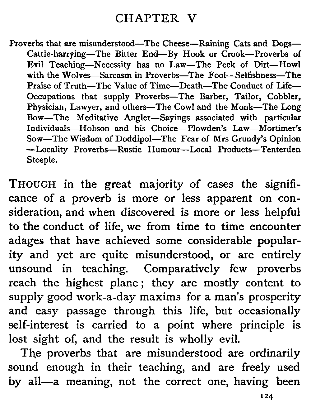| Proverbs that are misunderstood—The Cheese—Raining Cats and Dogs—Cattle-harrying—The Bitter End—By Hook or Crook—Proverbs of Evil Teaching—Necessity has no Law—The Peck of Dirt—Howl with the Wolves—Sarcasm in Proverbs—The Fool—Selfishness—The Praise of Truth—The Value of Time—Death—The Conduct of Life—Occupations that supply Proverbs—The Barber, Tailor, Cobbler, Physician, Lawyer, and others—The Cowl and the Monk—The Long Bow—The Meditative Angler—Sayings associated with particular Individuals—Hobson and his Choice—Plowden's Law—Mortimer's Sow—The Wisdom of Doddipol—The Fear of Mrs Grundy's Opinion—Locality Proverbs—Rustic Humour—Local Products—Tenterden Steeple | 124 |