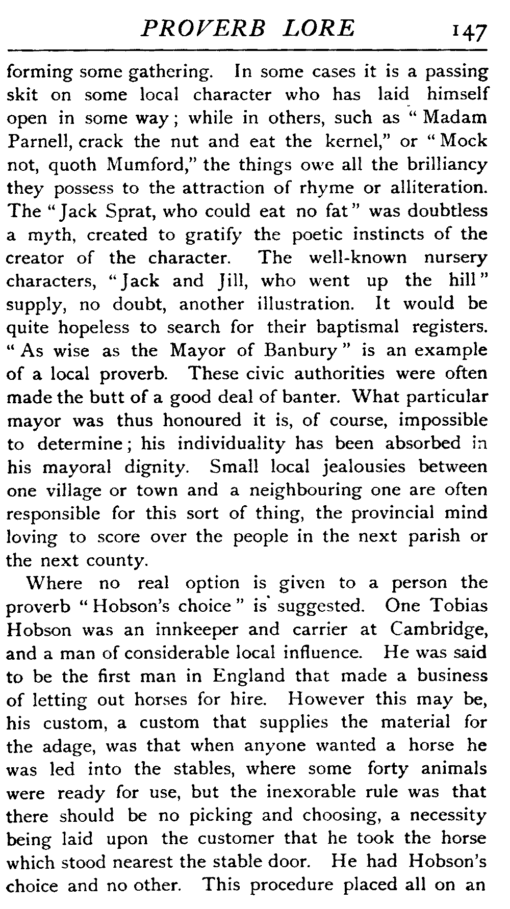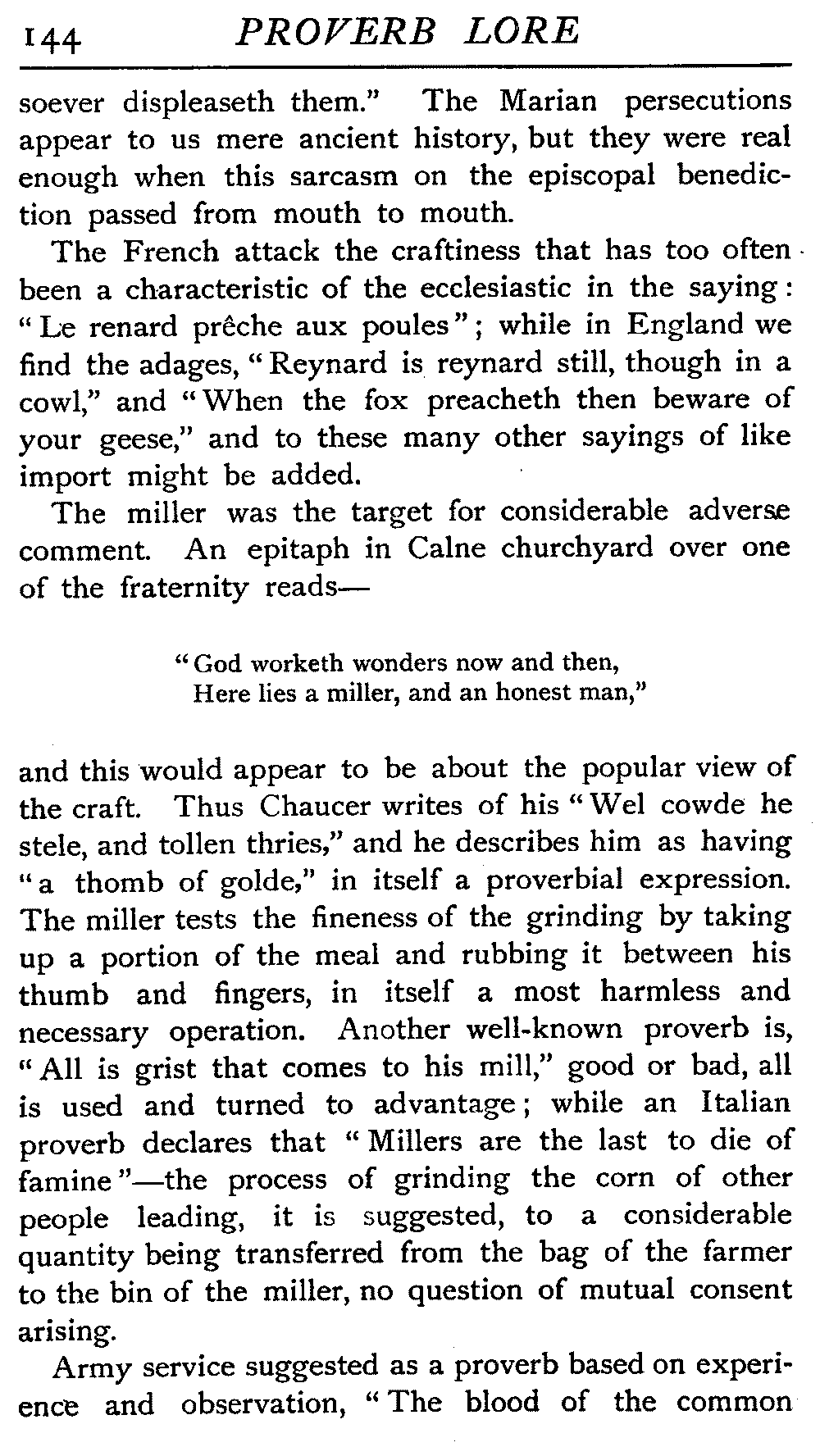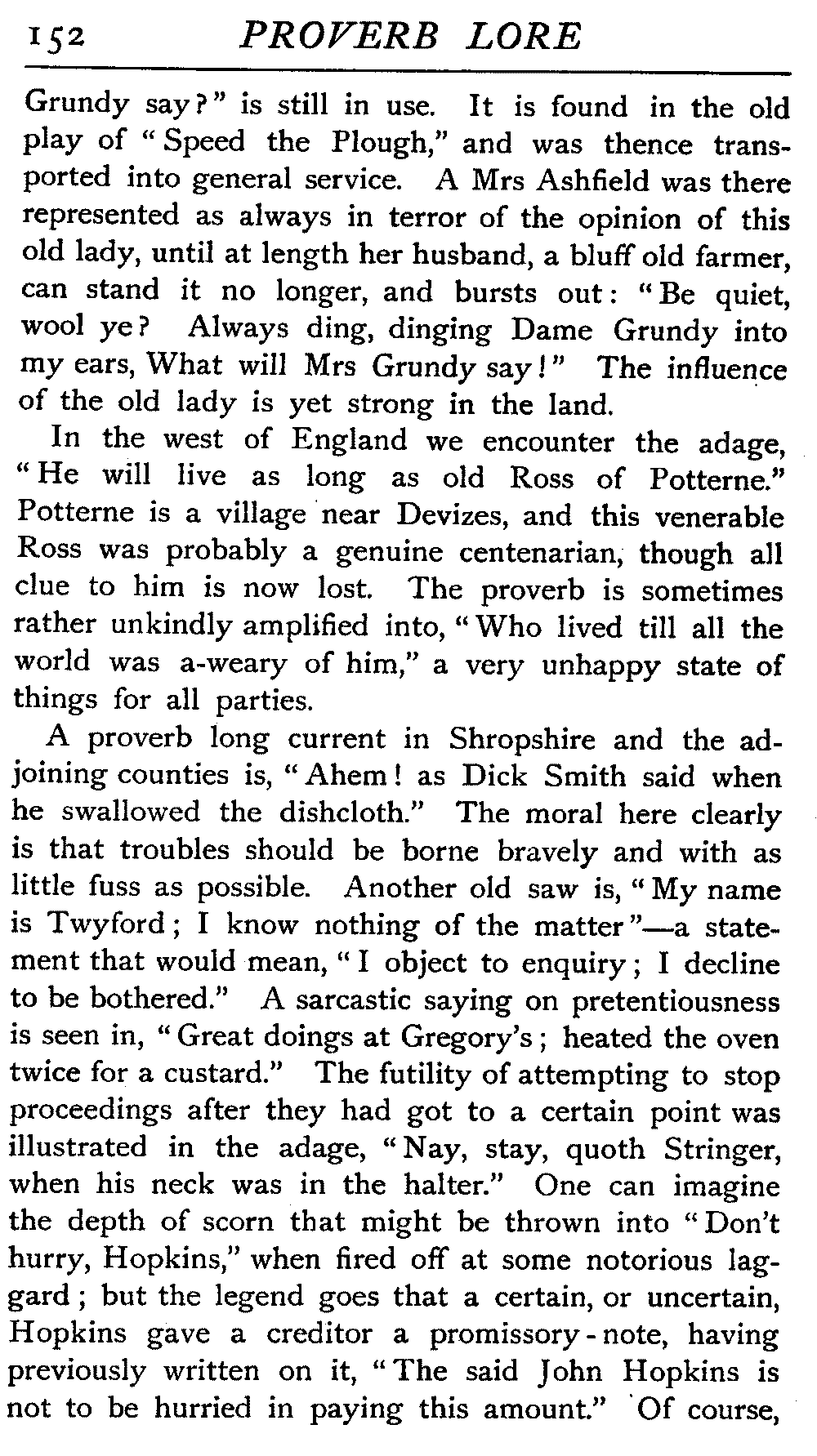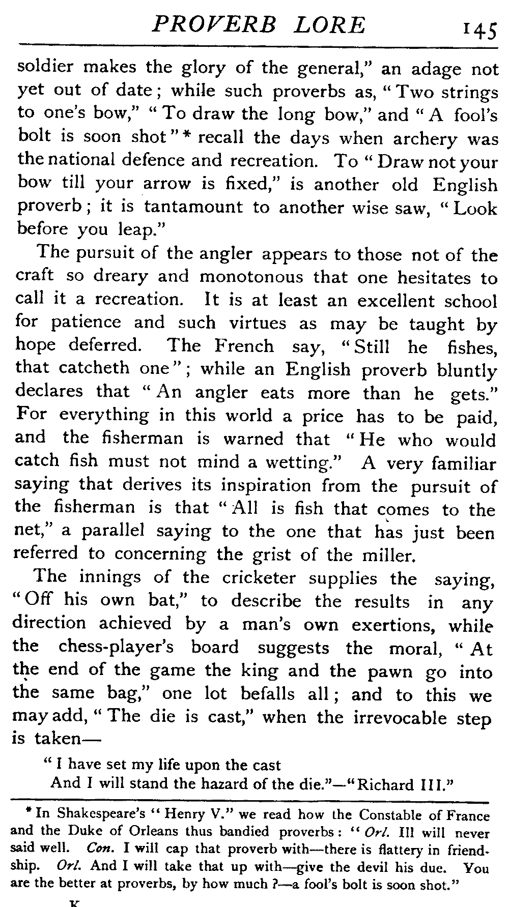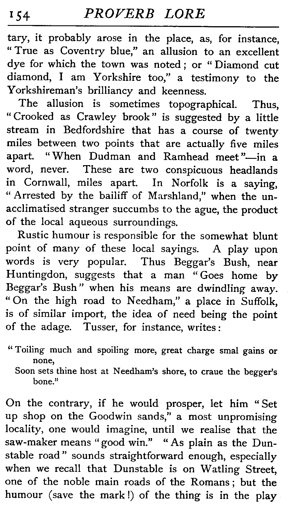 | Proverbs that are misunderstood—The Cheese—Raining Cats and Dogs—Cattle-harrying—The Bitter End—By Hook or Crook—Proverbs of Evil Teaching—Necessity has no Law—The Peck of Dirt—Howl with the Wolves—Sarcasm in Proverbs—The Fool—Selfishness—The Praise of Truth—The Value of Time—Death—The Conduct of Life—Occupations that supply Proverbs—The Barber, Tailor, Cobbler, Physician, Lawyer, and others—The Cowl and the Monk—The Long Bow—The Meditative Angler—Sayings associated with particular Individuals—Hobson and his Choice—Plowden's Law—Mortimer's Sow—The Wisdom of Doddipol—The Fear of Mrs Grundy's Opinion—Locality Proverbs—Rustic Humour—Local Products—Tenterden Steeple | 124 |