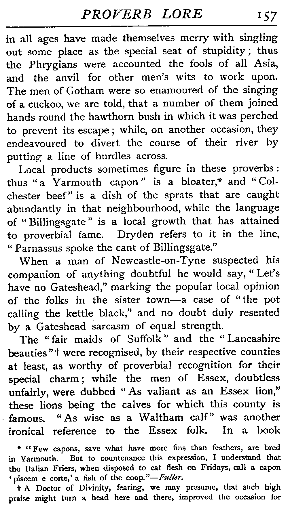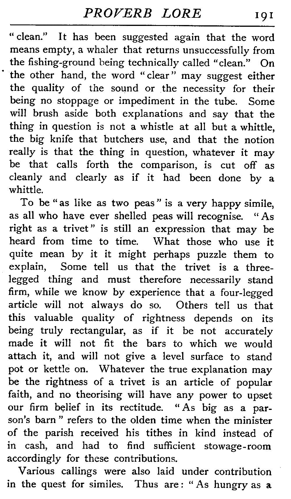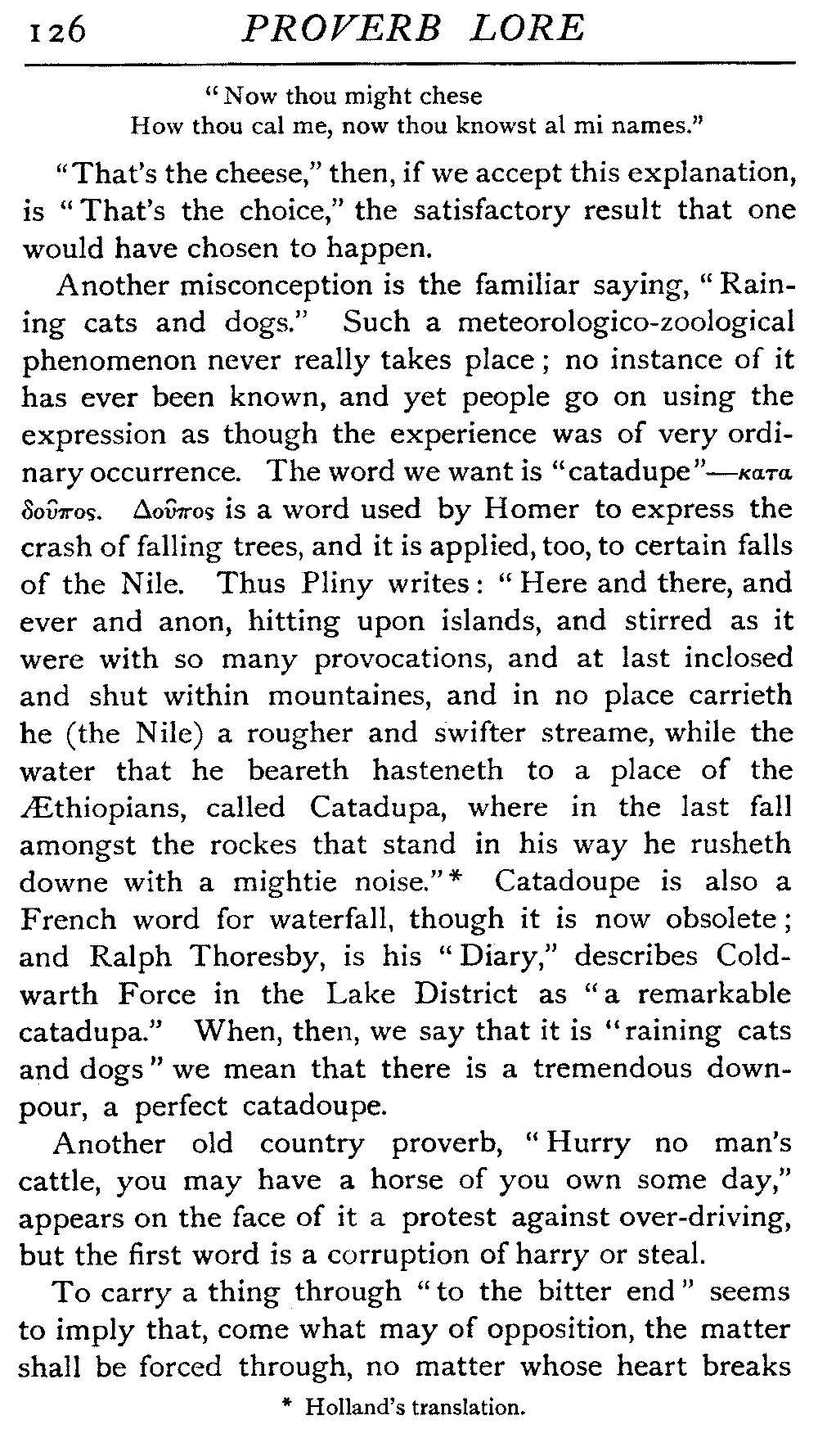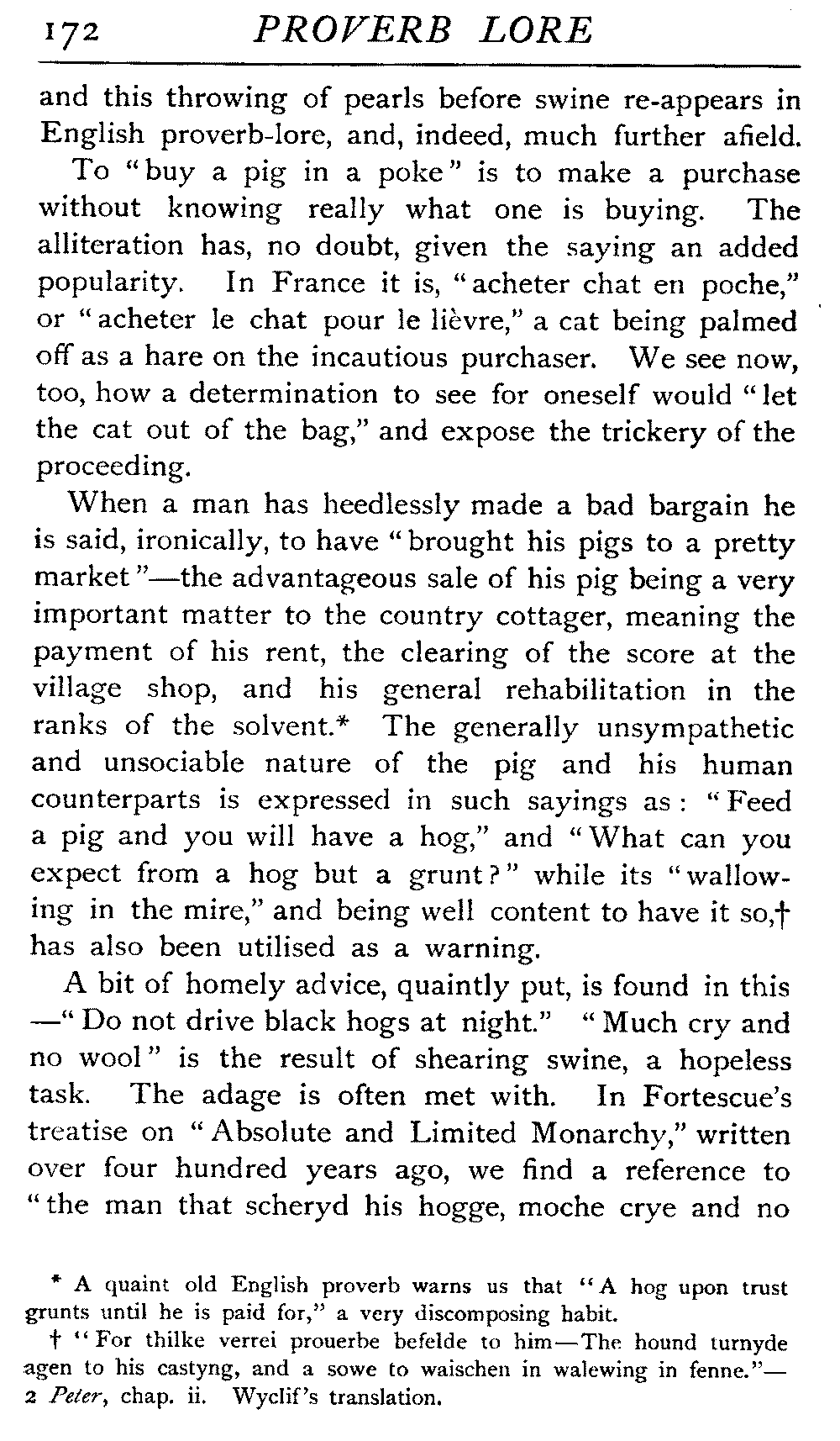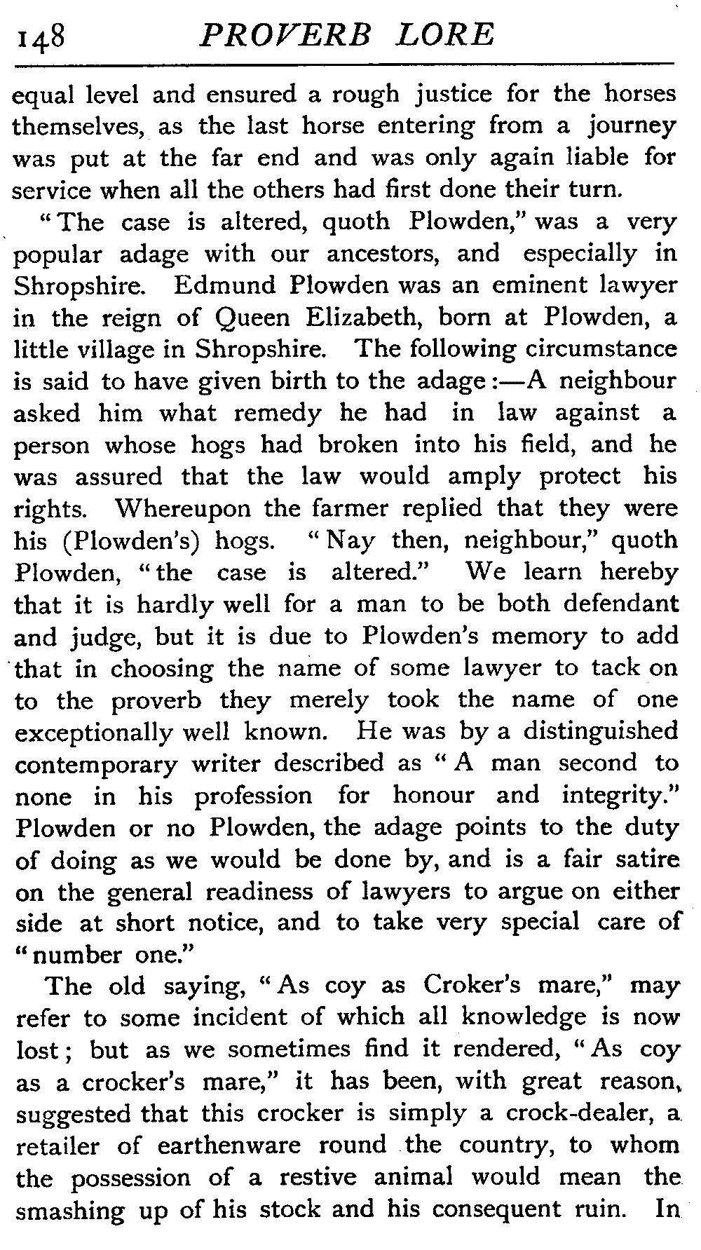 | Proverbs that are misunderstood—The Cheese—Raining Cats and Dogs—Cattle-harrying—The Bitter End—By Hook or Crook—Proverbs of Evil Teaching—Necessity has no Law—The Peck of Dirt—Howl with the Wolves—Sarcasm in Proverbs—The Fool—Selfishness—The Praise of Truth—The Value of Time—Death—The Conduct of Life—Occupations that supply Proverbs—The Barber, Tailor, Cobbler, Physician, Lawyer, and others—The Cowl and the Monk—The Long Bow—The Meditative Angler—Sayings associated with particular Individuals—Hobson and his Choice—Plowden's Law—Mortimer's Sow—The Wisdom of Doddipol—The Fear of Mrs Grundy's Opinion—Locality Proverbs—Rustic Humour—Local Products—Tenterden Steeple | 124 |