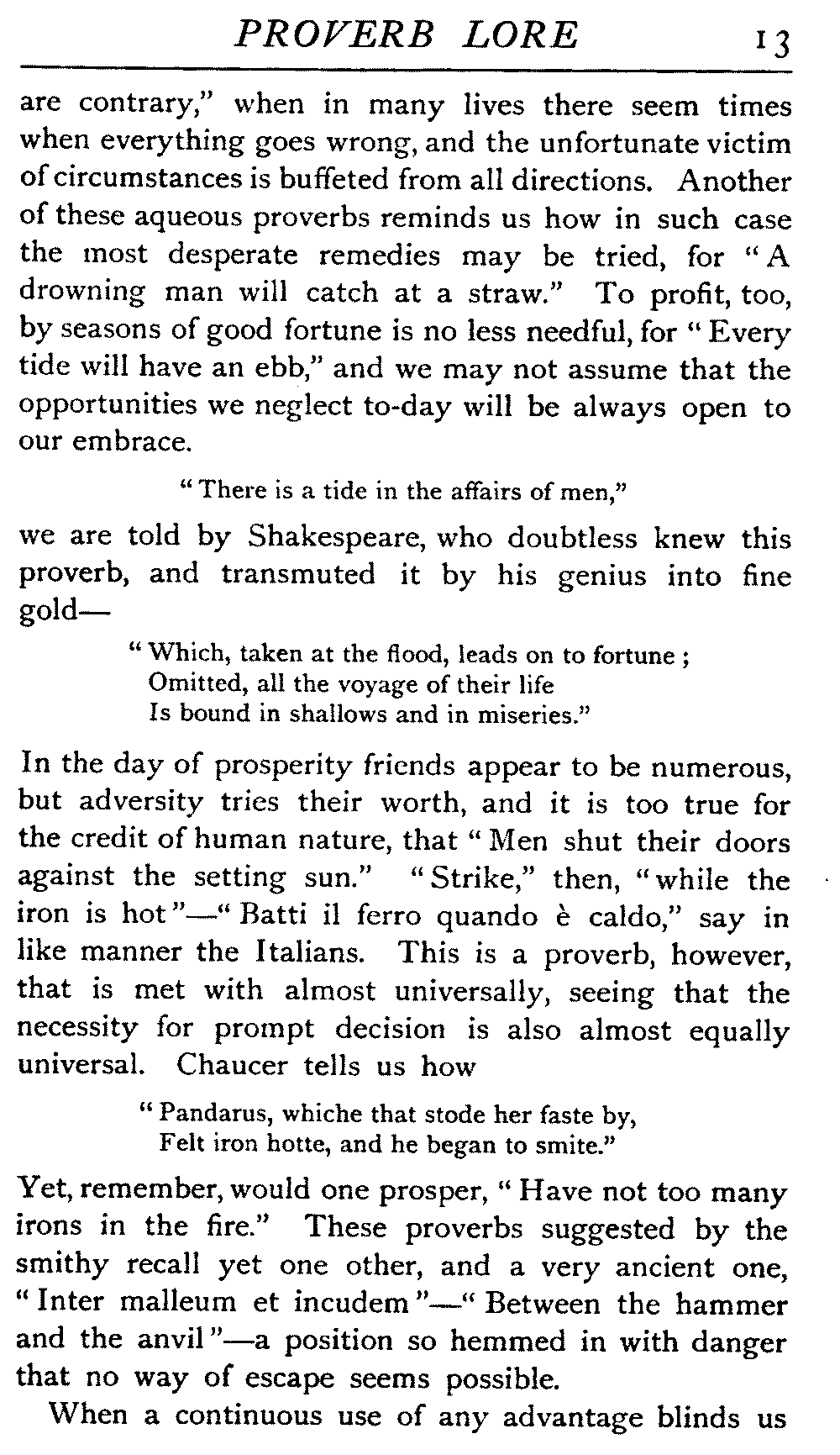 In the day of prosperity friends appear to be numerous, but adversity tries their worth, and it is too true for the credit of human nature, that "Men shut their doors against the setting sun." "Strike," then, "while the iron is hot"—"Batti il ferro quando è caldo," say in like manner the Italians. This is a proverb, however, that is met with almost universally, seeing that the necessity for prompt decision is also almost equally universal. Chaucer tells us how