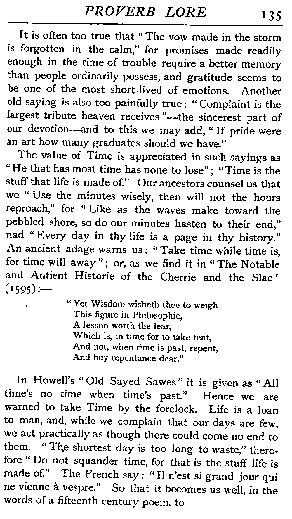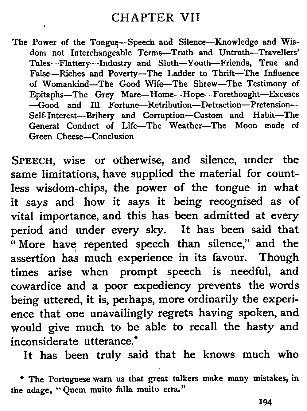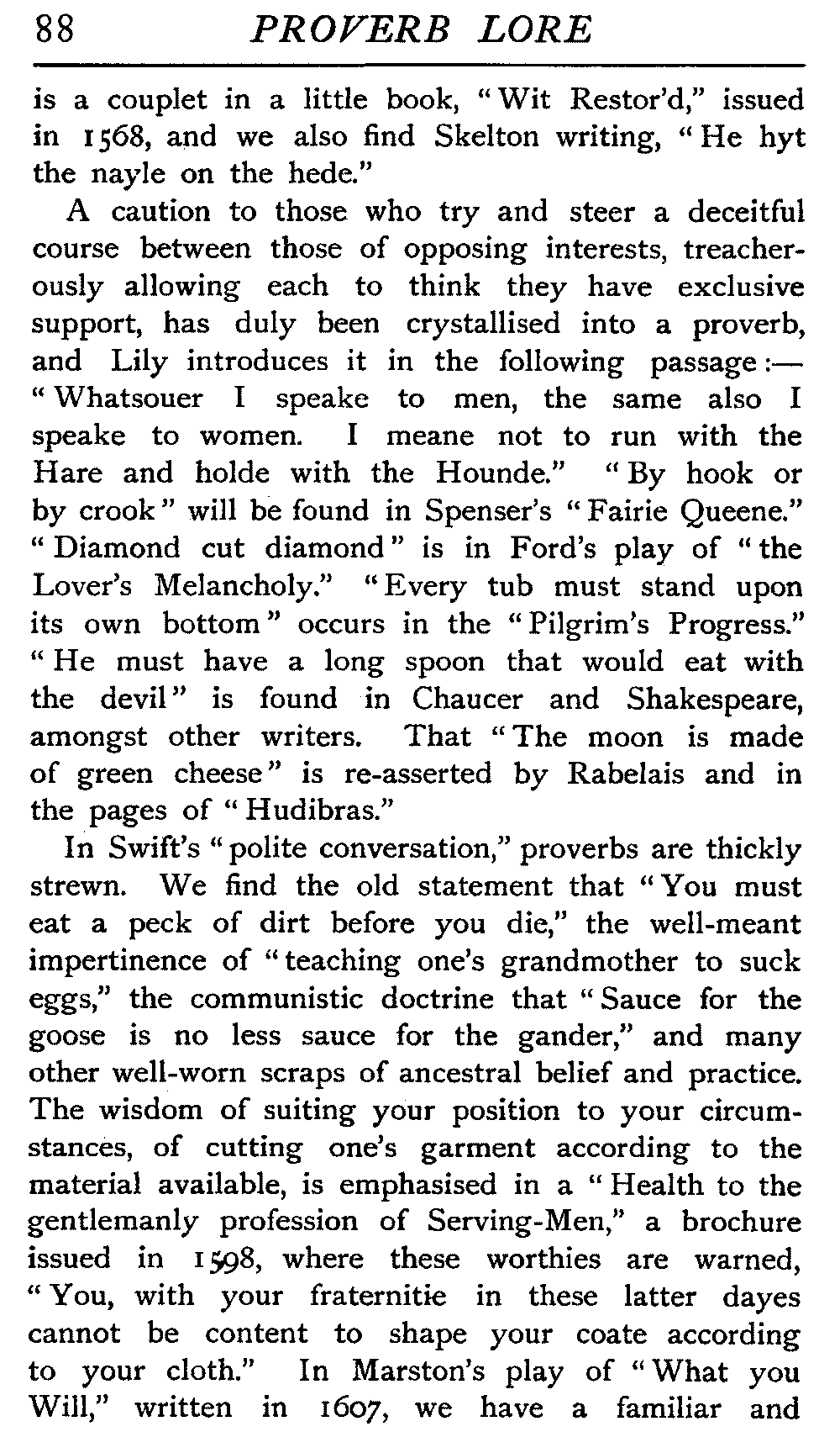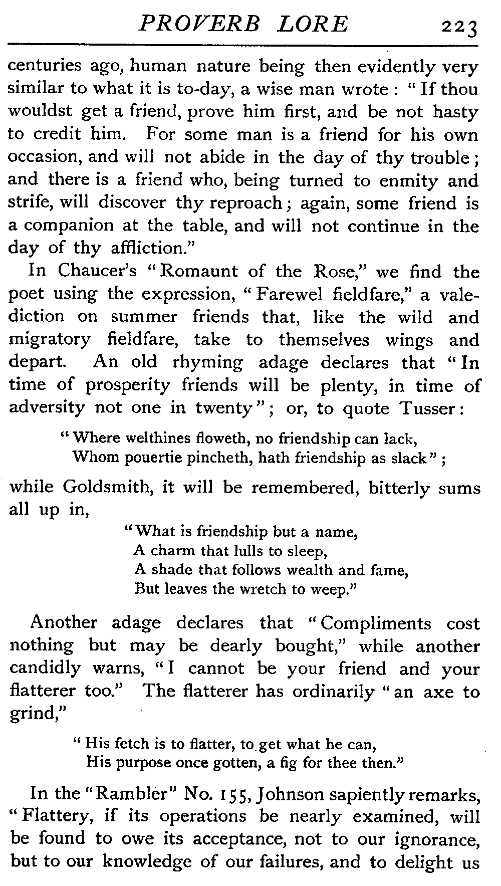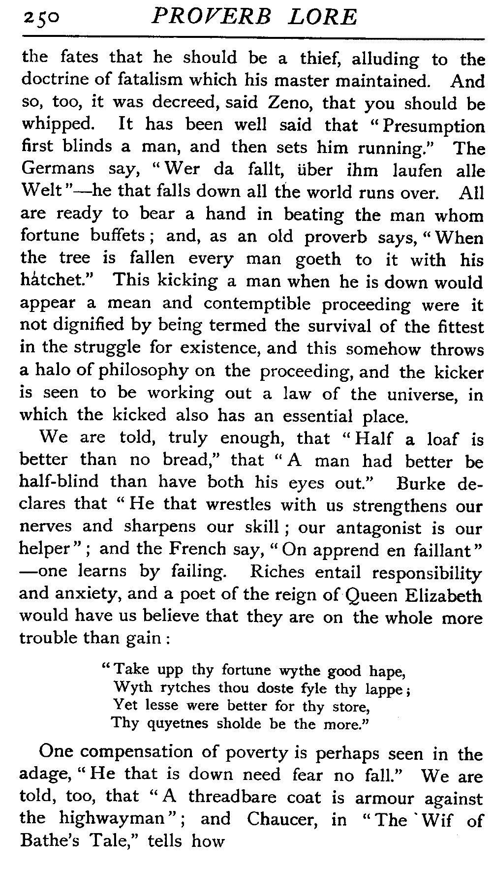 | The Power of the Tongue—Speech and Silence—Knowledge and Wisdom not Interchangeable Terms—Truth and Untruth—Travellers' Tales—Flattery—Industry and Sloth—Youth—Friends, True and False—Riches and Poverty—The Ladder to Thrift—The Influence of Womankind—The Good Wife—The Shrew—The Testimony of Epitaphs—The Grey Mare—Home—Hope—Forethought—Excuses—Good and Ill Fortune—Retribution—Detraction—Pretension—Self-interest—Bribery and Corruption—Custom and Habit—The general Conduct of Life—The Weather—The Moon made of Green Cheese—Conclusion | 194 |