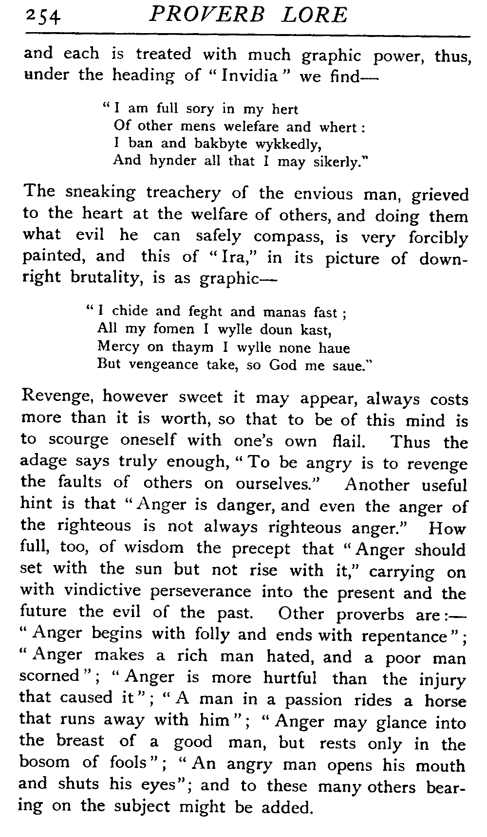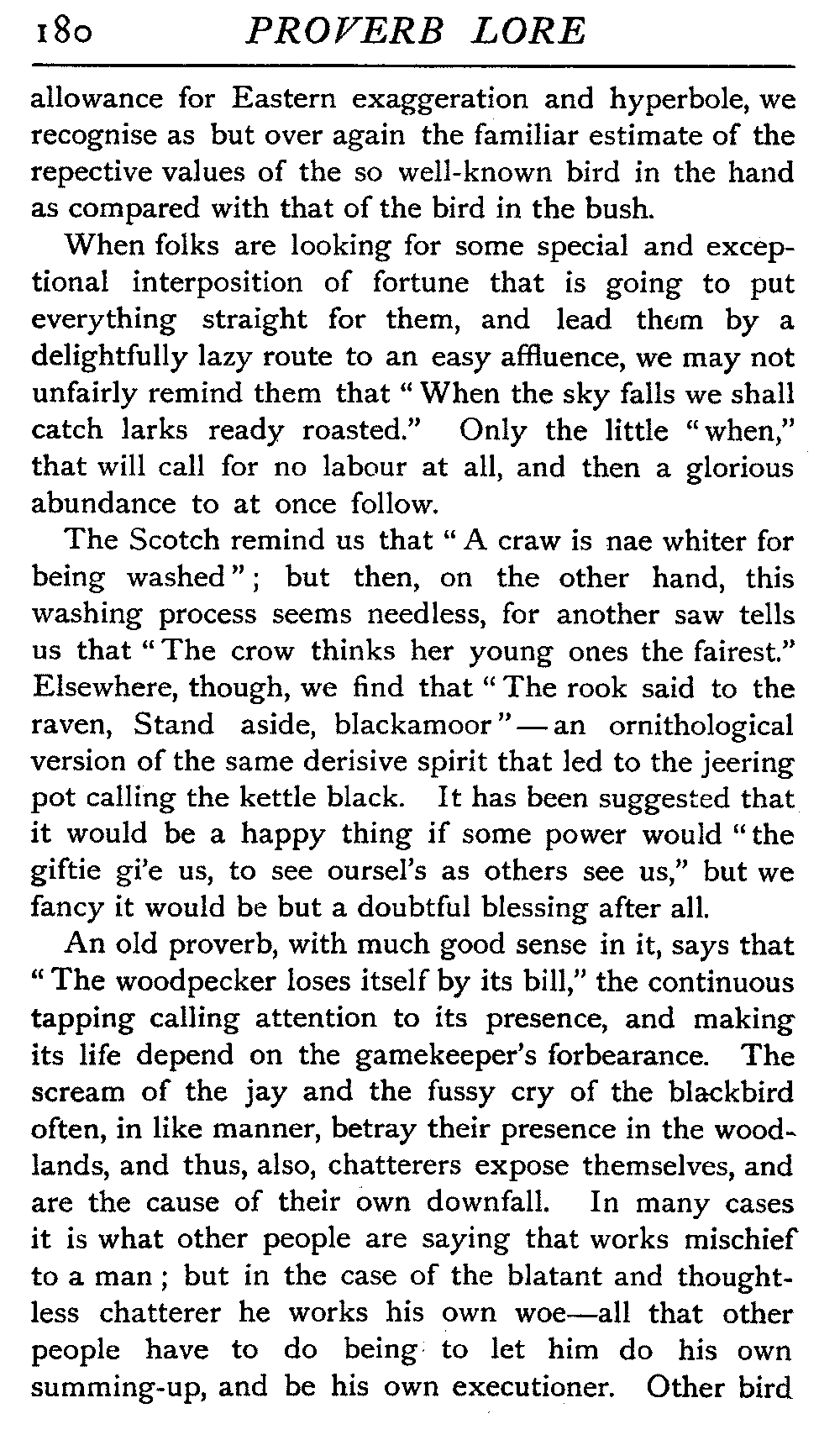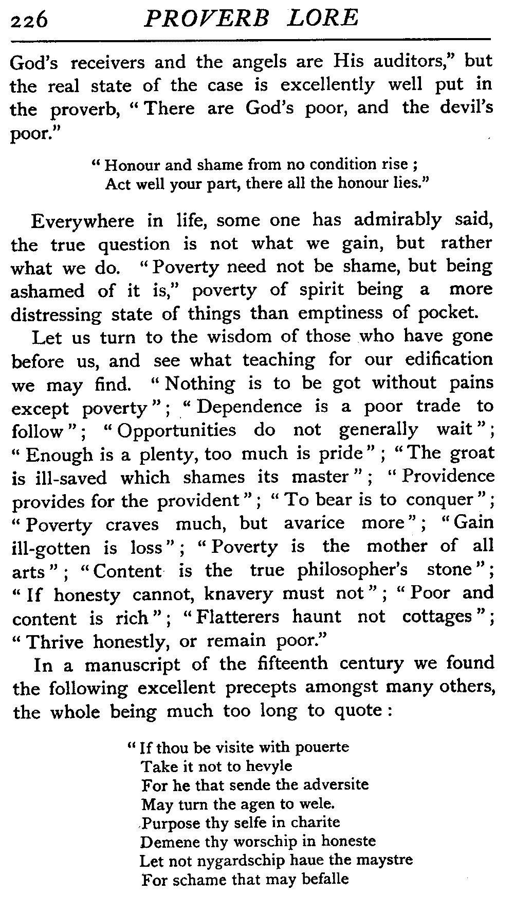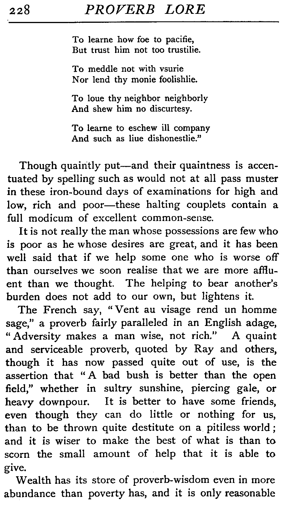 | The Power of the Tongue—Speech and Silence—Knowledge and Wisdom not Interchangeable Terms—Truth and Untruth—Travellers' Tales—Flattery—Industry and Sloth—Youth—Friends, True and False—Riches and Poverty—The Ladder to Thrift—The Influence of Womankind—The Good Wife—The Shrew—The Testimony of Epitaphs—The Grey Mare—Home—Hope—Forethought—Excuses—Good and Ill Fortune—Retribution—Detraction—Pretension—Self-interest—Bribery and Corruption—Custom and Habit—The general Conduct of Life—The Weather—The Moon made of Green Cheese—Conclusion | 194 |