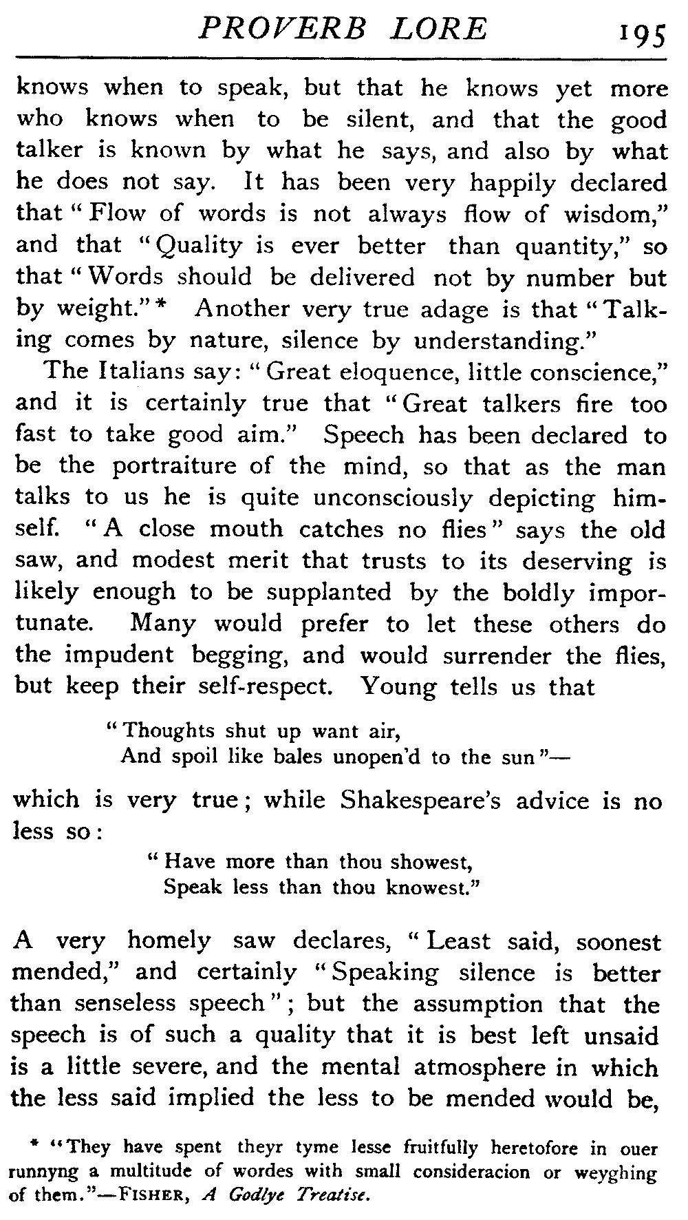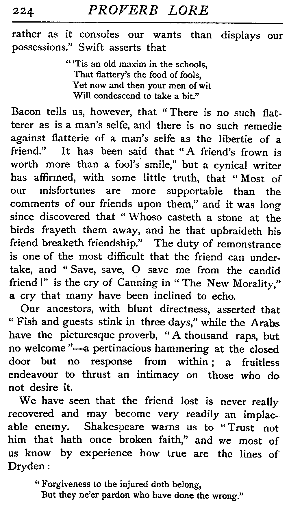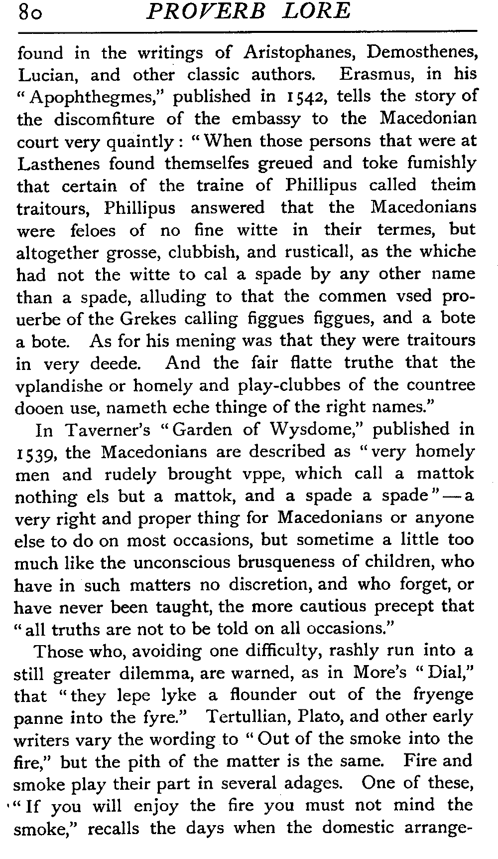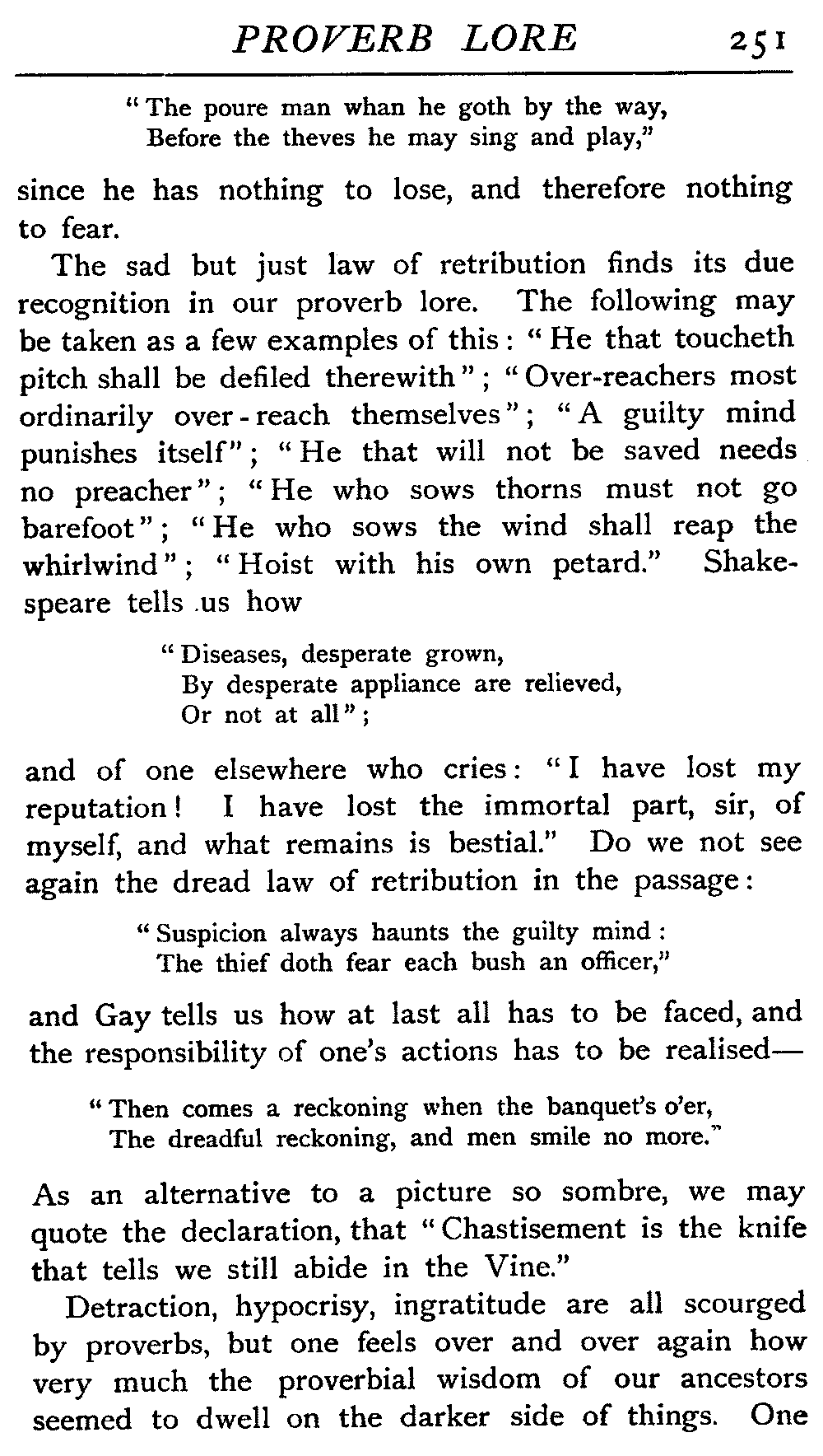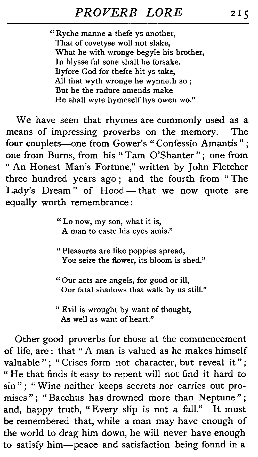 | The Power of the Tongue—Speech and Silence—Knowledge and Wisdom not Interchangeable Terms—Truth and Untruth—Travellers' Tales—Flattery—Industry and Sloth—Youth—Friends, True and False—Riches and Poverty—The Ladder to Thrift—The Influence of Womankind—The Good Wife—The Shrew—The Testimony of Epitaphs—The Grey Mare—Home—Hope—Forethought—Excuses—Good and Ill Fortune—Retribution—Detraction—Pretension—Self-interest—Bribery and Corruption—Custom and Habit—The general Conduct of Life—The Weather—The Moon made of Green Cheese—Conclusion | 194 |