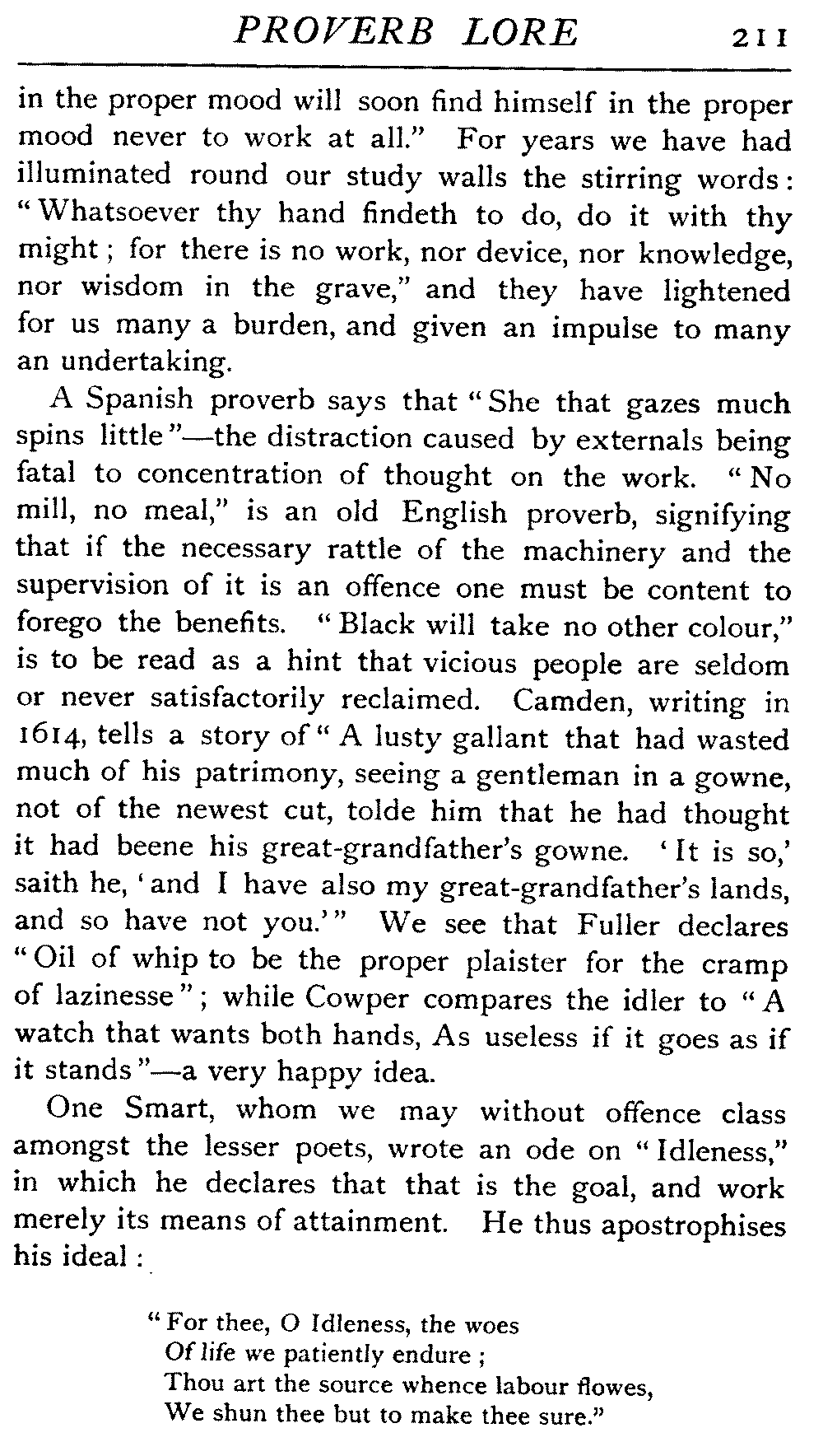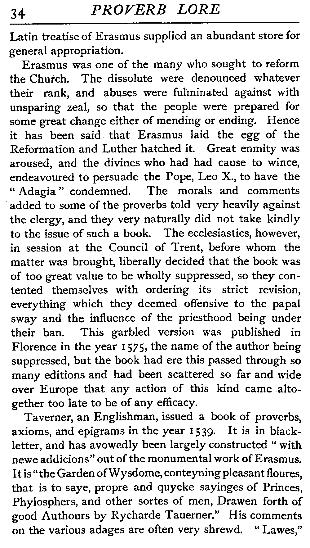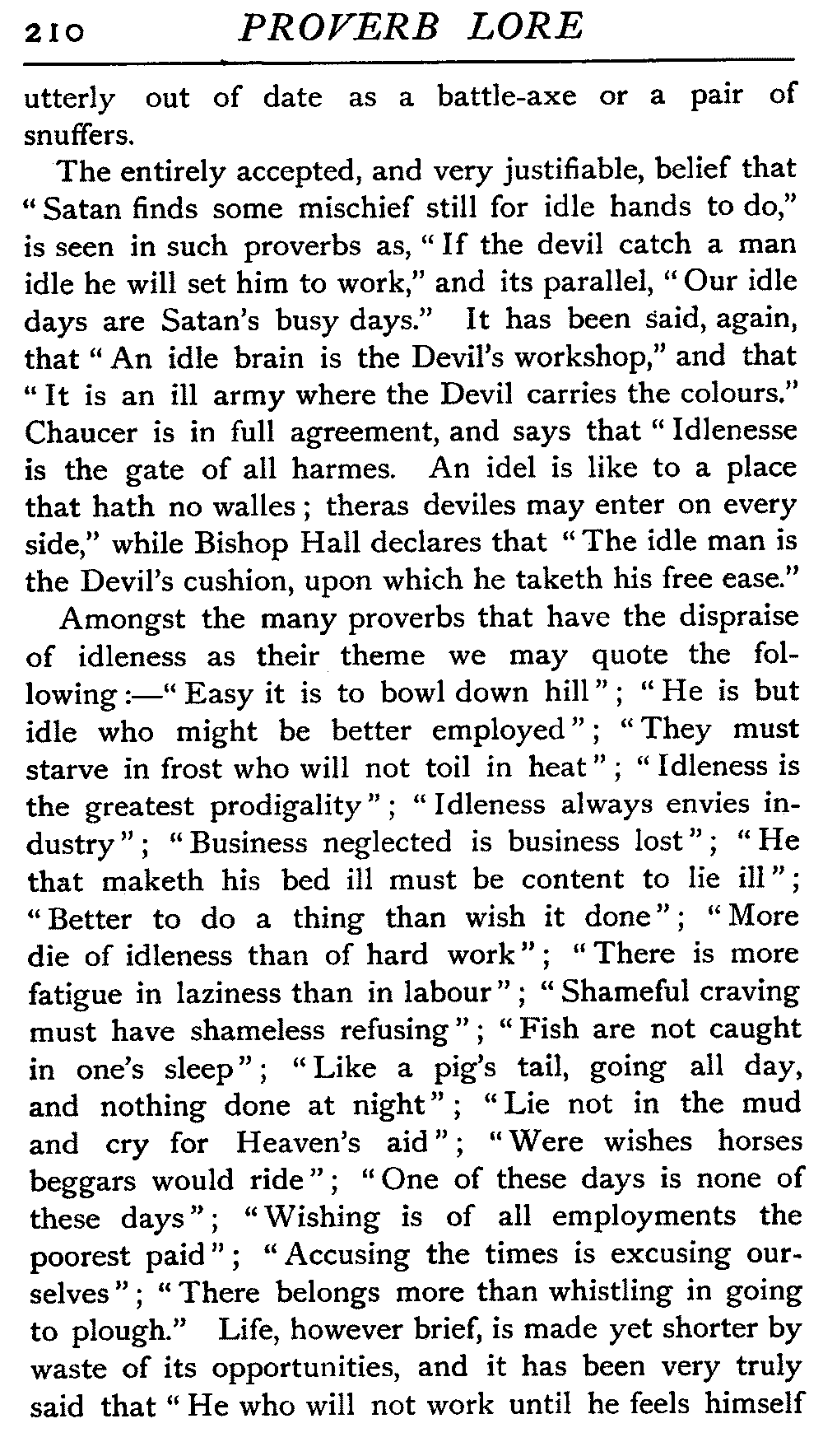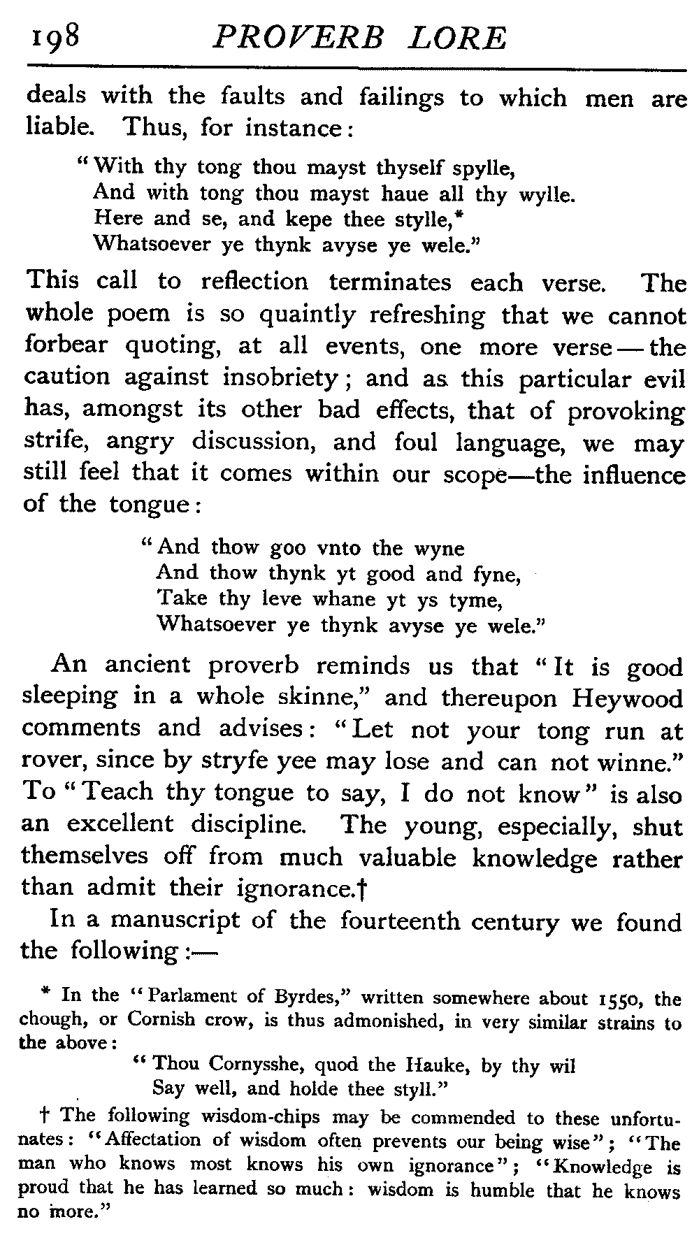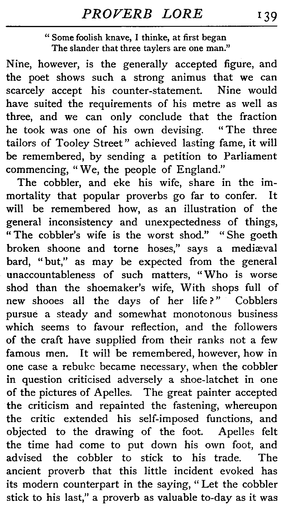 | The Power of the Tongue—Speech and Silence—Knowledge and Wisdom not Interchangeable Terms—Truth and Untruth—Travellers' Tales—Flattery—Industry and Sloth—Youth—Friends, True and False—Riches and Poverty—The Ladder to Thrift—The Influence of Womankind—The Good Wife—The Shrew—The Testimony of Epitaphs—The Grey Mare—Home—Hope—Forethought—Excuses—Good and Ill Fortune—Retribution—Detraction—Pretension—Self-interest—Bribery and Corruption—Custom and Habit—The general Conduct of Life—The Weather—The Moon made of Green Cheese—Conclusion | 194 |