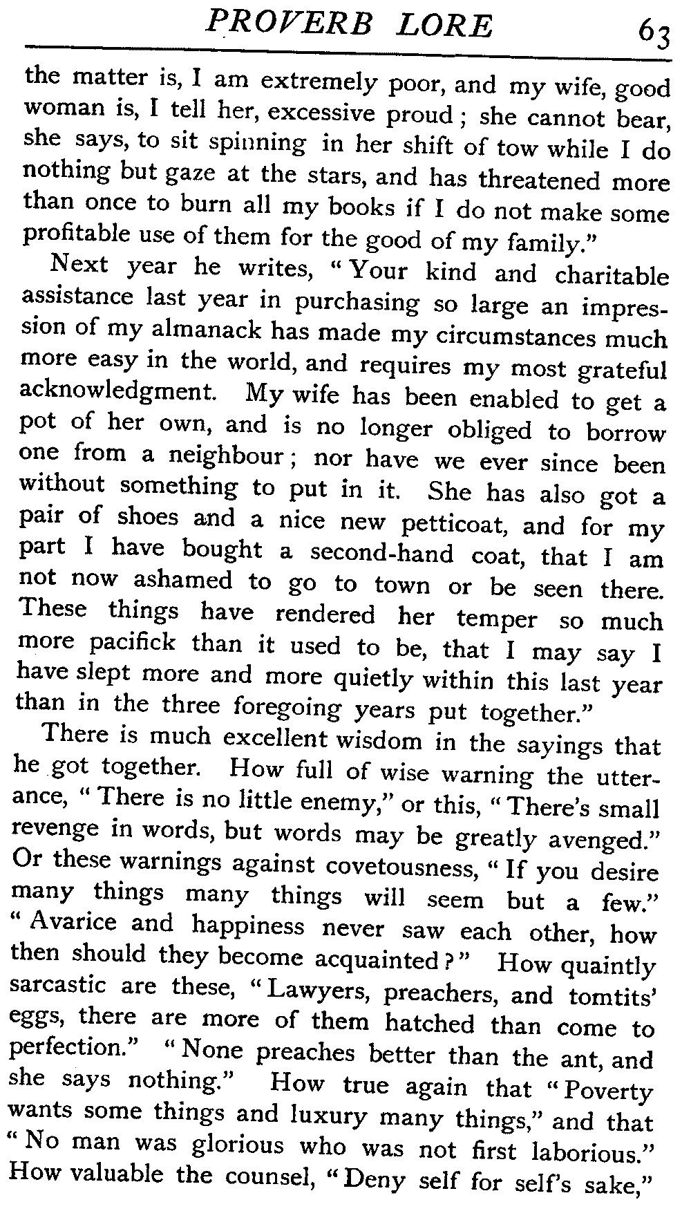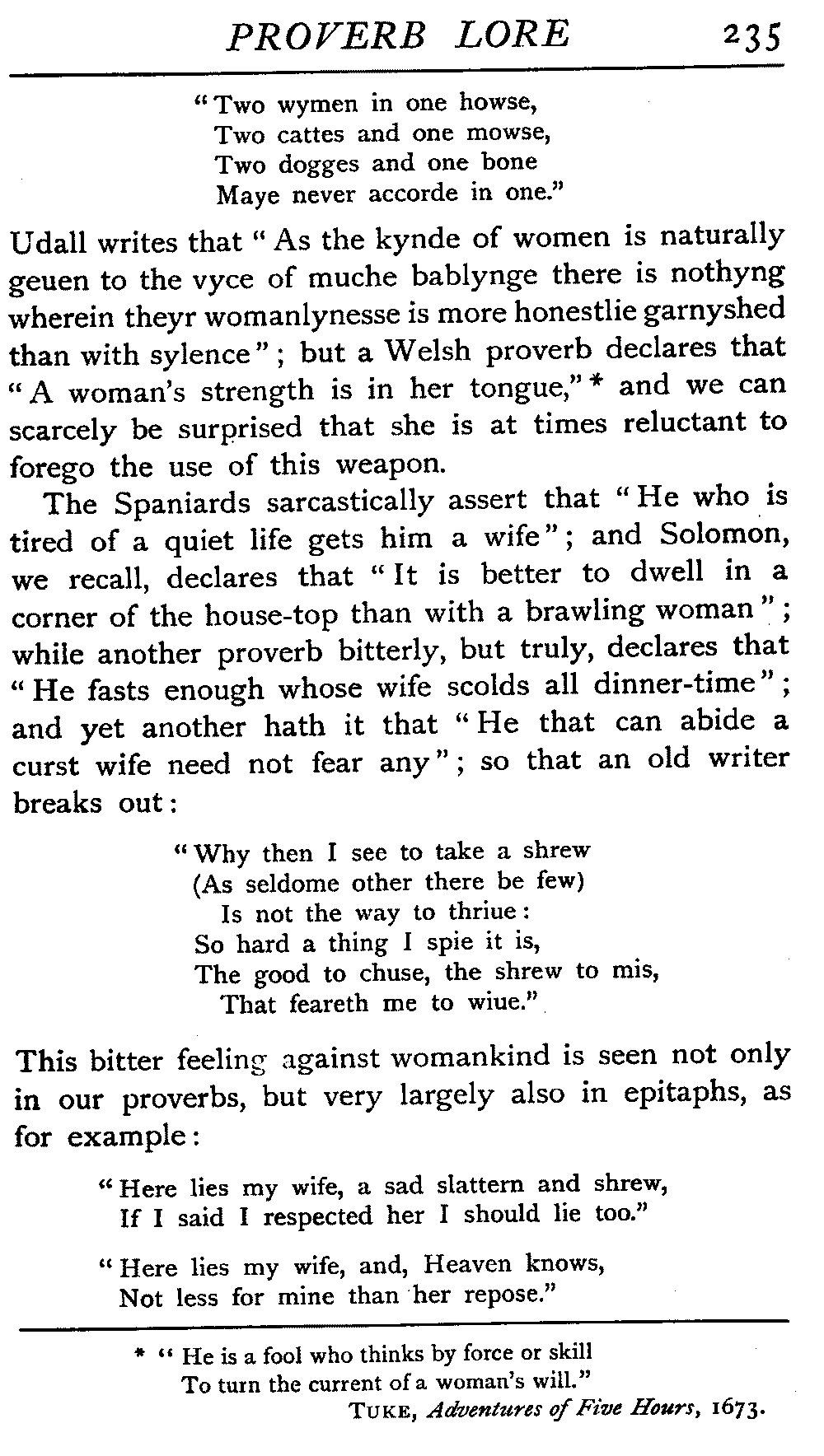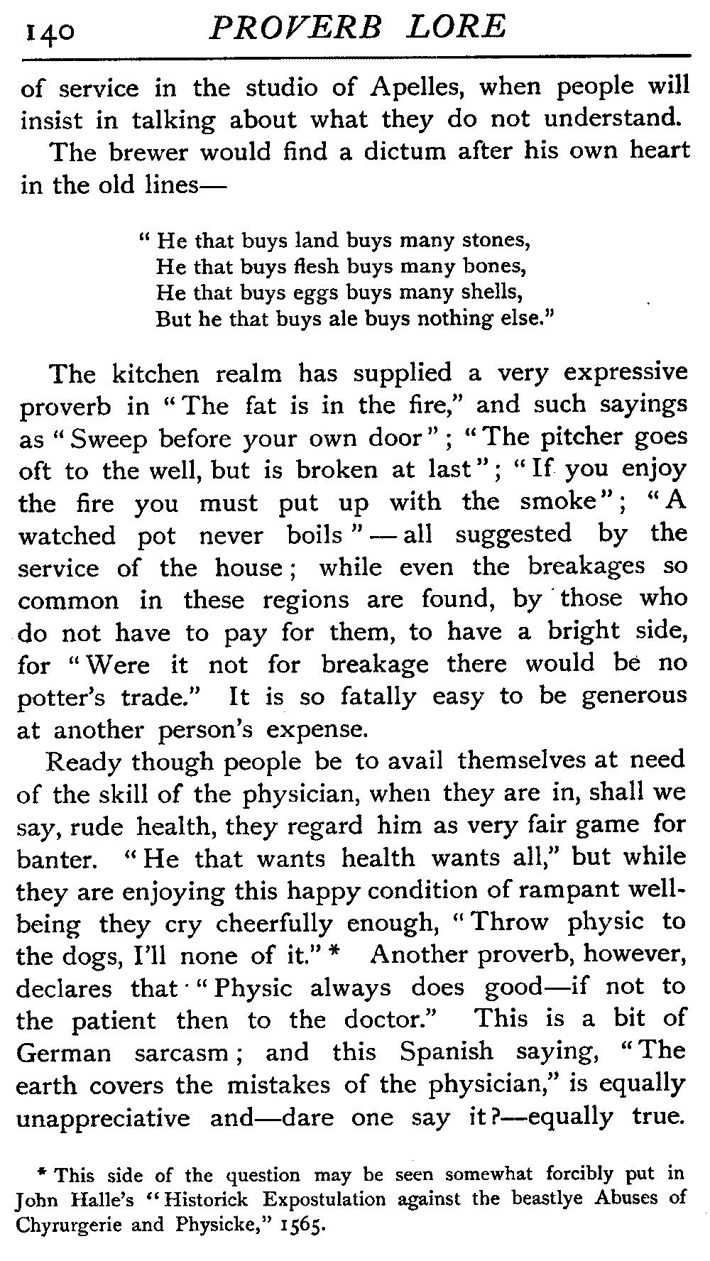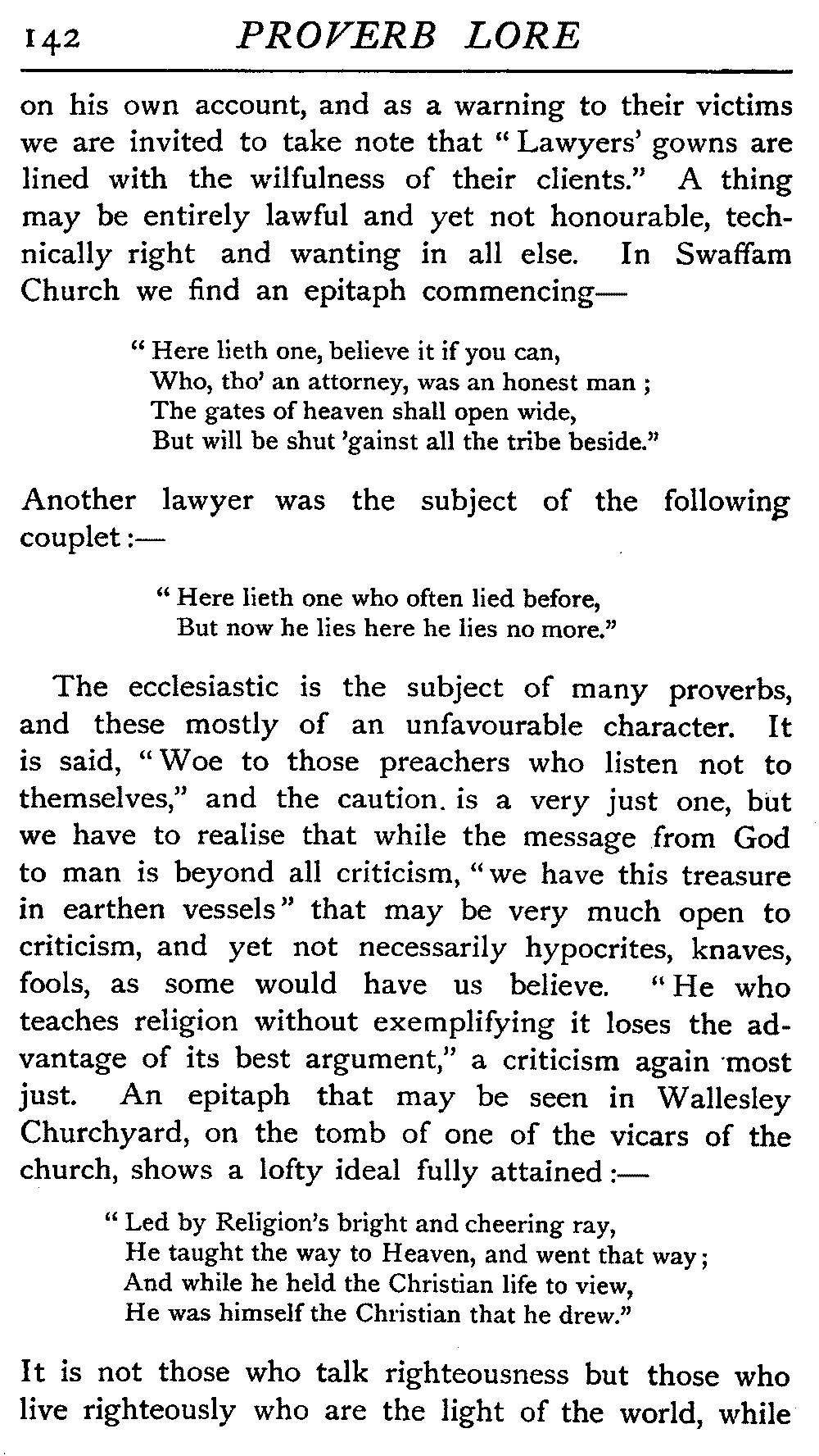 | The Power of the Tongue—Speech and Silence—Knowledge and Wisdom not Interchangeable Terms—Truth and Untruth—Travellers' Tales—Flattery—Industry and Sloth—Youth—Friends, True and False—Riches and Poverty—The Ladder to Thrift—The Influence of Womankind—The Good Wife—The Shrew—The Testimony of Epitaphs—The Grey Mare—Home—Hope—Forethought—Excuses—Good and Ill Fortune—Retribution—Detraction—Pretension—Self-interest—Bribery and Corruption—Custom and Habit—The general Conduct of Life—The Weather—The Moon made of Green Cheese—Conclusion | 194 |