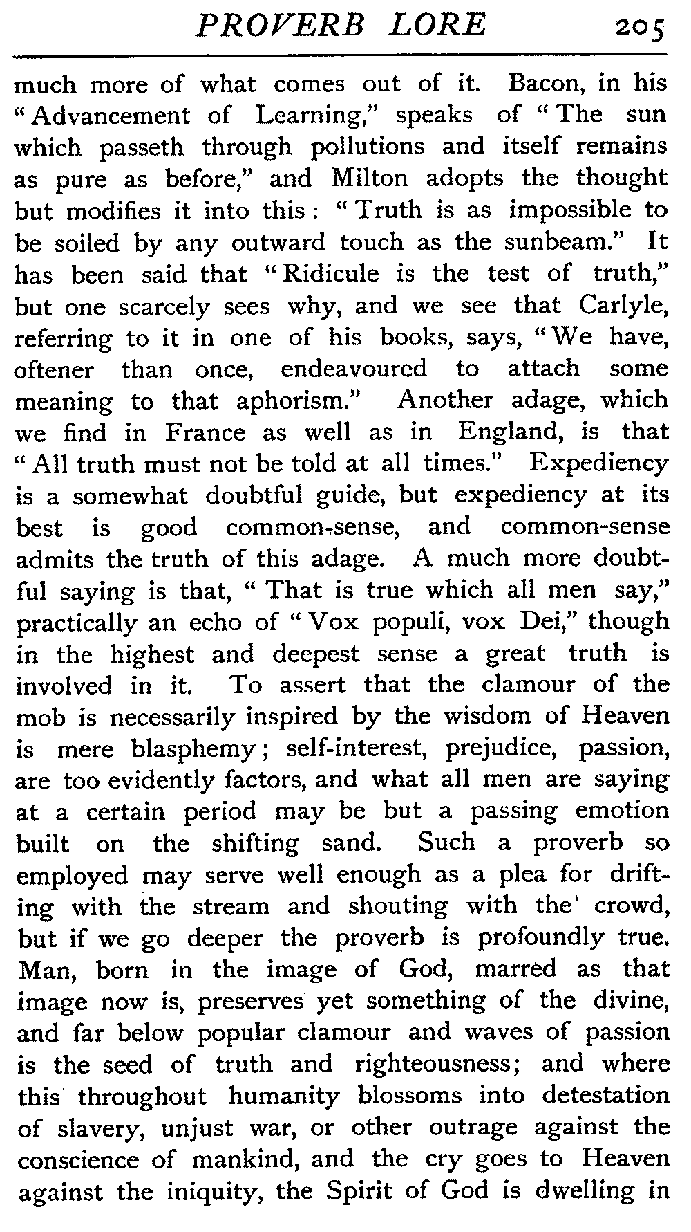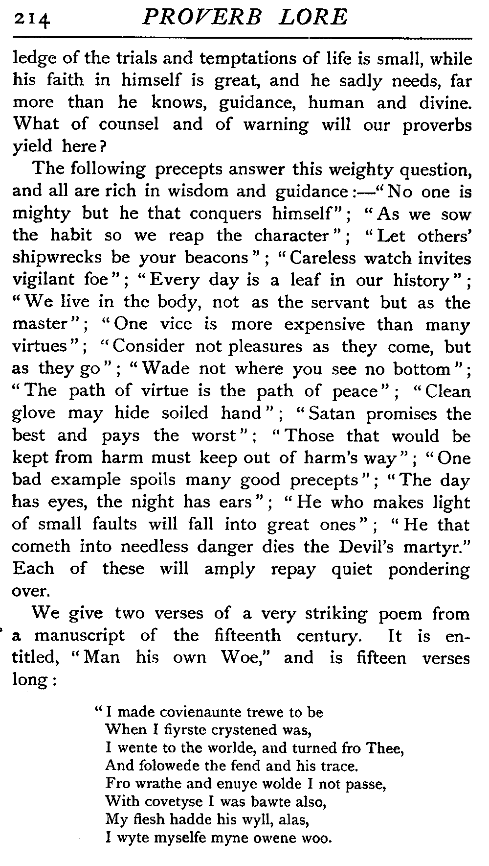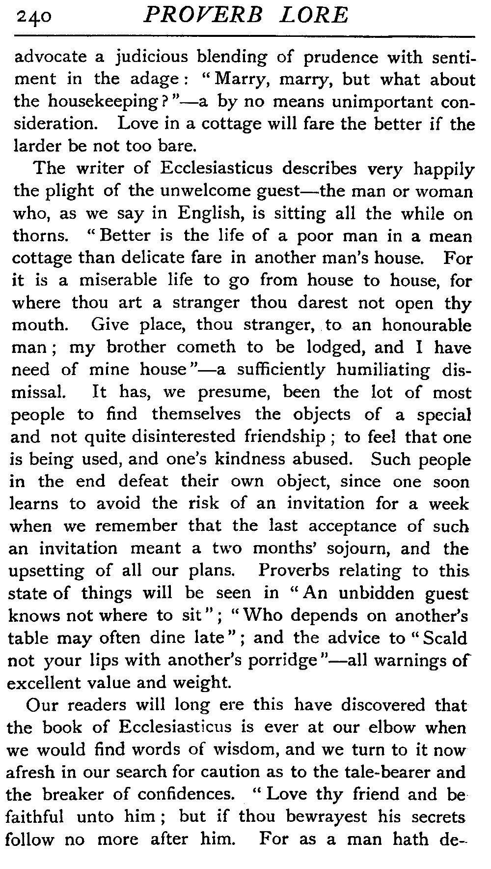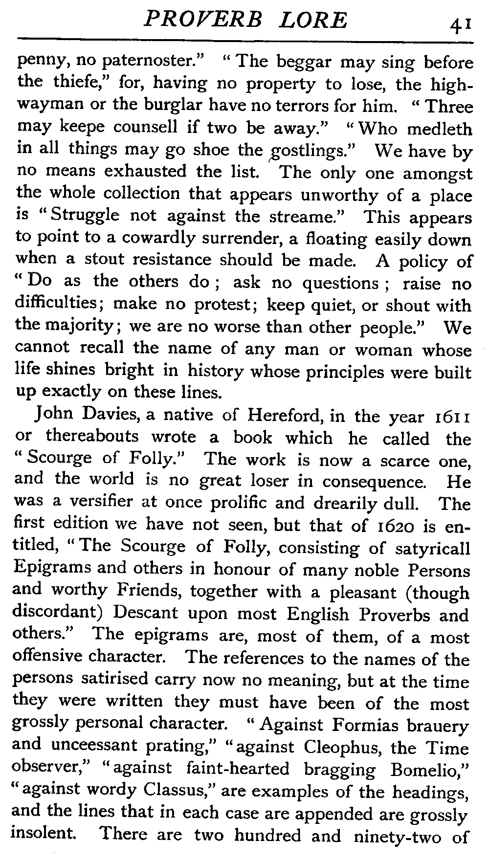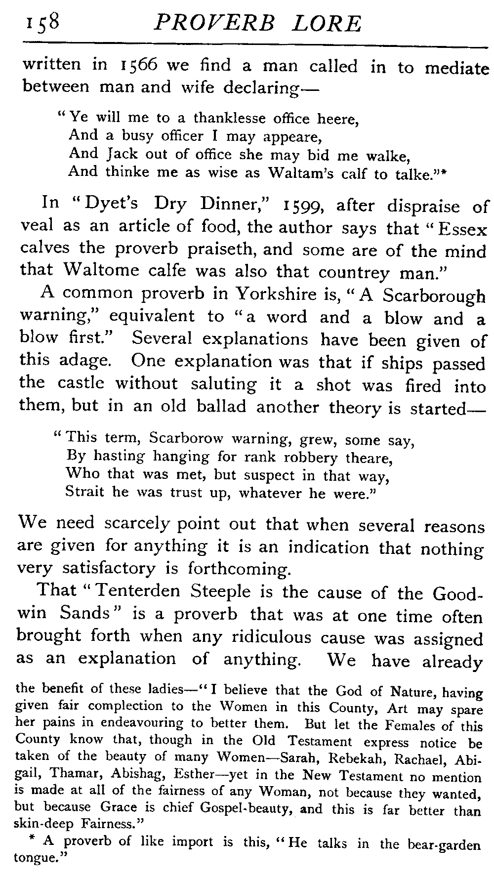 | The Power of the Tongue—Speech and Silence—Knowledge and Wisdom not Interchangeable Terms—Truth and Untruth—Travellers' Tales—Flattery—Industry and Sloth—Youth—Friends, True and False—Riches and Poverty—The Ladder to Thrift—The Influence of Womankind—The Good Wife—The Shrew—The Testimony of Epitaphs—The Grey Mare—Home—Hope—Forethought—Excuses—Good and Ill Fortune—Retribution—Detraction—Pretension—Self-interest—Bribery and Corruption—Custom and Habit—The general Conduct of Life—The Weather—The Moon made of Green Cheese—Conclusion | 194 |