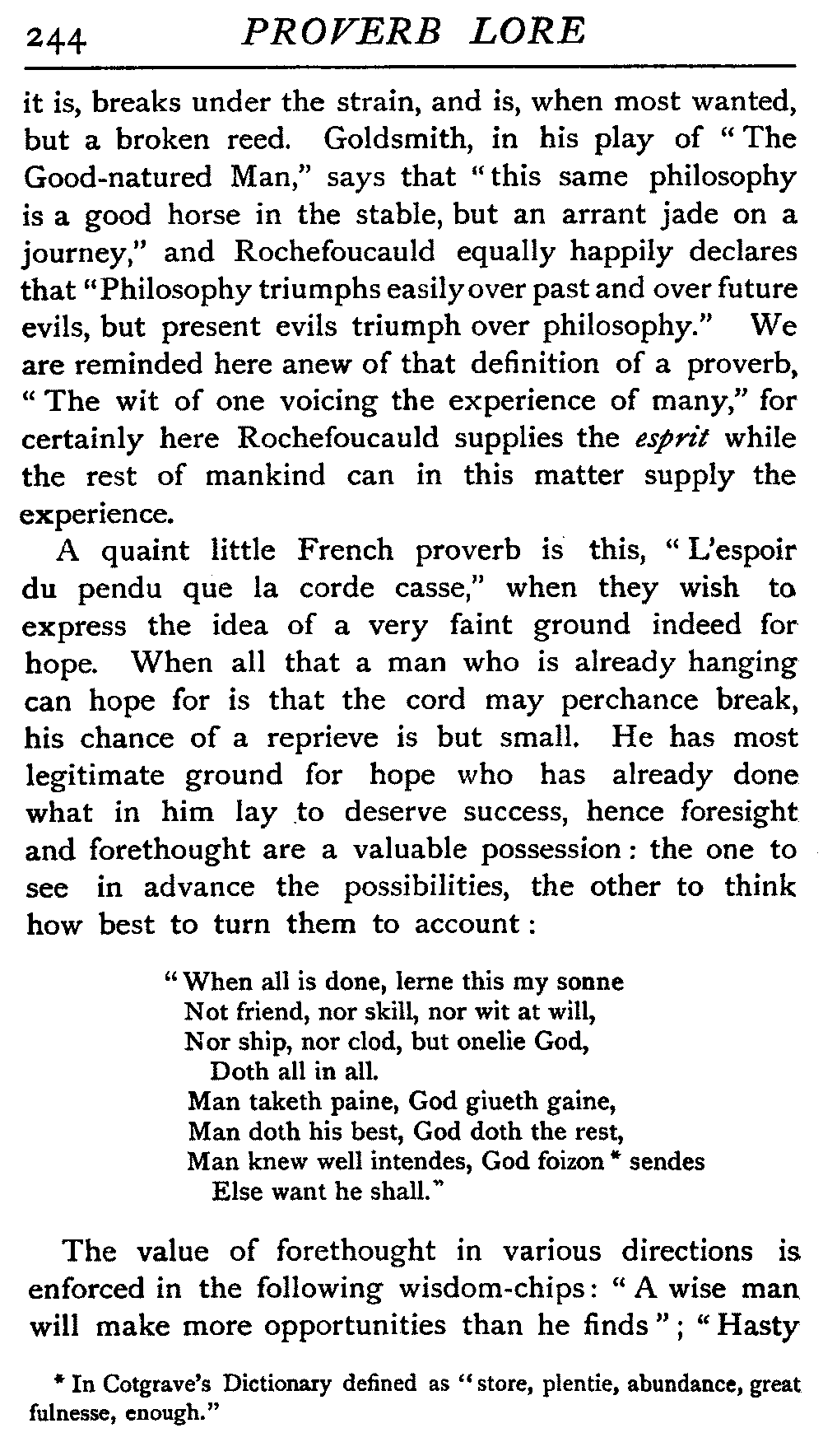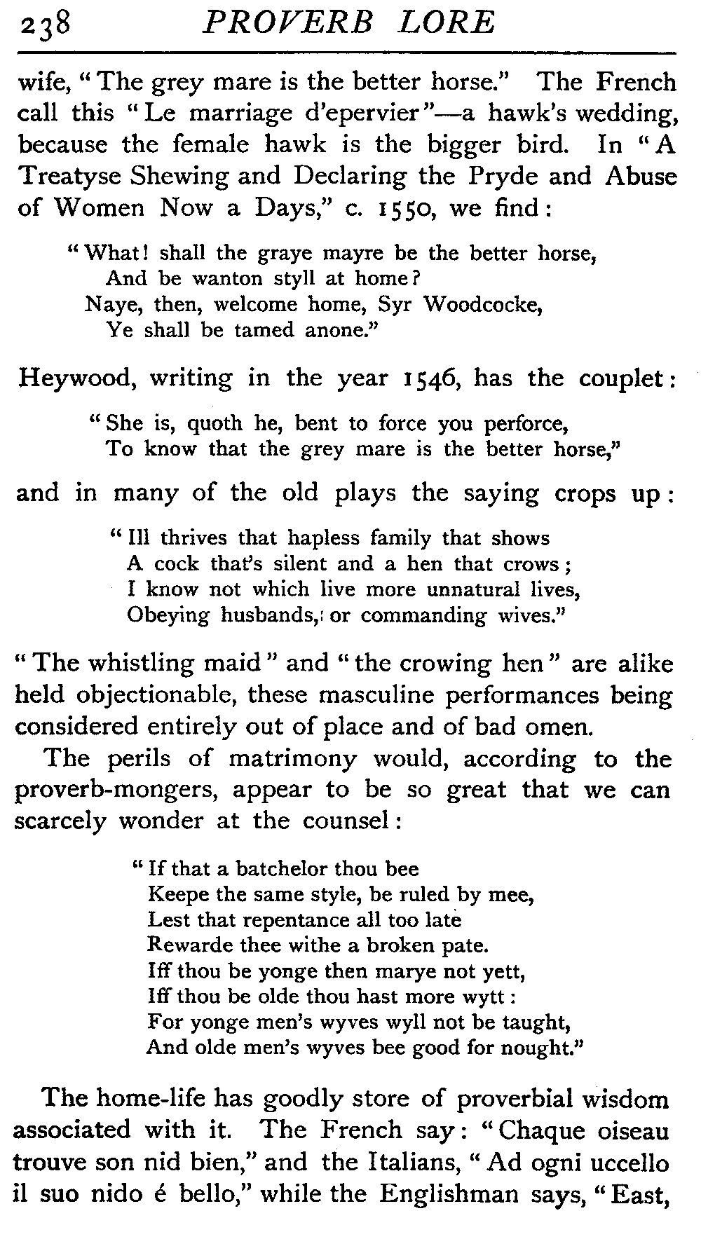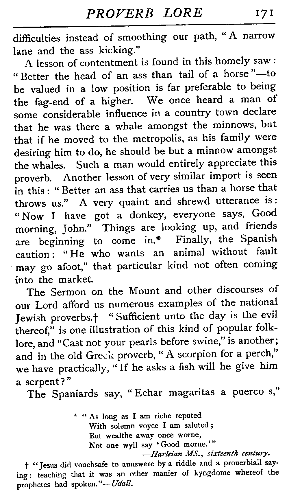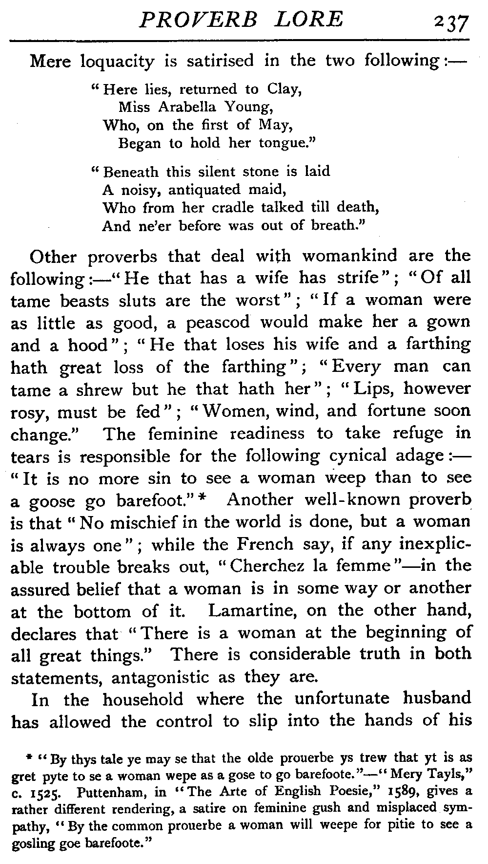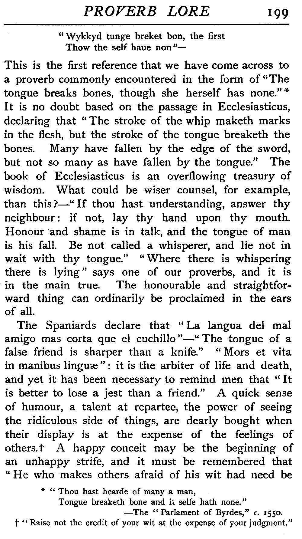 | The Power of the Tongue—Speech and Silence—Knowledge and Wisdom not Interchangeable Terms—Truth and Untruth—Travellers' Tales—Flattery—Industry and Sloth—Youth—Friends, True and False—Riches and Poverty—The Ladder to Thrift—The Influence of Womankind—The Good Wife—The Shrew—The Testimony of Epitaphs—The Grey Mare—Home—Hope—Forethought—Excuses—Good and Ill Fortune—Retribution—Detraction—Pretension—Self-interest—Bribery and Corruption—Custom and Habit—The general Conduct of Life—The Weather—The Moon made of Green Cheese—Conclusion | 194 |