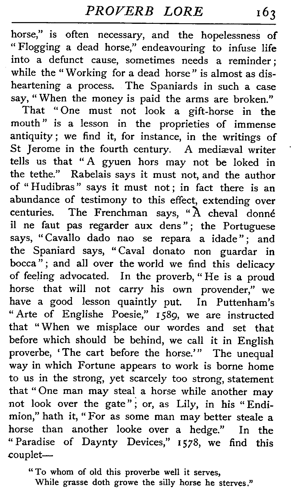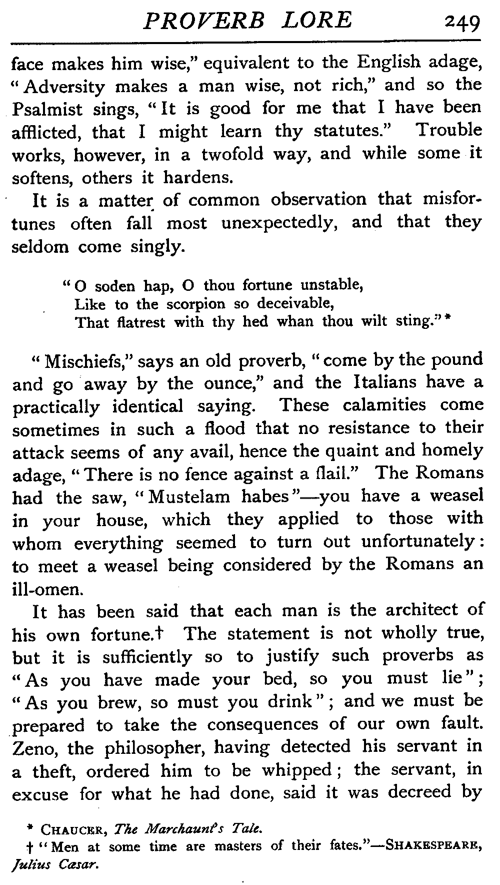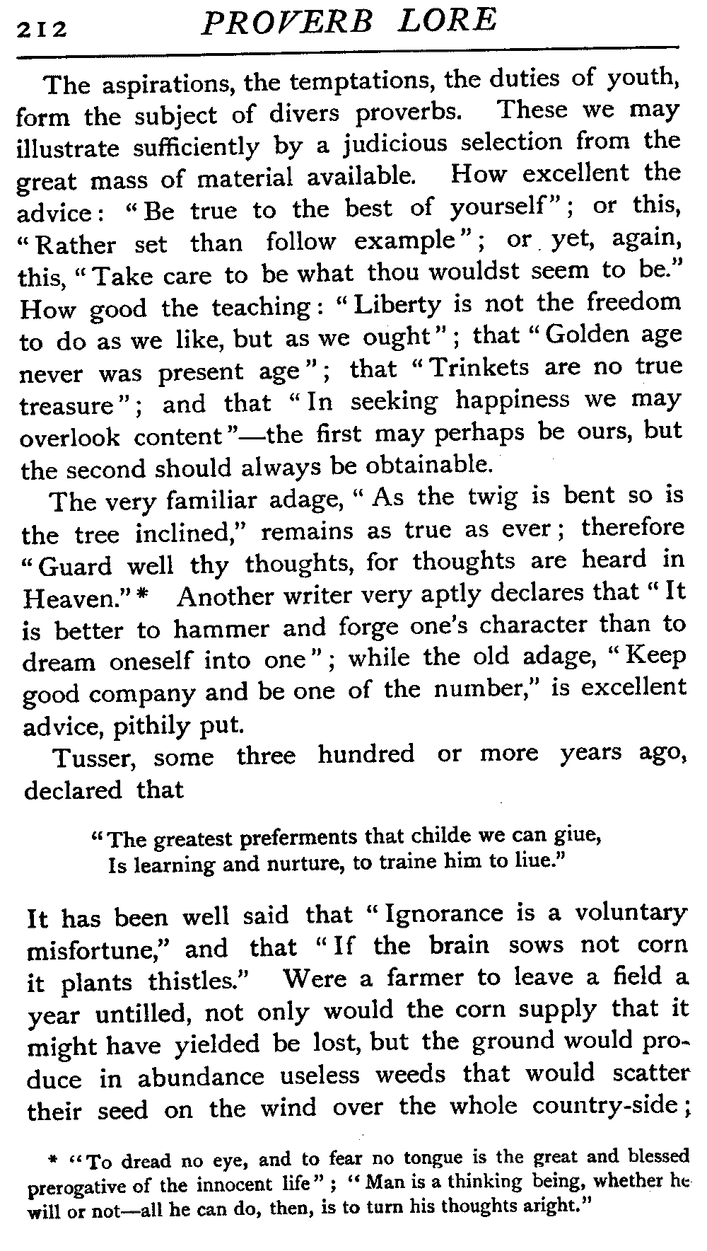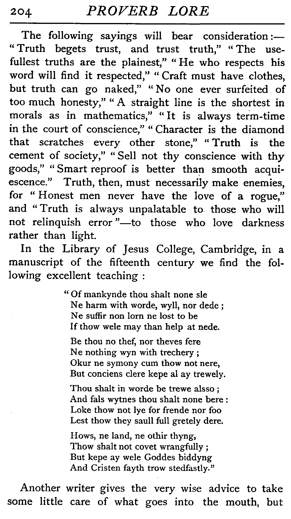 | The Power of the Tongue—Speech and Silence—Knowledge and Wisdom not Interchangeable Terms—Truth and Untruth—Travellers' Tales—Flattery—Industry and Sloth—Youth—Friends, True and False—Riches and Poverty—The Ladder to Thrift—The Influence of Womankind—The Good Wife—The Shrew—The Testimony of Epitaphs—The Grey Mare—Home—Hope—Forethought—Excuses—Good and Ill Fortune—Retribution—Detraction—Pretension—Self-interest—Bribery and Corruption—Custom and Habit—The general Conduct of Life—The Weather—The Moon made of Green Cheese—Conclusion | 194 |