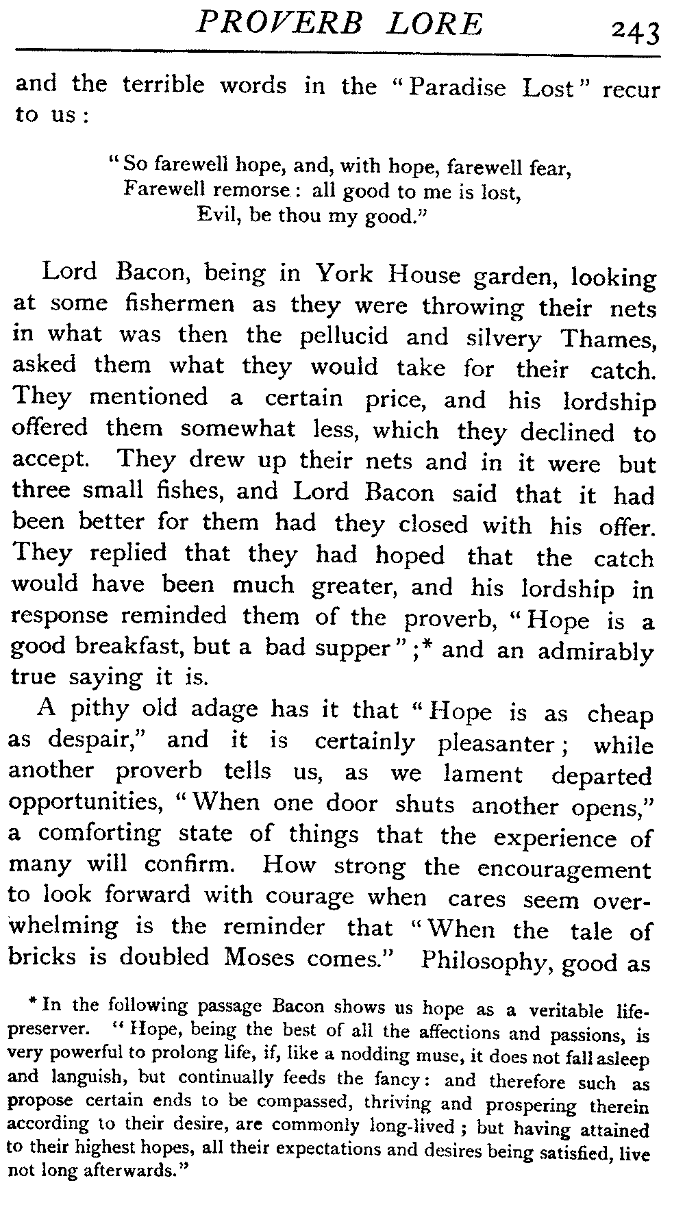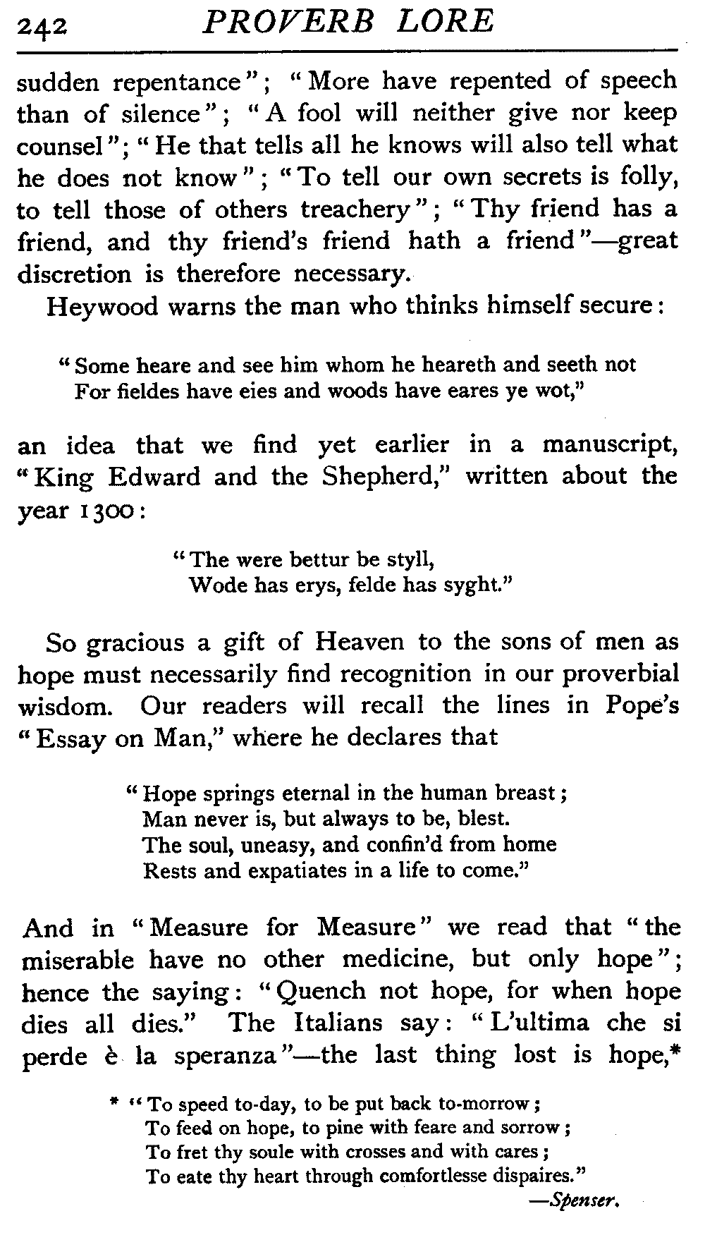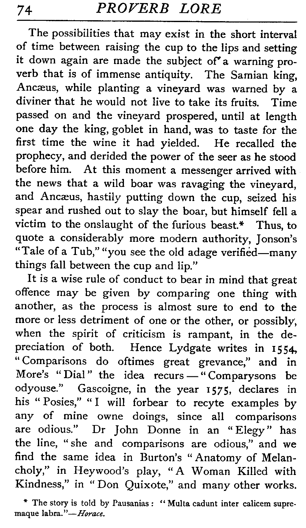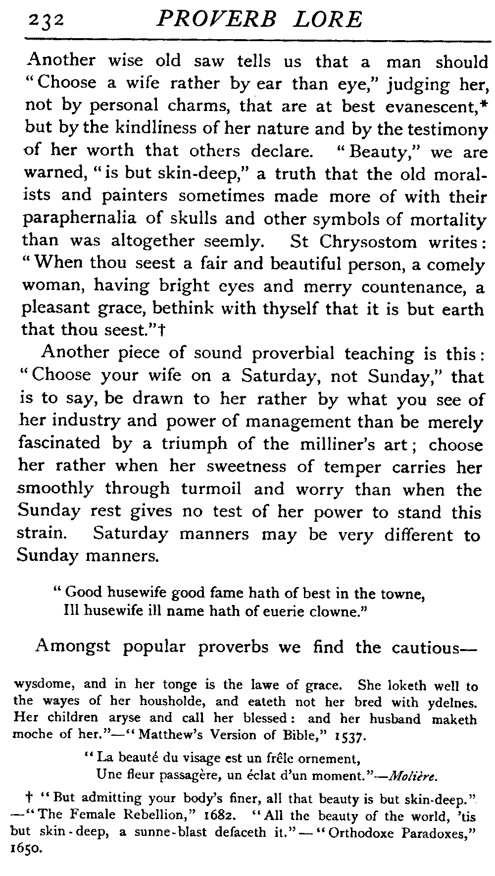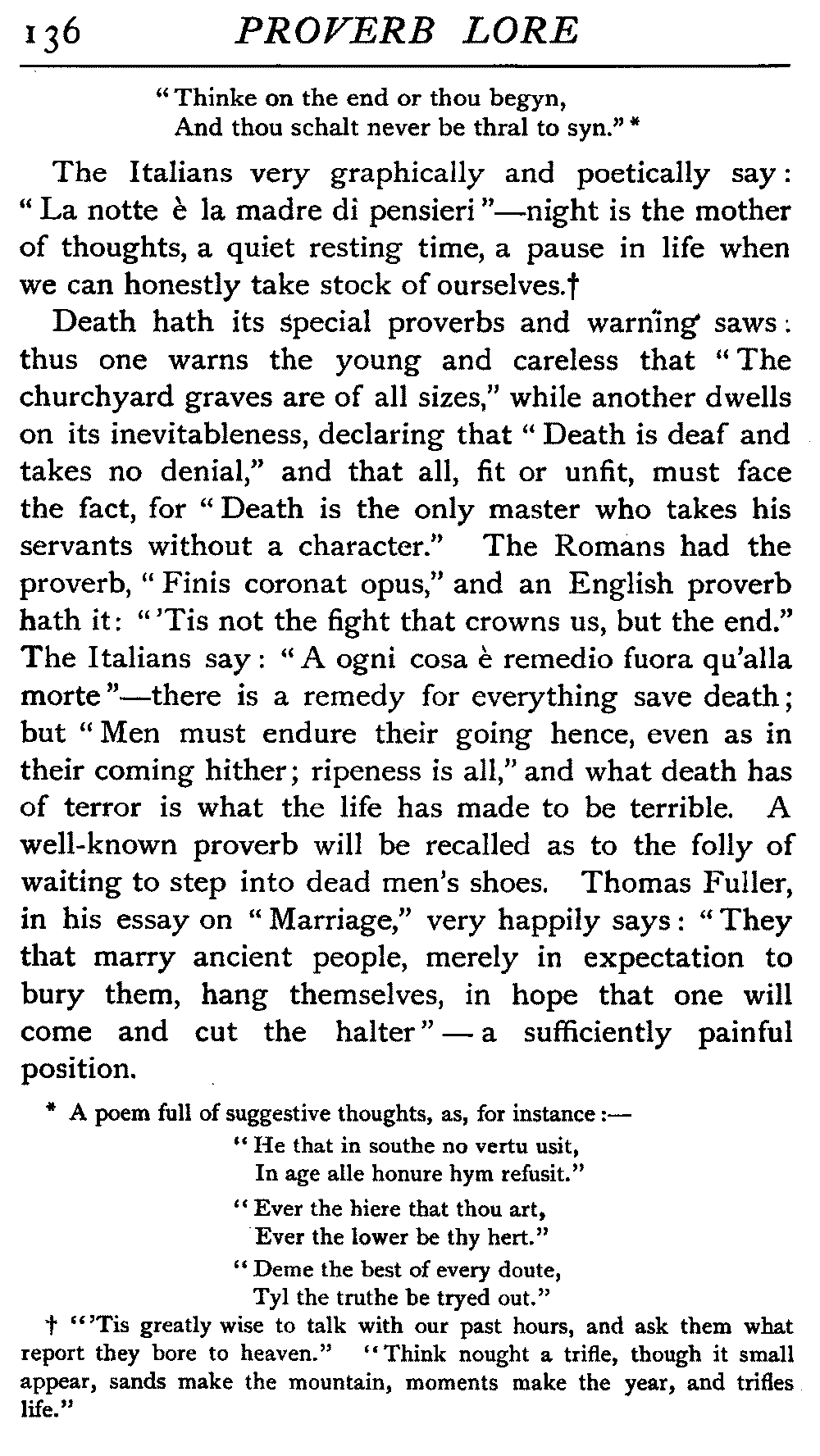 | The Power of the Tongue—Speech and Silence—Knowledge and Wisdom not Interchangeable Terms—Truth and Untruth—Travellers' Tales—Flattery—Industry and Sloth—Youth—Friends, True and False—Riches and Poverty—The Ladder to Thrift—The Influence of Womankind—The Good Wife—The Shrew—The Testimony of Epitaphs—The Grey Mare—Home—Hope—Forethought—Excuses—Good and Ill Fortune—Retribution—Detraction—Pretension—Self-interest—Bribery and Corruption—Custom and Habit—The general Conduct of Life—The Weather—The Moon made of Green Cheese—Conclusion | 194 |