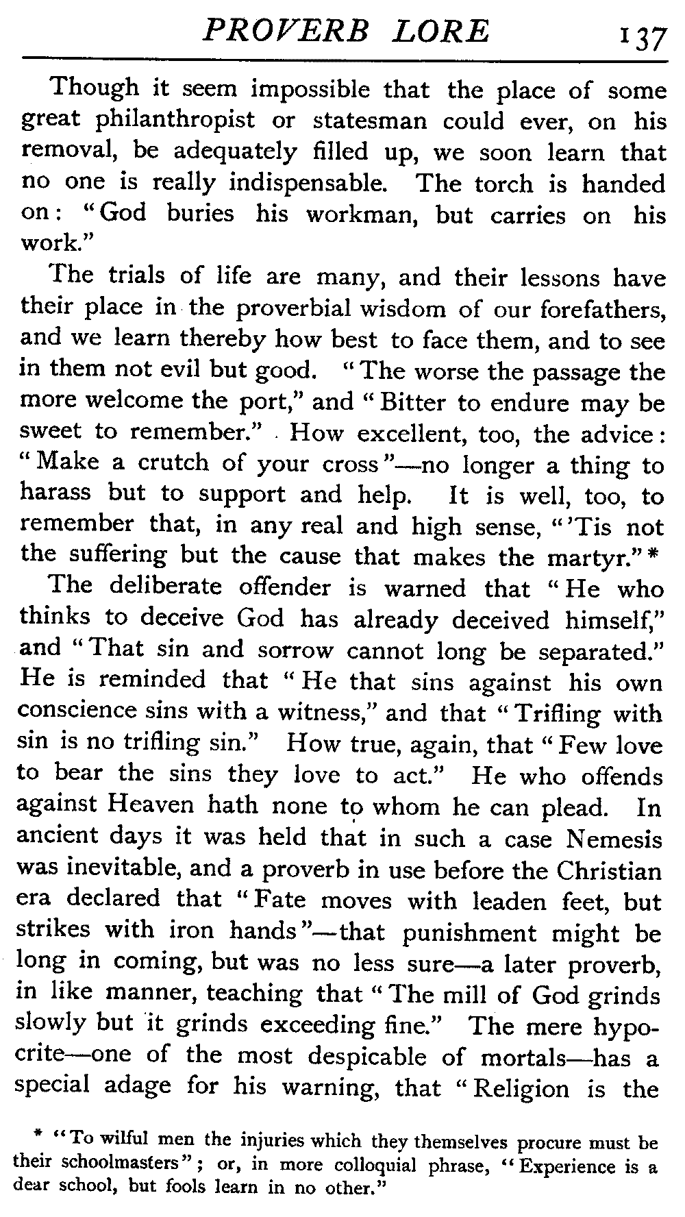 To those who live in constant nervous dread of impending misfortune it should be some little comfort to remember that "Every mote doth not blind a man." Things often work out better than the anticipation of them suggested. No action is unimportant, and all have their consequences, seeing "There is no hair so small but hath its shadow." If the action be wrong the results will accord, for "A crooked stick throws a crooked shadow." As one sows, so must they reap; thistles will never yield figs, nor thorns grapes.