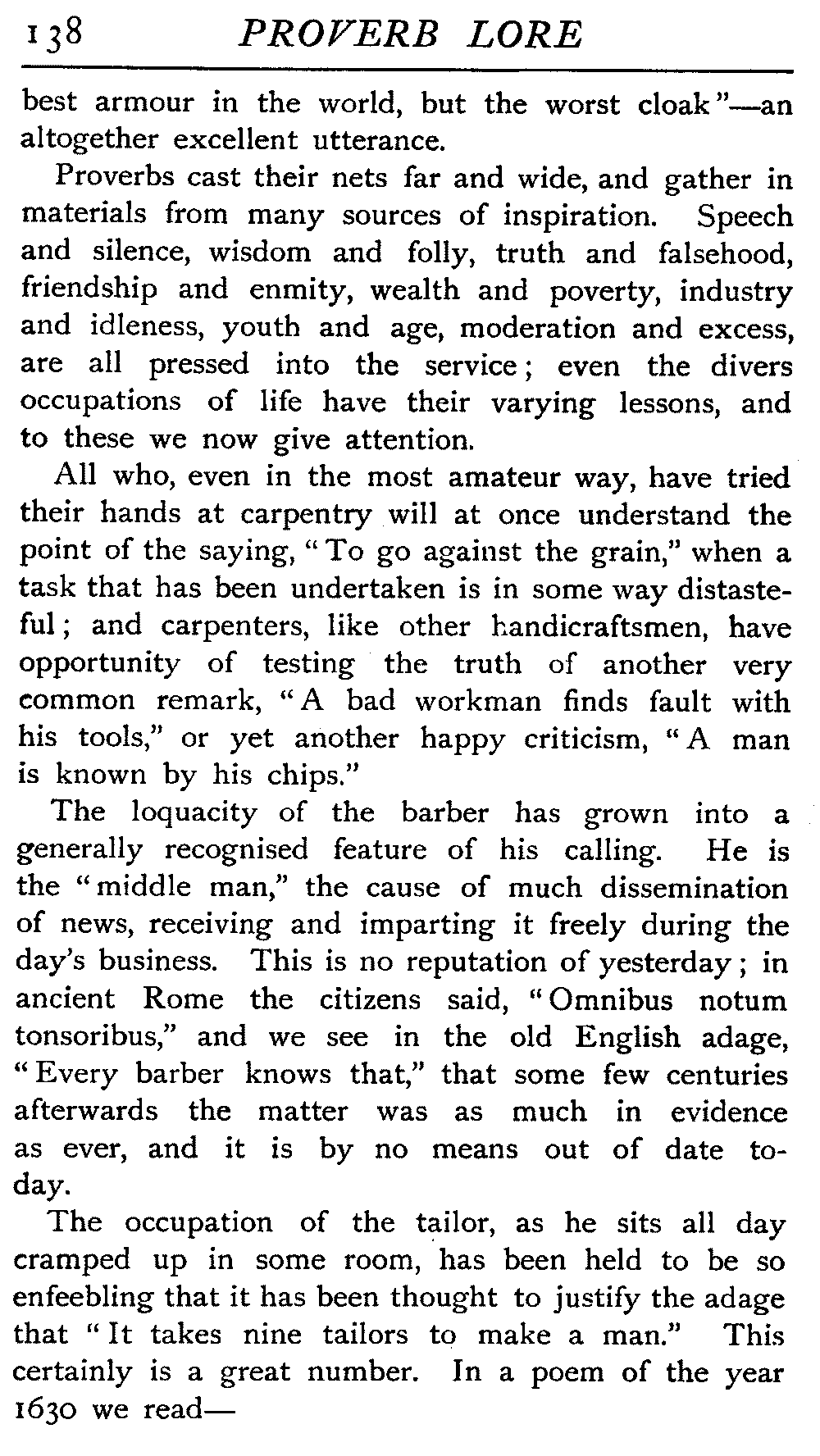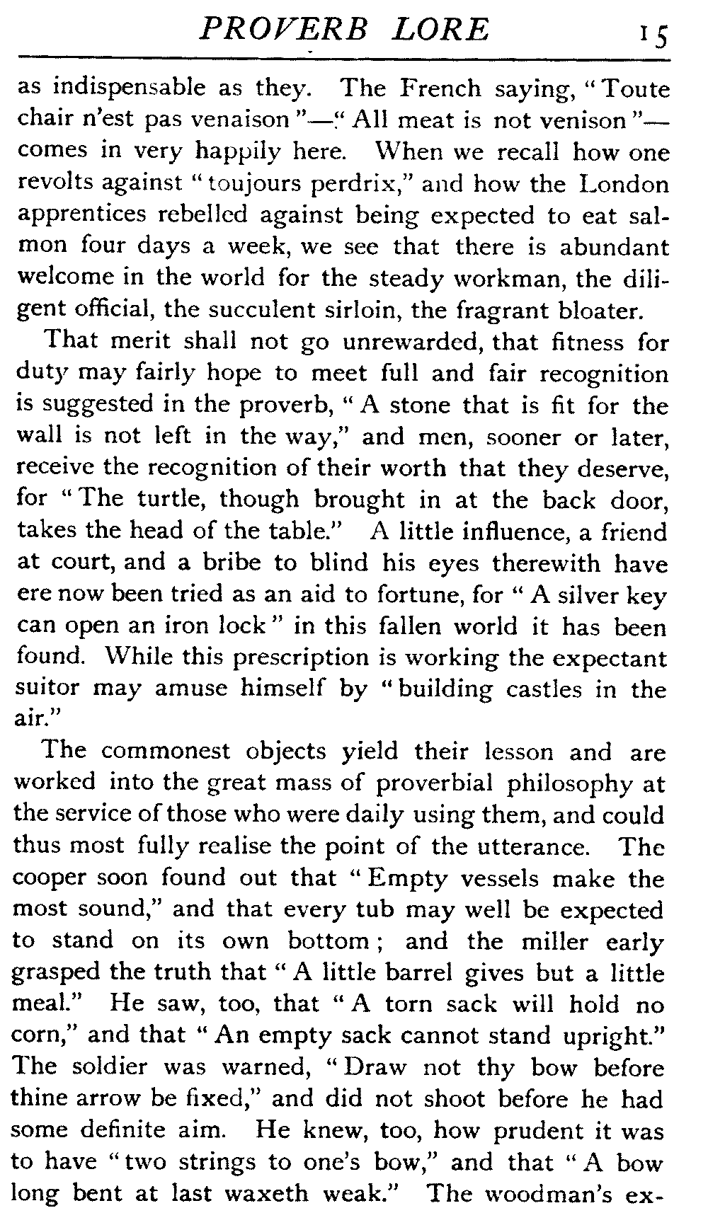 The commonest objects yield their lesson and are worked into the great mass of proverbial philosophy at the service of those who were daily using them, and could thus most fully realise the point of the utterance. The cooper soon found out that "Empty vessels make the most sound," and that every tub may well be expected to stand on its own bottom; and the miller early grasped the truth that "A little barrel gives but a little meal." He saw, too, that "A torn sack will hold no corn," and that "An empty sack cannot stand upright." The soldier was warned, "Draw not thy bow before thine arrow be fixed," and did not shoot before he had some definite aim. He knew, too, how prudent it was to have "two strings to one's bow," and that "A bow long bent at last waxeth weak." The woodman's [16]experience added to the store of proverbial wisdom, "A blunt wedge will sometimes do what a sharp axe cannot"; that "Willows are weak, but yet they bind other wood"; that "Oaks may fall while reeds remain"; and that "Great trees keep down little ones"; while the gardener saw that "Ripe fruit may grow on rough wall"; and even the nursery yields the declaration that "A burnt child dreads the fire"; and the tailor grasps the wisdom of the advice, "Measure thy cloth thrice ere thou cut it once." Other homely adages are—"At open doors dogs come in," "A spur in the head is worth two in the heels," "The rotten apple injures its neighbour," "Darns are bad, but better than debts."