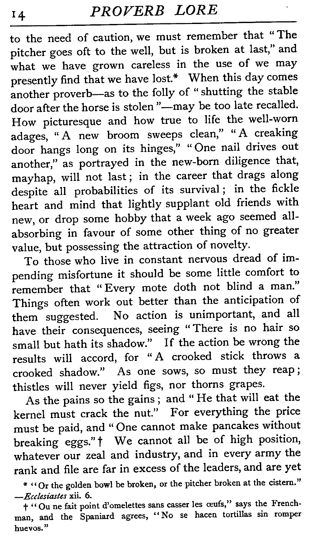 When a continuous use of any advantage blinds us [14]to the need of caution, we must remember that "The pitcher goes oft to the well, but is broken at last," and what we have grown careless in the use of we may presently find that we have lost.[14:A] When this day comes another proverb—as to the folly of "shutting the stable door after the horse is stolen"—may be too late recalled. How picturesque and how true to life the well-worn adages, "A new broom sweeps clean," "A creaking door hangs long on its hinges," "One nail drives out another," as portrayed in the new-born diligence that, mayhap, will not last; in the career that drags along despite all probabilities of its survival; in the fickle heart and mind that lightly supplant old friends with new, or drop some hobby that a week ago seemed all-absorbing in favour of some other thing of no greater value, but possessing the attraction of novelty.