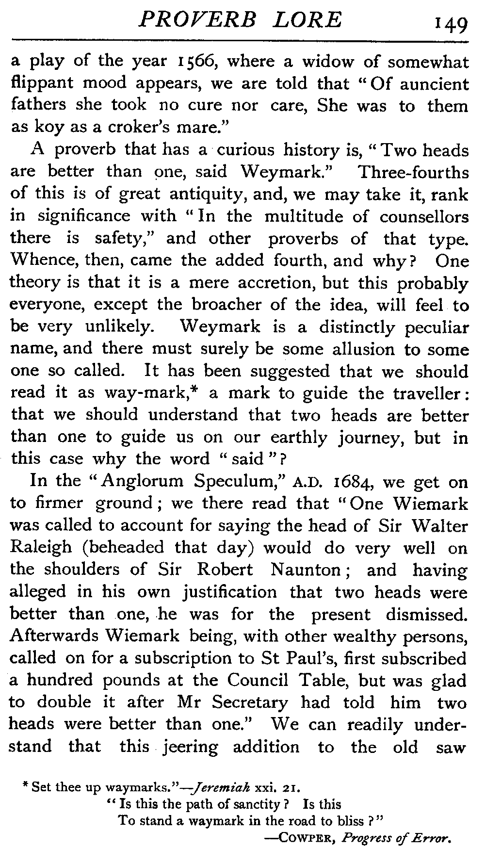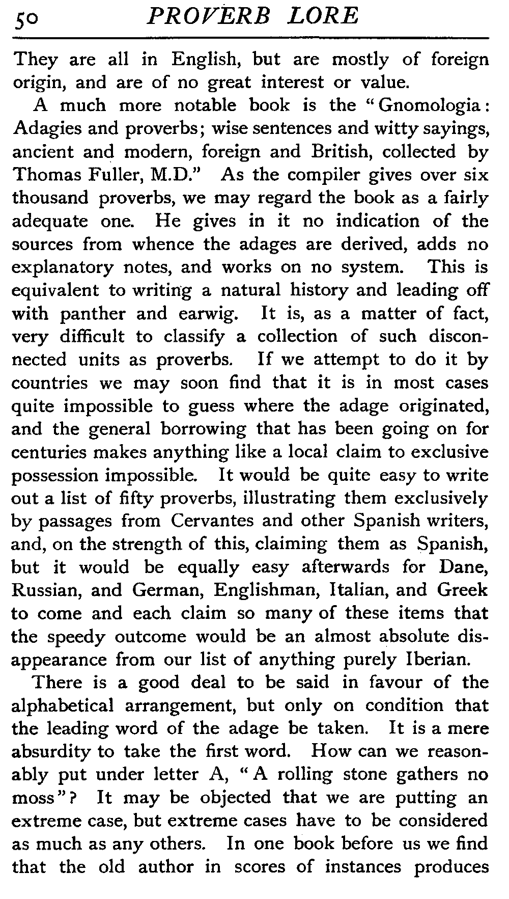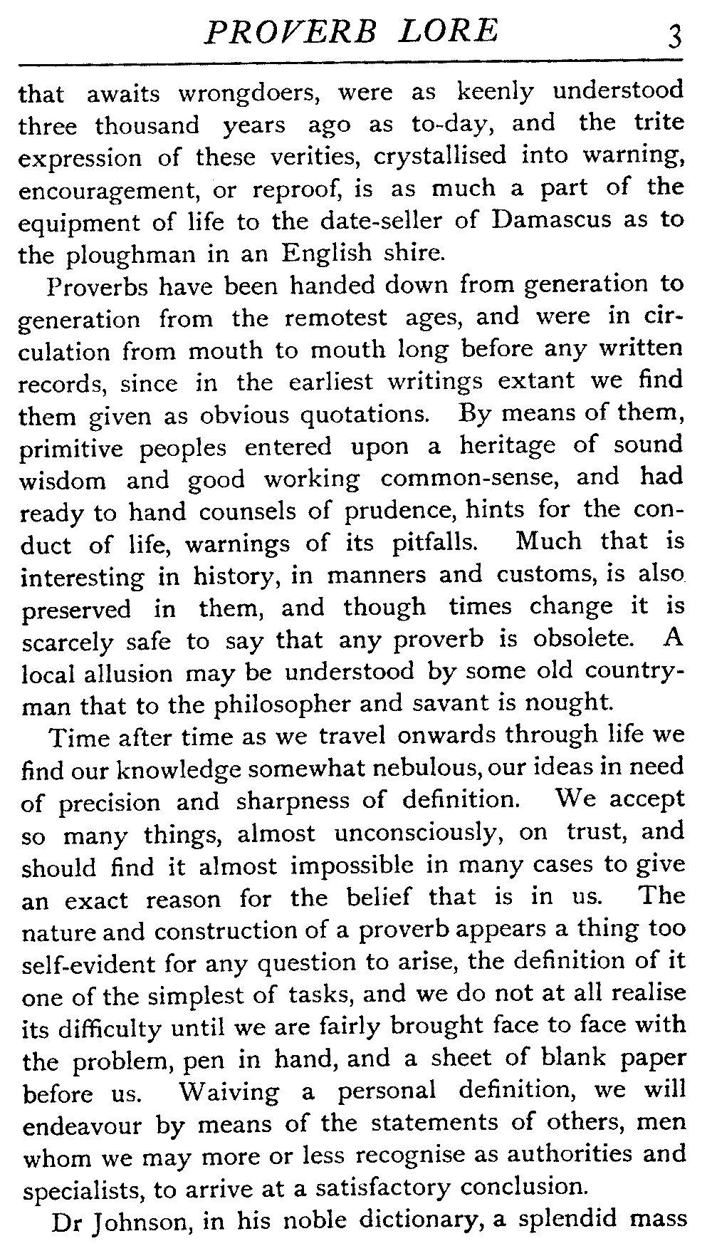 Time after time as we travel onwards through life we find our knowledge somewhat nebulous, our ideas in need of precision and sharpness of definition. We accept so many things, almost unconsciously, on trust, and should find it almost impossible in many cases to give an exact reason for the belief that is in us. The nature and construction of a proverb appears a thing too self-evident for any question to arise, the definition of it one of the simplest of tasks, and we do not at all realise its difficulty until we are fairly brought face to face with the problem, pen in hand, and a sheet of blank paper before us. Waiving a personal definition, we will endeavour by means of the statements of others, men whom we may more or less recognise as authorities and specialists, to arrive at a satisfactory conclusion.