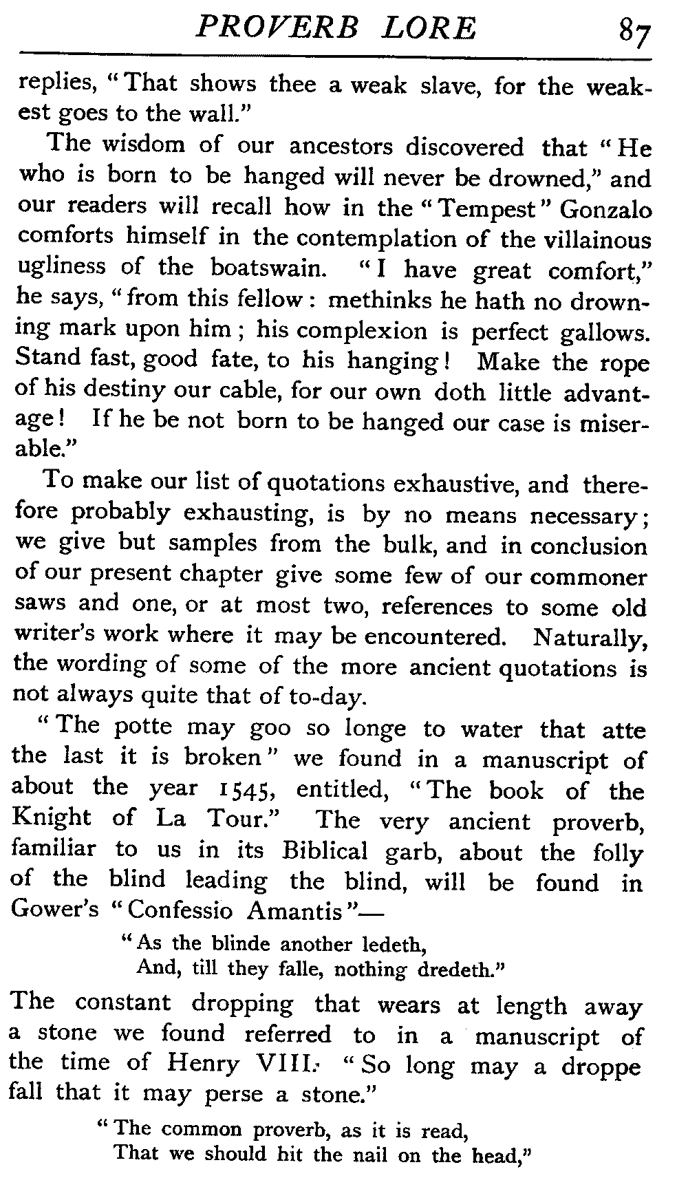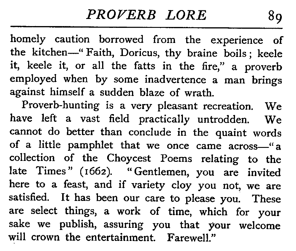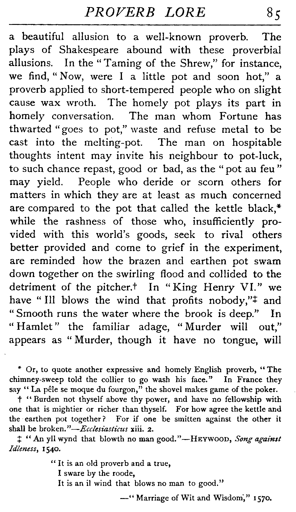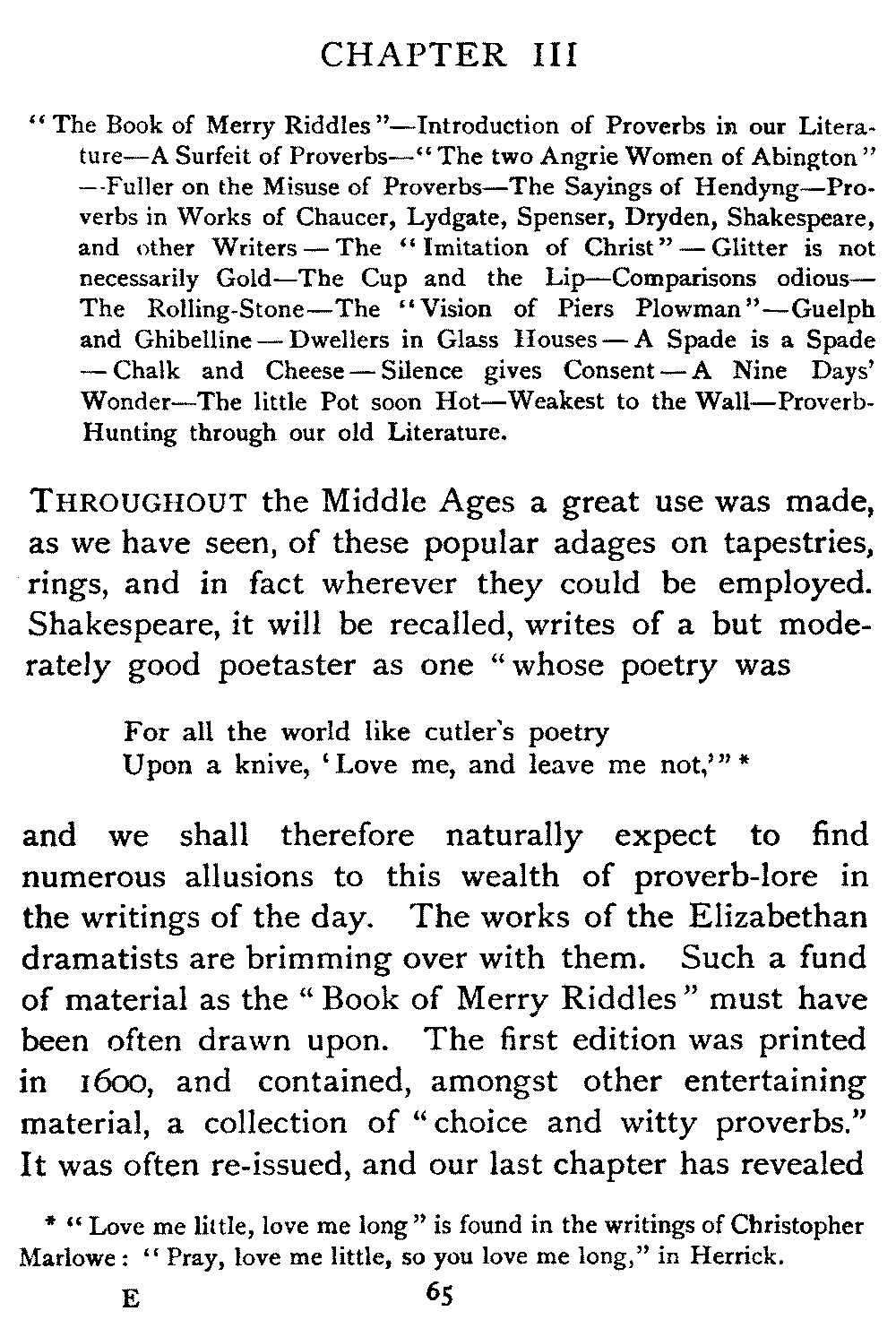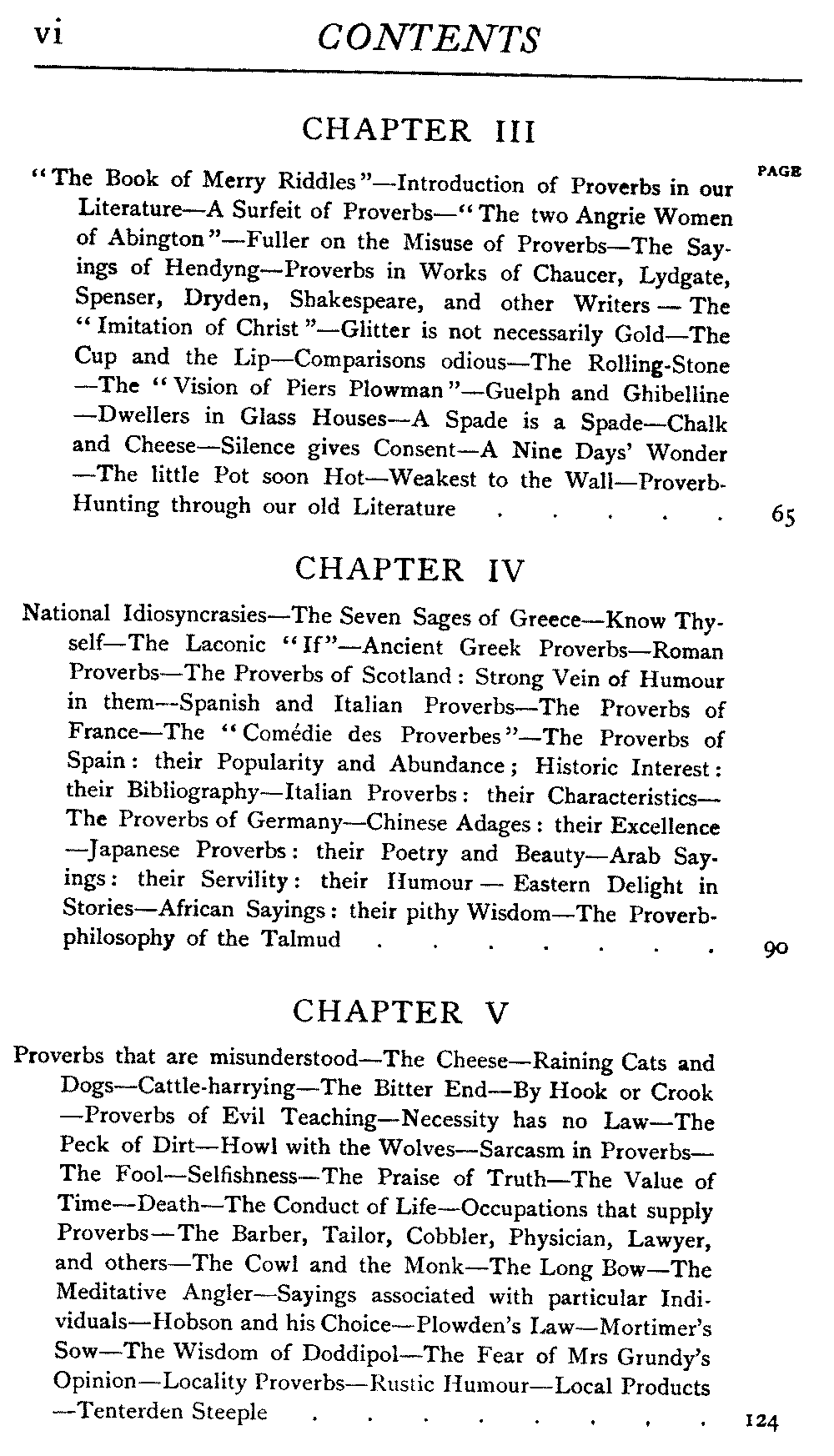 | "The Book of Merry Riddles"—Introduction of Proverbs in our Literature—A Surfeit of Proverbs—"The two Angrie Women of Abington"—Fuller on the Misuse of Proverbs—The Sayings of Hendyng—Proverbs in Works of Chaucer, Lydgate, Spenser, Dryden, Shakespeare, and other Writers—The "Imitation of Christ"—Glitter is not necessarily Gold—The Cup and the Lip—Comparisons odious—The Rolling-Stone—The "Vision of Piers Plowman"—Guelph and Ghibelline—Dwellers in Glass Houses—A Spade is a Spade—Chalk and Cheese—Silence gives Consent—A Nine Days' Wonder—The little Pot soon Hot—Weakest to the Wall—Proverb-Hunting through our old Literature | 65 |