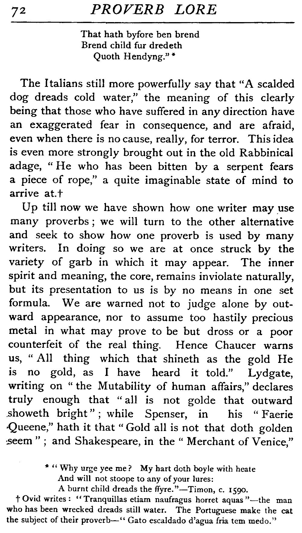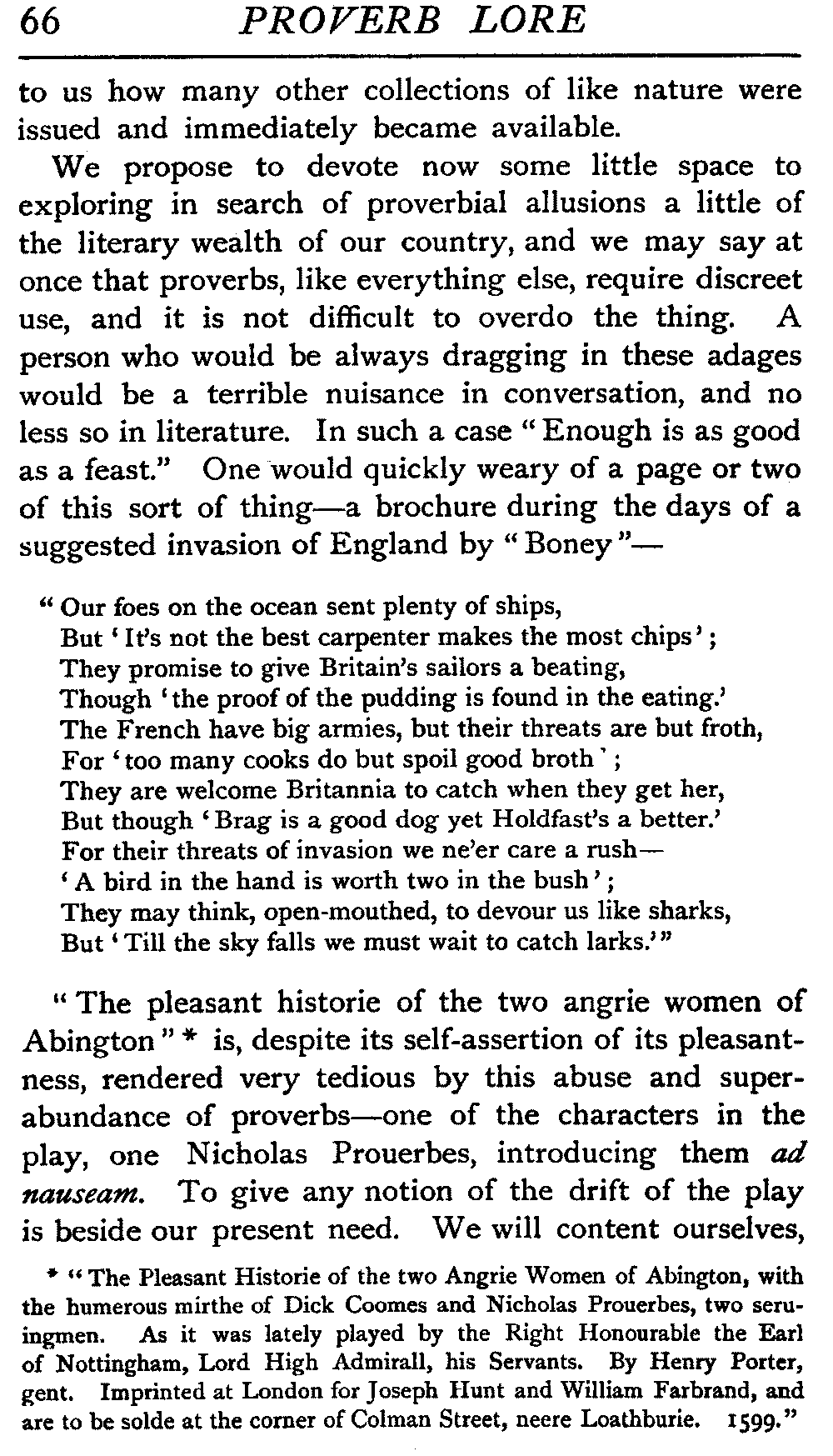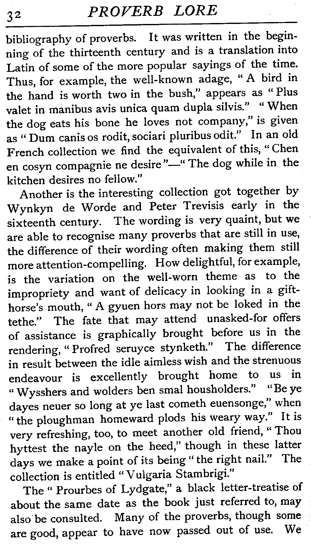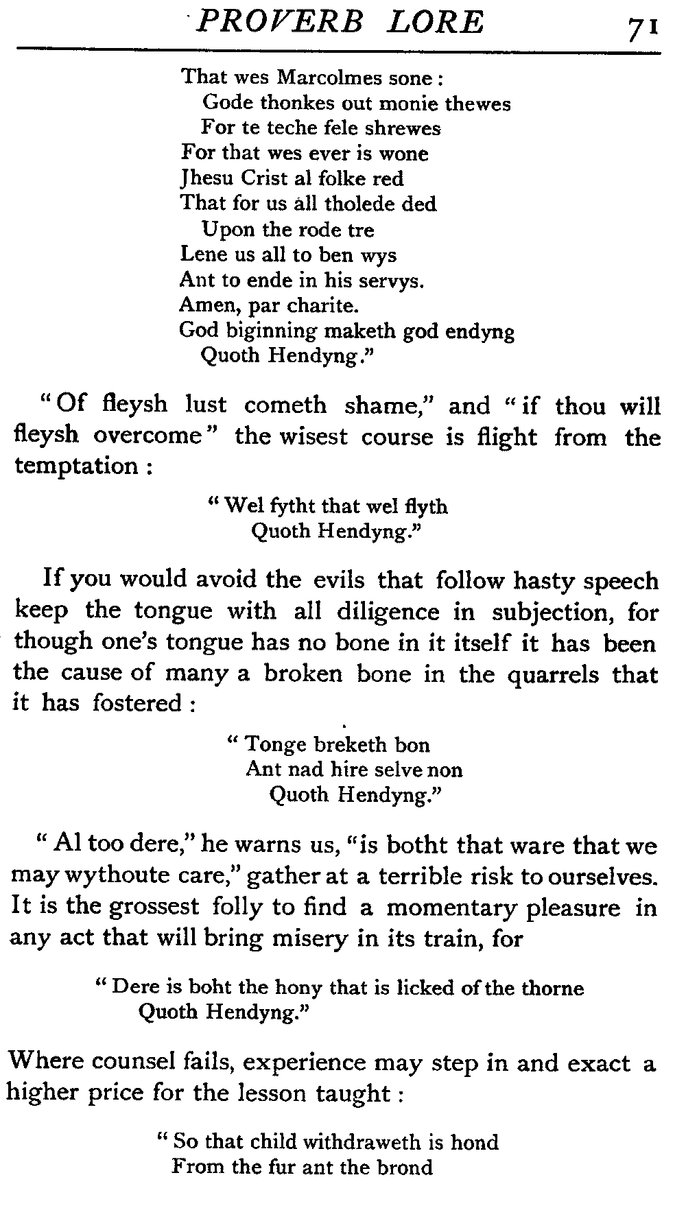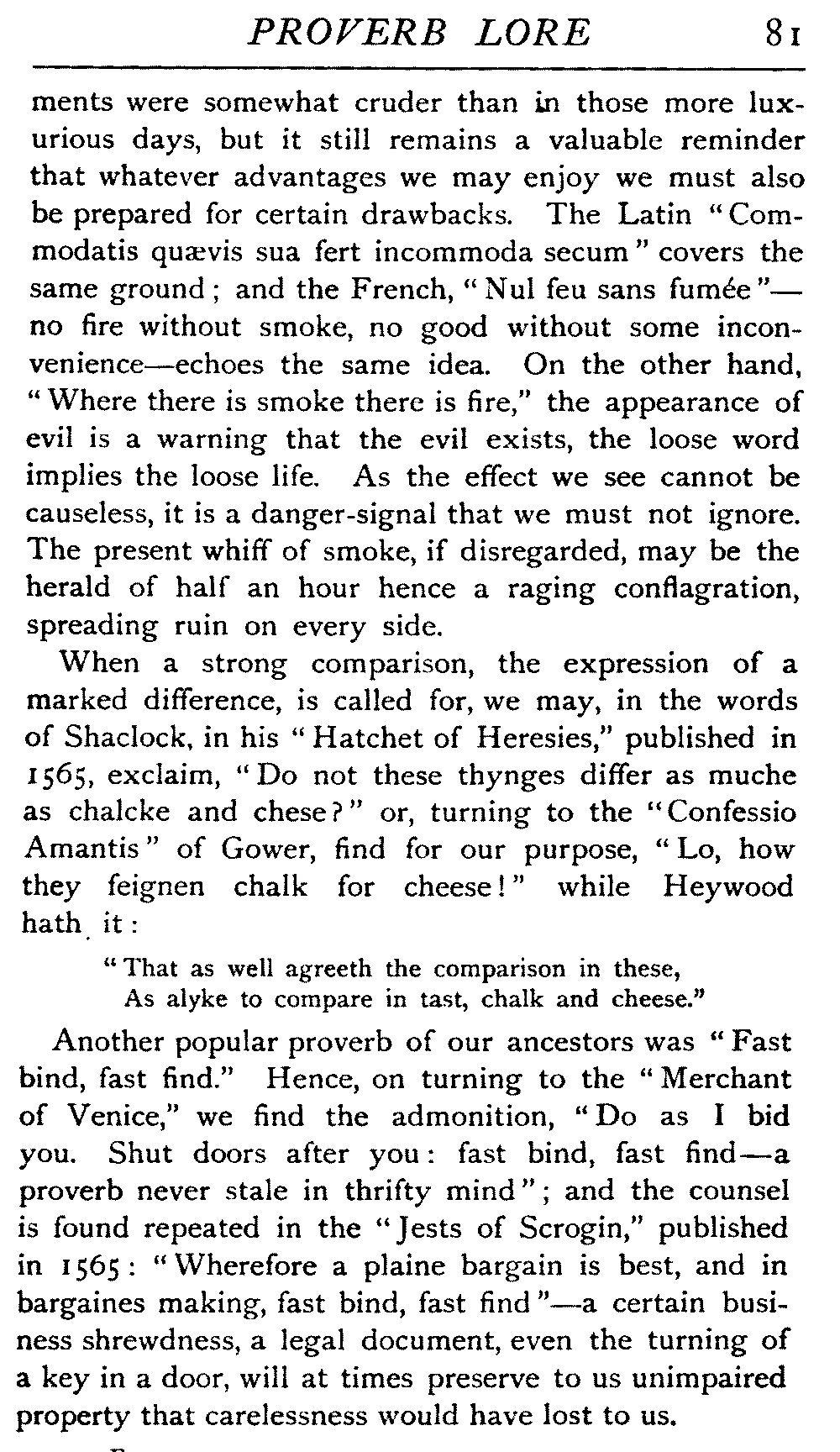 | "The Book of Merry Riddles"—Introduction of Proverbs in our Literature—A Surfeit of Proverbs—"The two Angrie Women of Abington"—Fuller on the Misuse of Proverbs—The Sayings of Hendyng—Proverbs in Works of Chaucer, Lydgate, Spenser, Dryden, Shakespeare, and other Writers—The "Imitation of Christ"—Glitter is not necessarily Gold—The Cup and the Lip—Comparisons odious—The Rolling-Stone—The "Vision of Piers Plowman"—Guelph and Ghibelline—Dwellers in Glass Houses—A Spade is a Spade—Chalk and Cheese—Silence gives Consent—A Nine Days' Wonder—The little Pot soon Hot—Weakest to the Wall—Proverb-Hunting through our old Literature | 65 |