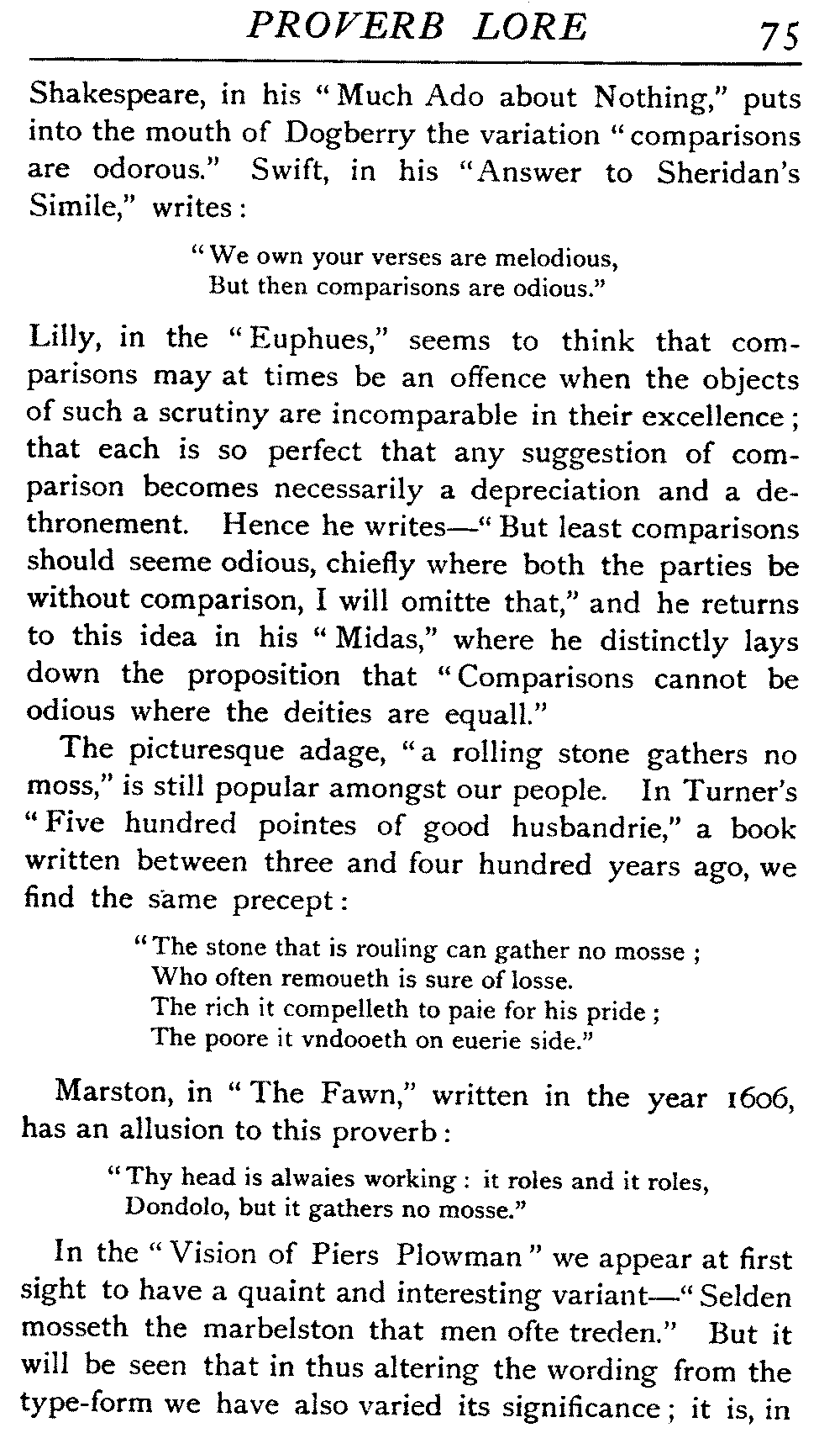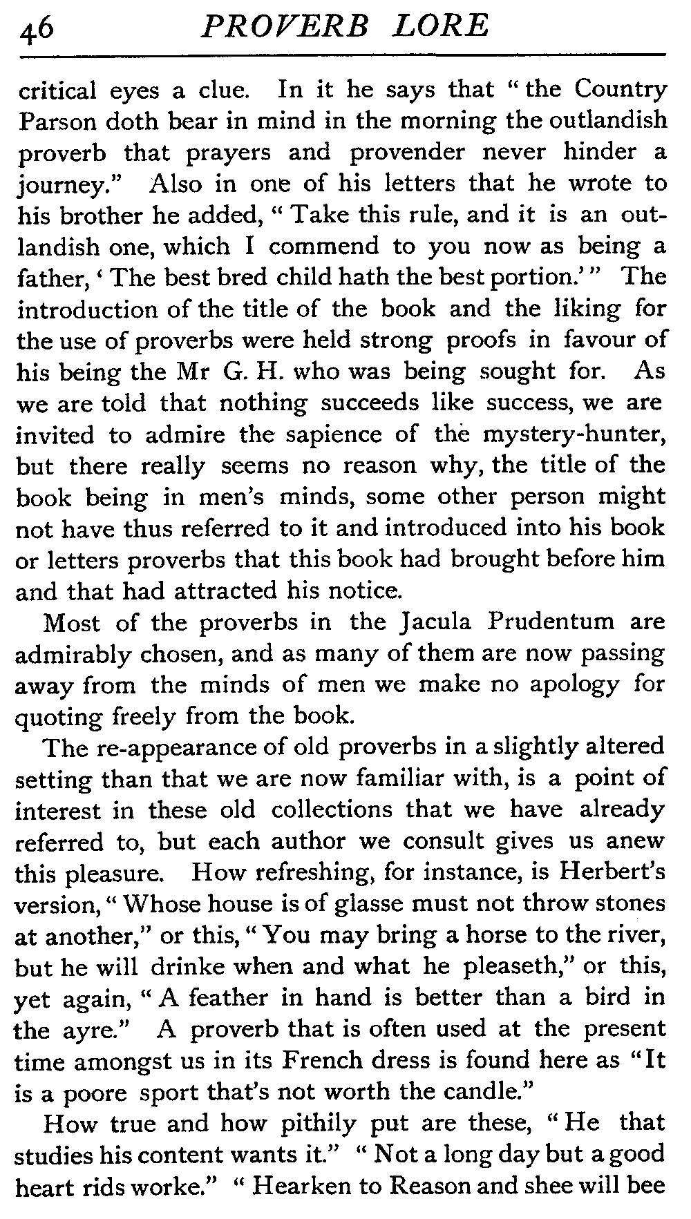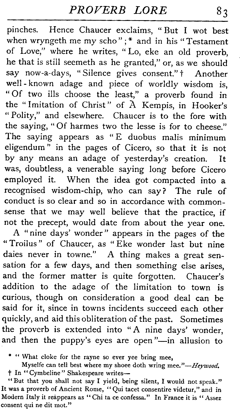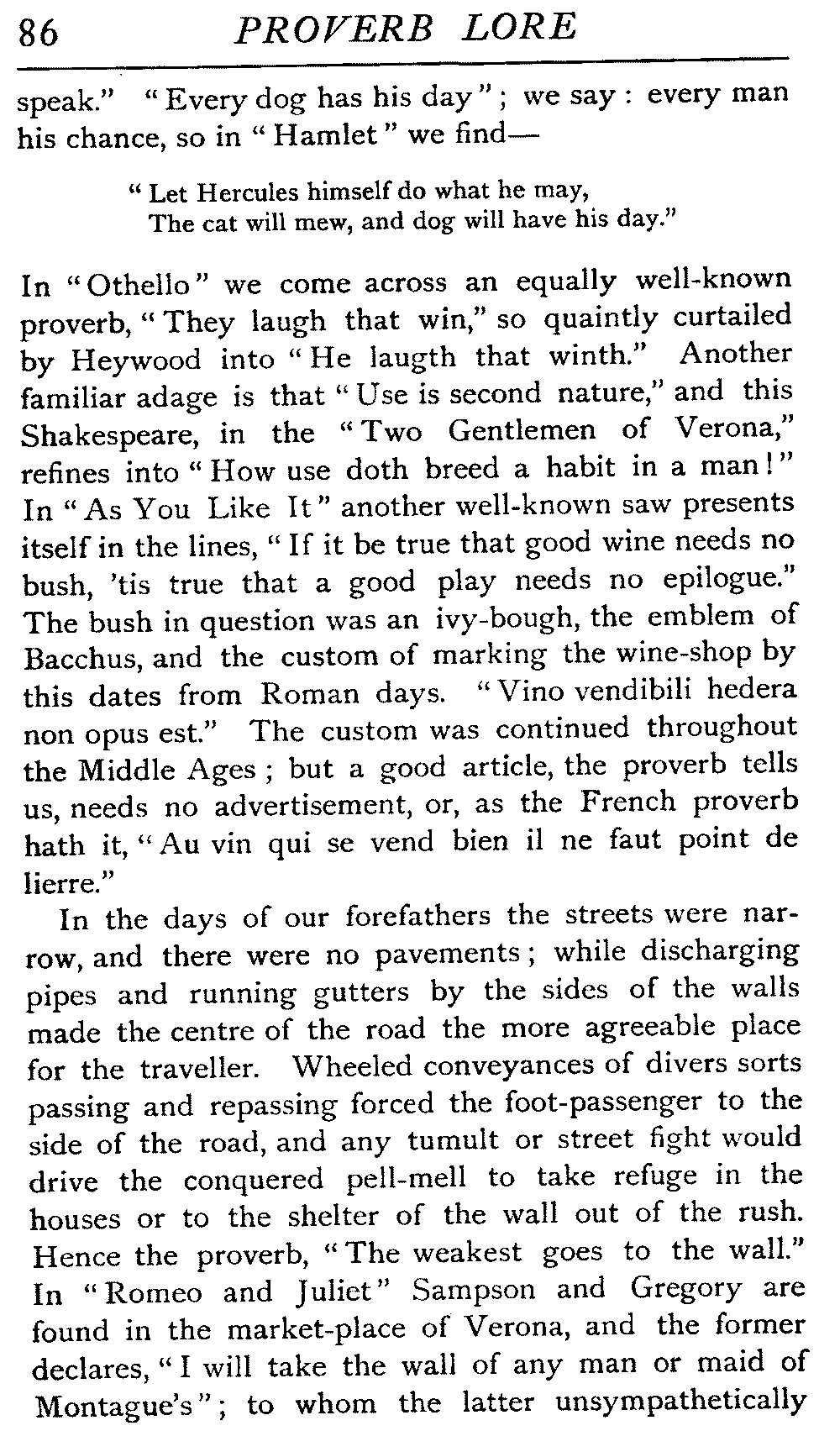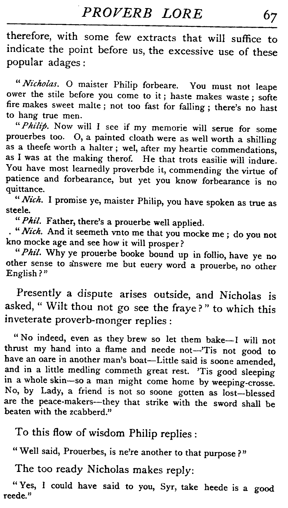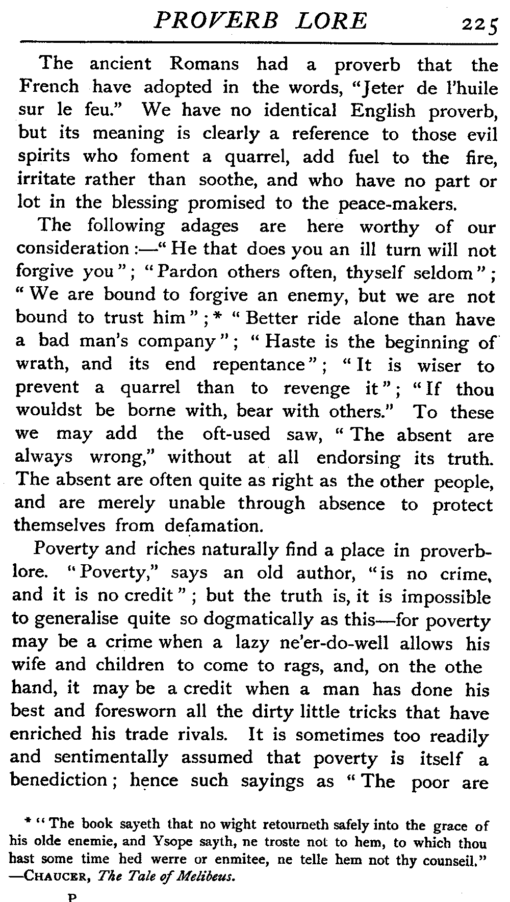| "The Book of Merry Riddles"—Introduction of Proverbs in our Literature—A Surfeit of Proverbs—"The two Angrie Women of Abington"—Fuller on the Misuse of Proverbs—The Sayings of Hendyng—Proverbs in Works of Chaucer, Lydgate, Spenser, Dryden, Shakespeare, and other Writers—The "Imitation of Christ"—Glitter is not necessarily Gold—The Cup and the Lip—Comparisons odious—The Rolling-Stone—The "Vision of Piers Plowman"—Guelph and Ghibelline—Dwellers in Glass Houses—A Spade is a Spade—Chalk and Cheese—Silence gives Consent—A Nine Days' Wonder—The little Pot soon Hot—Weakest to the Wall—Proverb-Hunting through our old Literature | 65 |