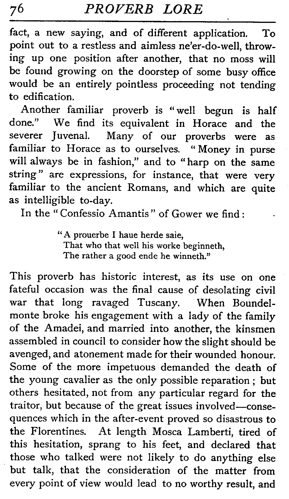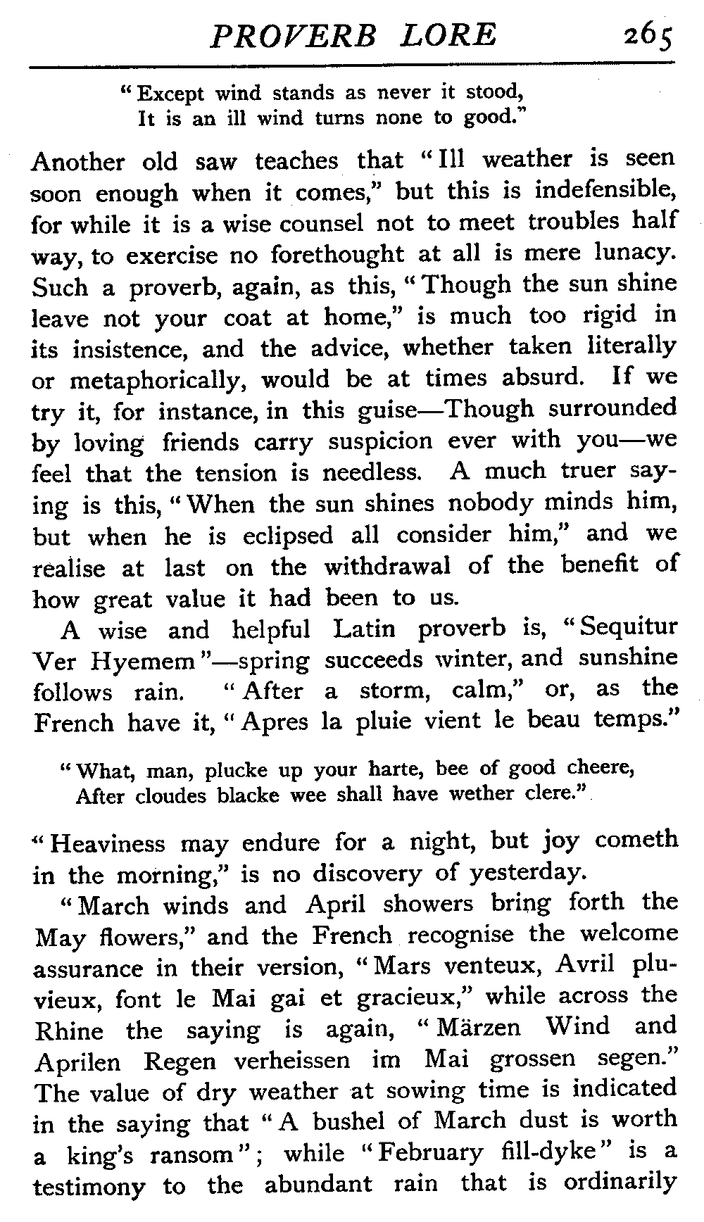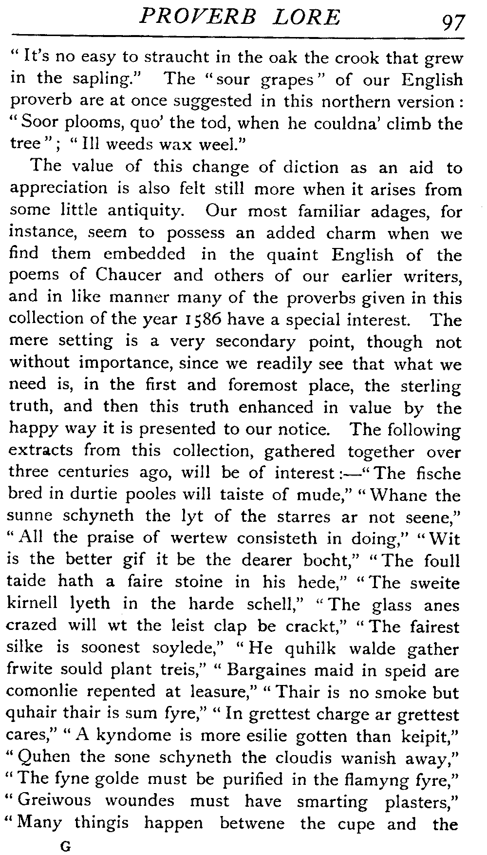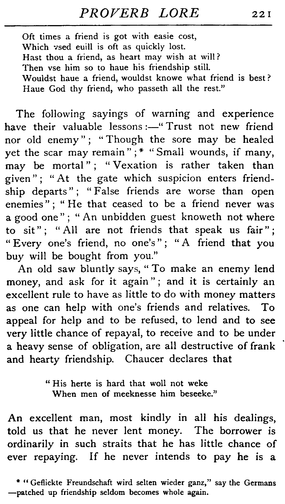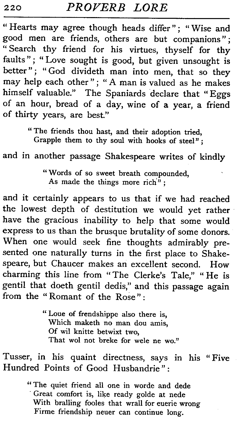 | "The Book of Merry Riddles"—Introduction of Proverbs in our Literature—A Surfeit of Proverbs—"The two Angrie Women of Abington"—Fuller on the Misuse of Proverbs—The Sayings of Hendyng—Proverbs in Works of Chaucer, Lydgate, Spenser, Dryden, Shakespeare, and other Writers—The "Imitation of Christ"—Glitter is not necessarily Gold—The Cup and the Lip—Comparisons odious—The Rolling-Stone—The "Vision of Piers Plowman"—Guelph and Ghibelline—Dwellers in Glass Houses—A Spade is a Spade—Chalk and Cheese—Silence gives Consent—A Nine Days' Wonder—The little Pot soon Hot—Weakest to the Wall—Proverb-Hunting through our old Literature | 65 |