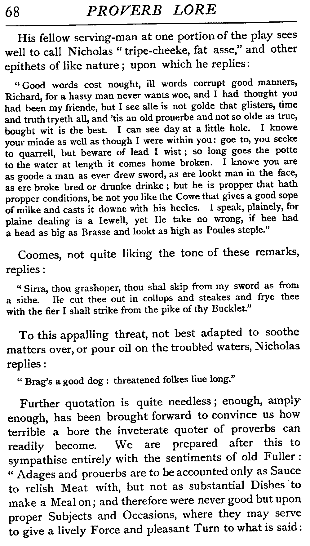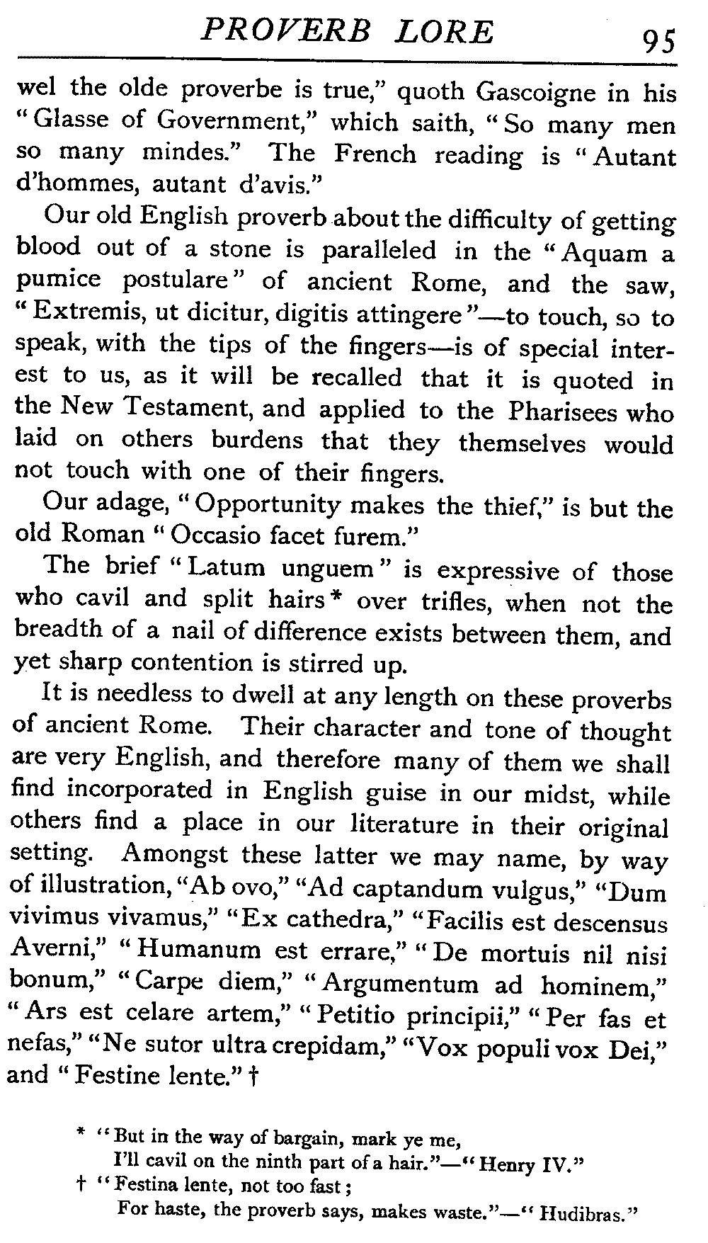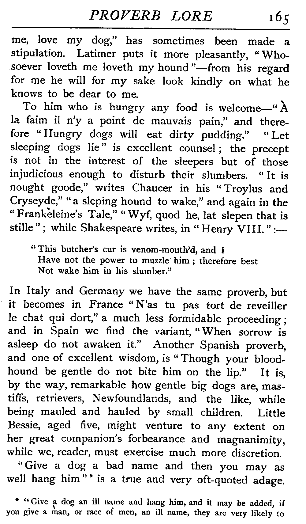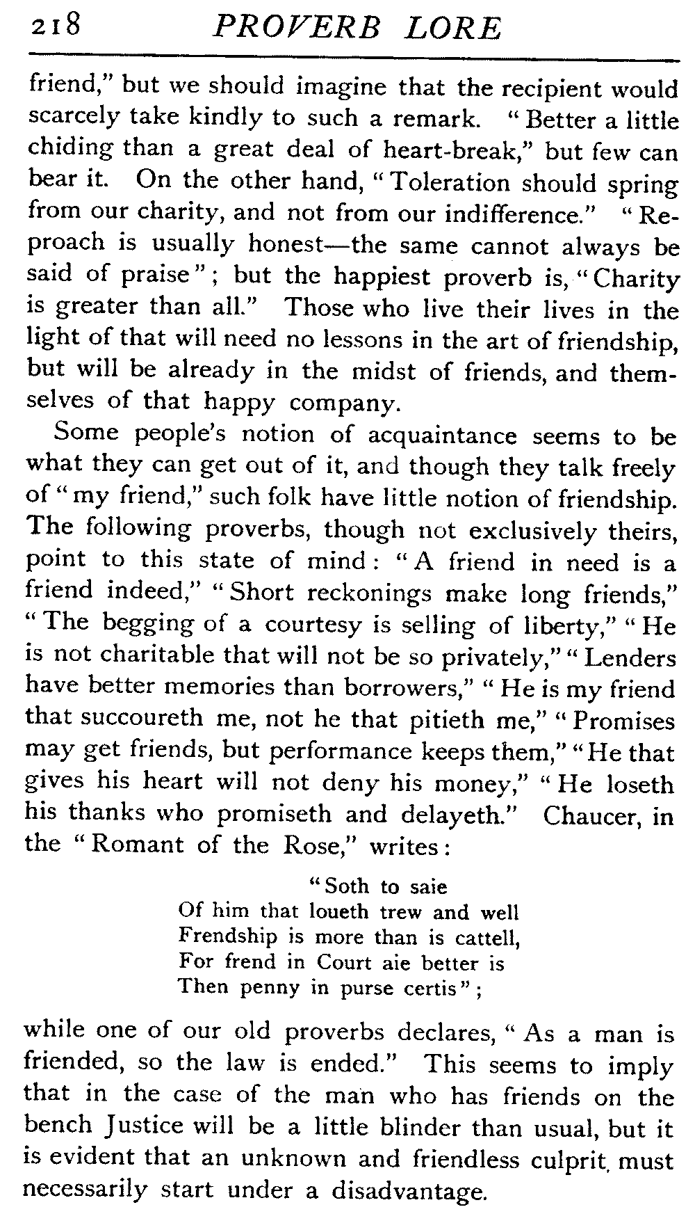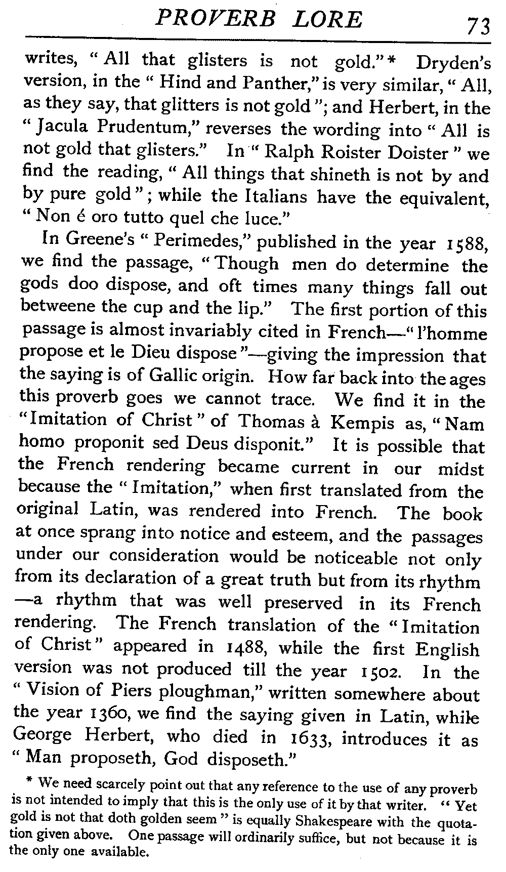 | "The Book of Merry Riddles"—Introduction of Proverbs in our Literature—A Surfeit of Proverbs—"The two Angrie Women of Abington"—Fuller on the Misuse of Proverbs—The Sayings of Hendyng—Proverbs in Works of Chaucer, Lydgate, Spenser, Dryden, Shakespeare, and other Writers—The "Imitation of Christ"—Glitter is not necessarily Gold—The Cup and the Lip—Comparisons odious—The Rolling-Stone—The "Vision of Piers Plowman"—Guelph and Ghibelline—Dwellers in Glass Houses—A Spade is a Spade—Chalk and Cheese—Silence gives Consent—A Nine Days' Wonder—The little Pot soon Hot—Weakest to the Wall—Proverb-Hunting through our old Literature | 65 |