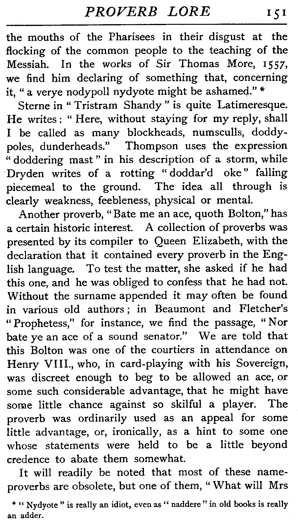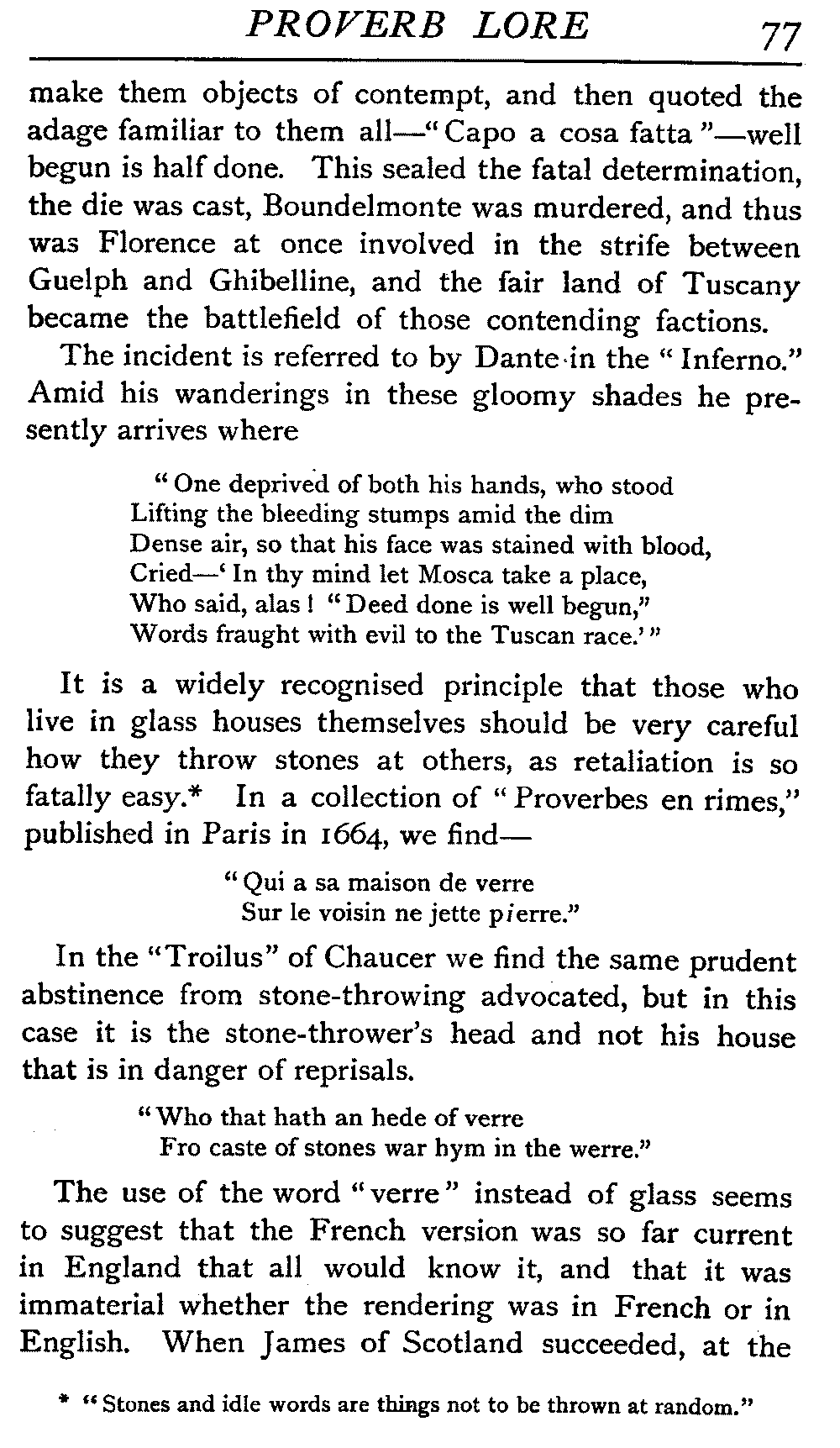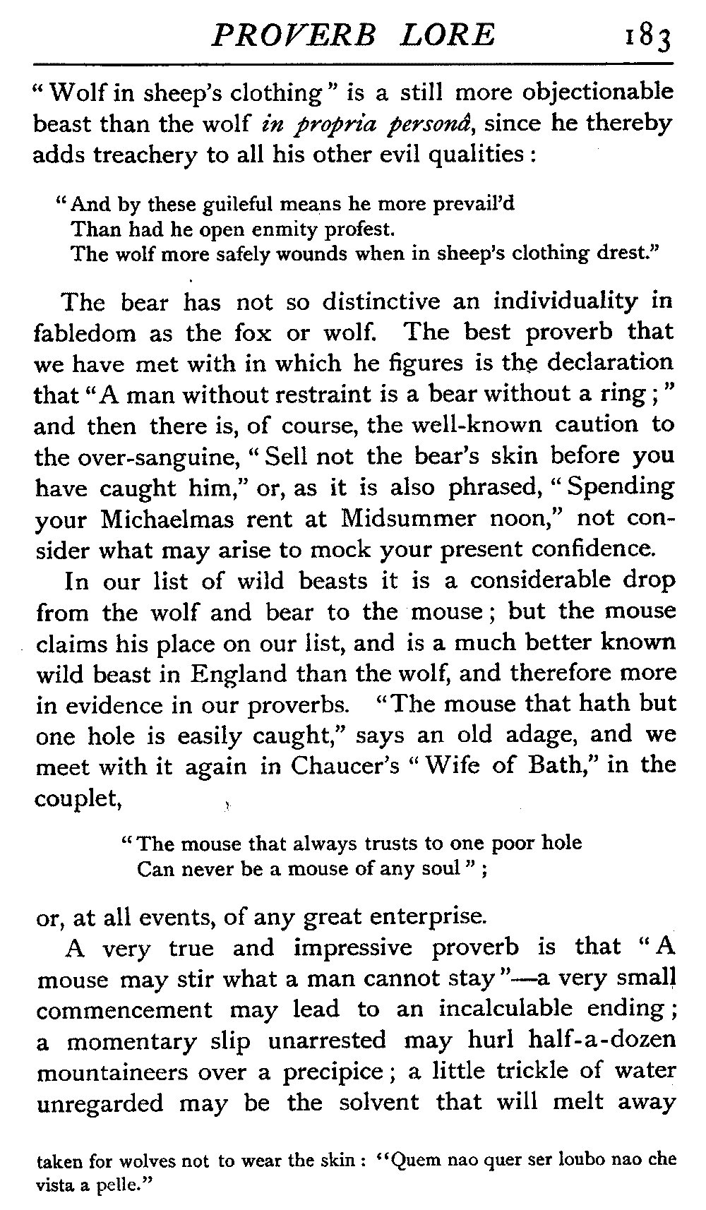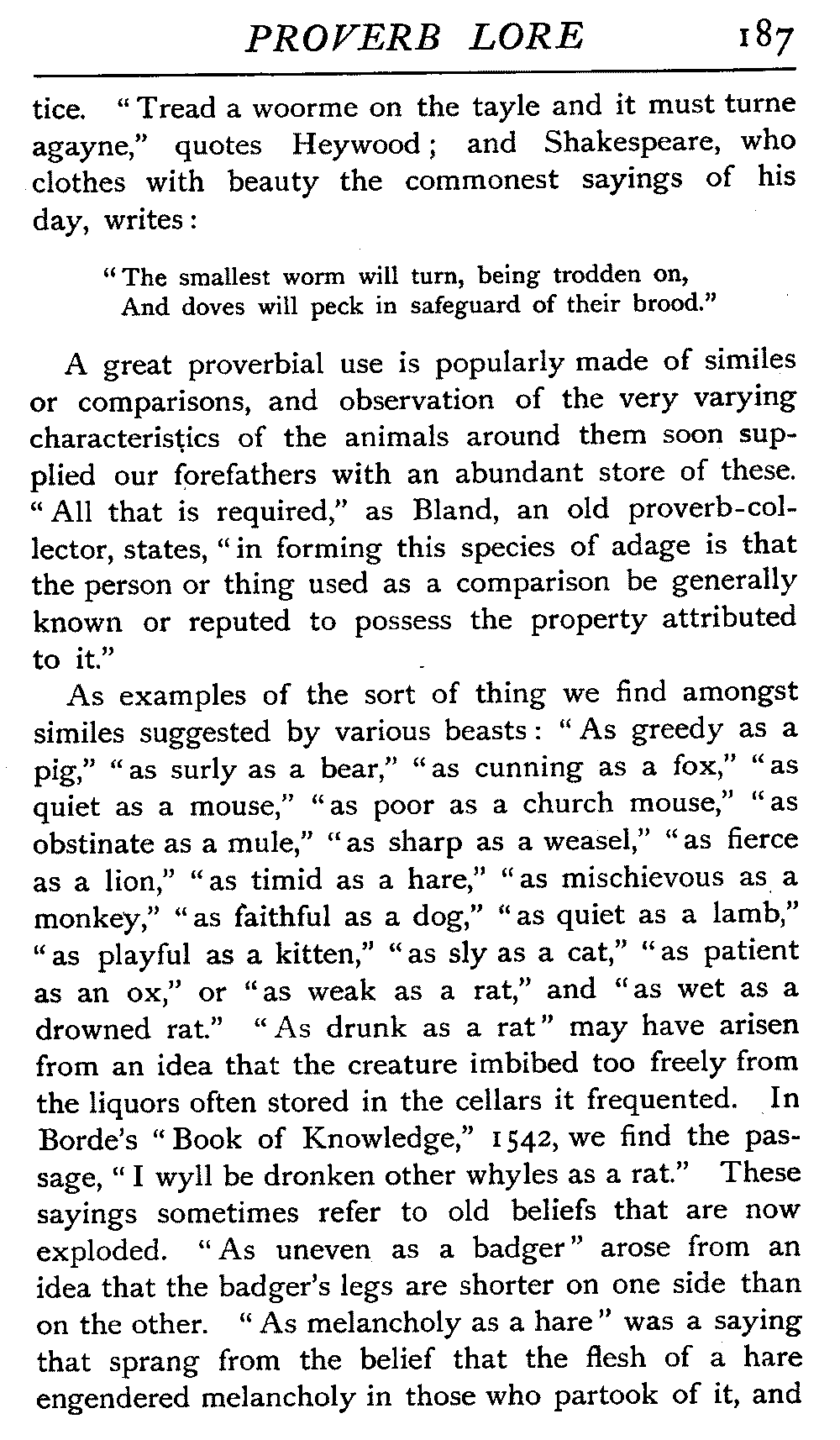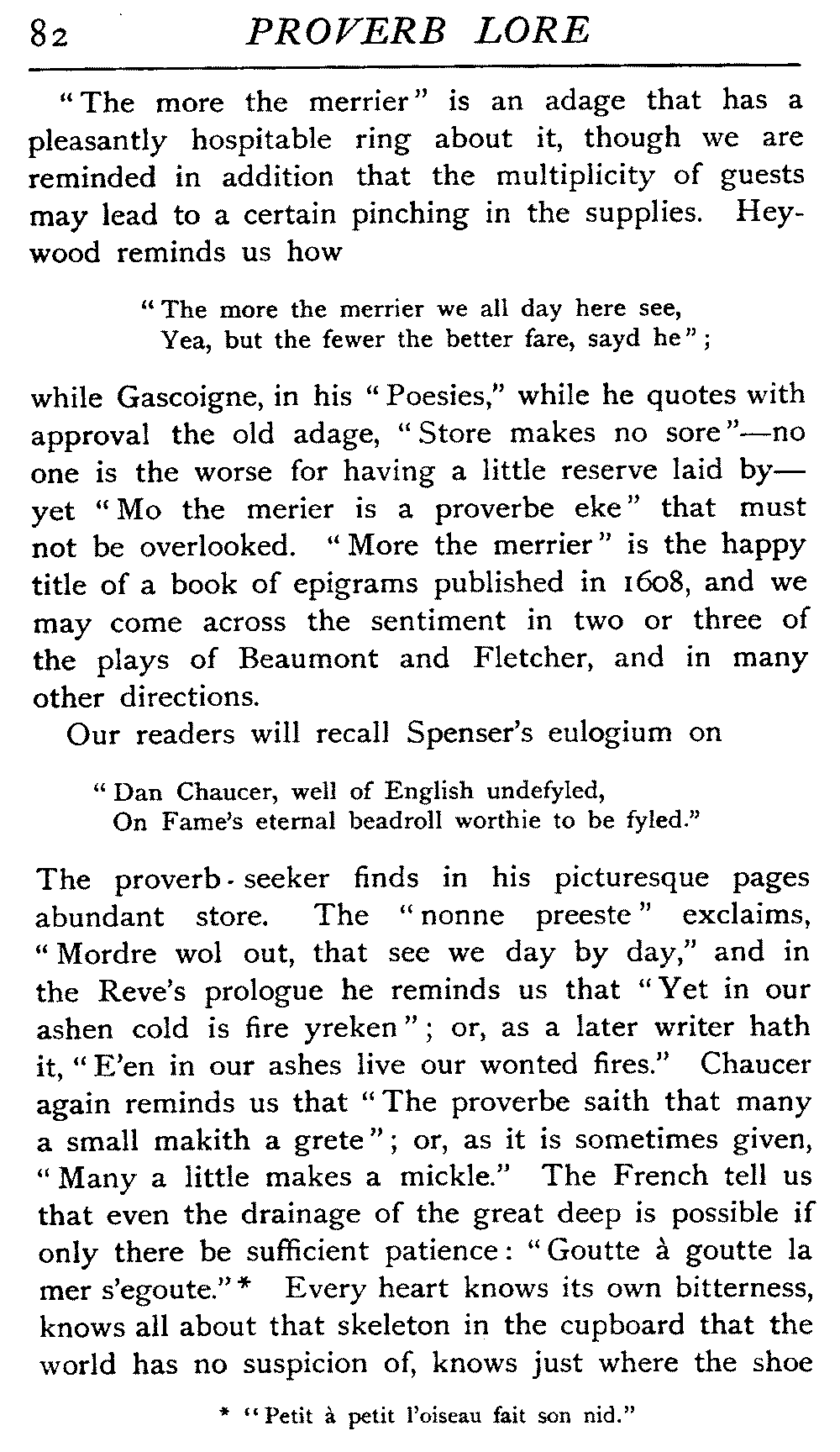| "The Book of Merry Riddles"—Introduction of Proverbs in our Literature—A Surfeit of Proverbs—"The two Angrie Women of Abington"—Fuller on the Misuse of Proverbs—The Sayings of Hendyng—Proverbs in Works of Chaucer, Lydgate, Spenser, Dryden, Shakespeare, and other Writers—The "Imitation of Christ"—Glitter is not necessarily Gold—The Cup and the Lip—Comparisons odious—The Rolling-Stone—The "Vision of Piers Plowman"—Guelph and Ghibelline—Dwellers in Glass Houses—A Spade is a Spade—Chalk and Cheese—Silence gives Consent—A Nine Days' Wonder—The little Pot soon Hot—Weakest to the Wall—Proverb-Hunting through our old Literature | 65 |