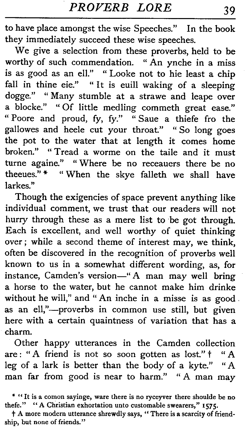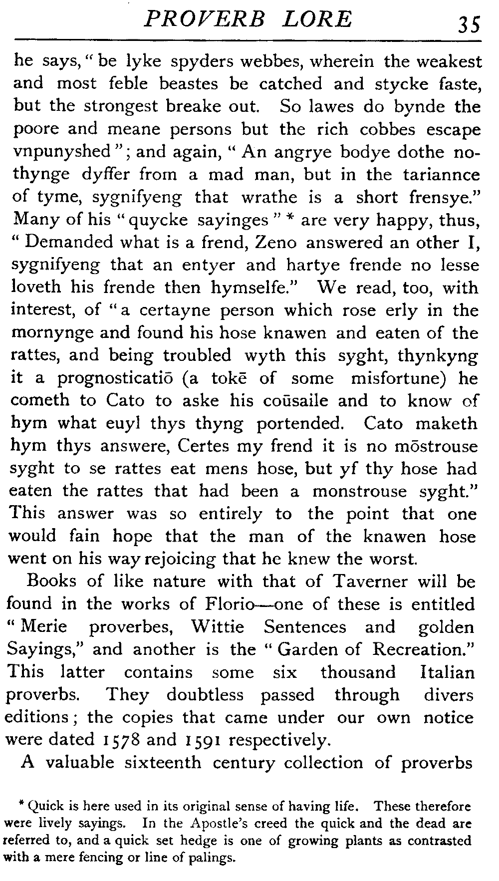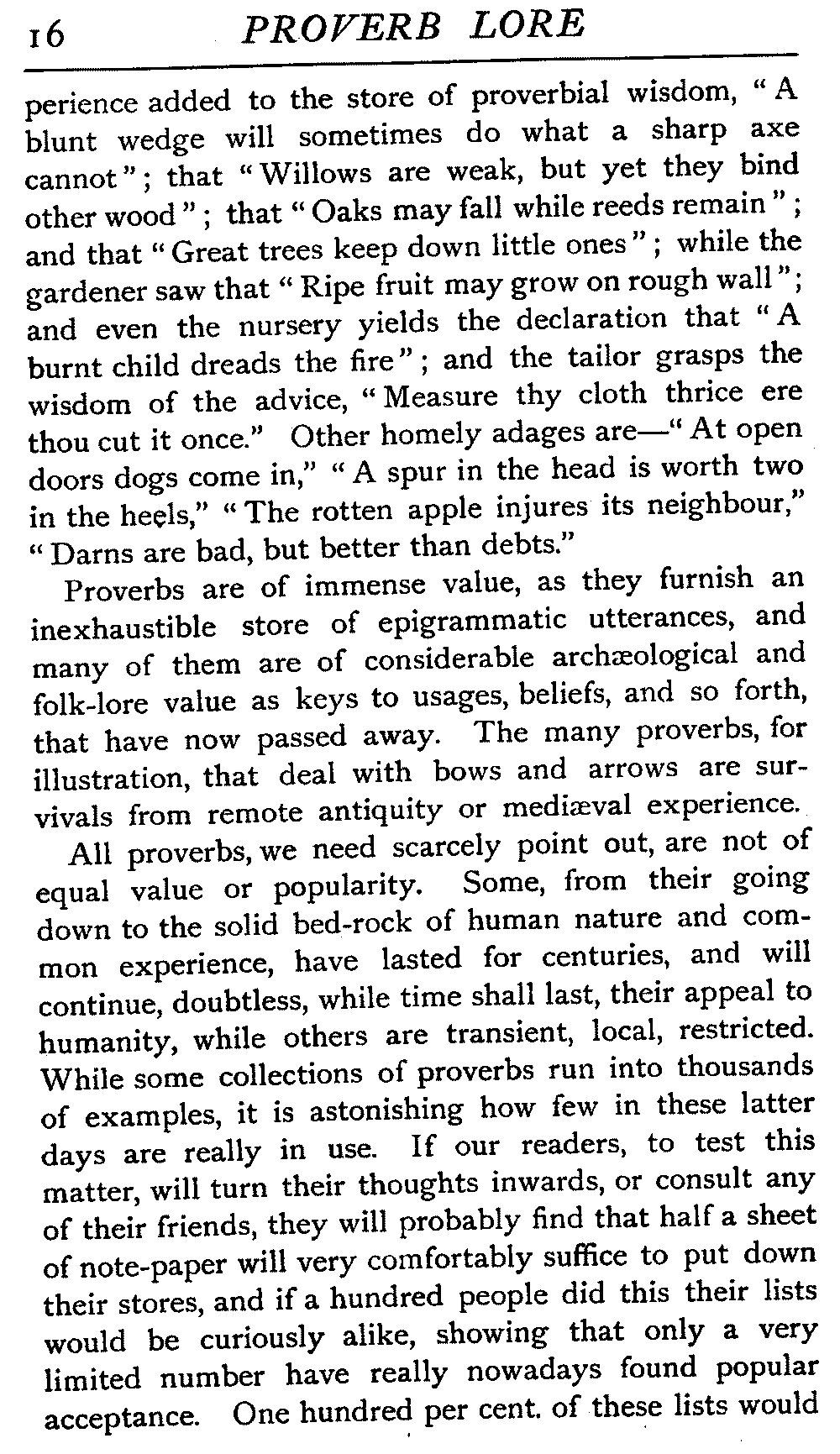 Proverbs are of immense value, as they furnish an inexhaustible store of epigrammatic utterances, and many of them are of considerable archæological and folk-lore value as keys to usages, beliefs, and so forth, that have now passed away. The many proverbs, for illustration, that deal with bows and arrows are survivals from remote antiquity or mediæval experience.