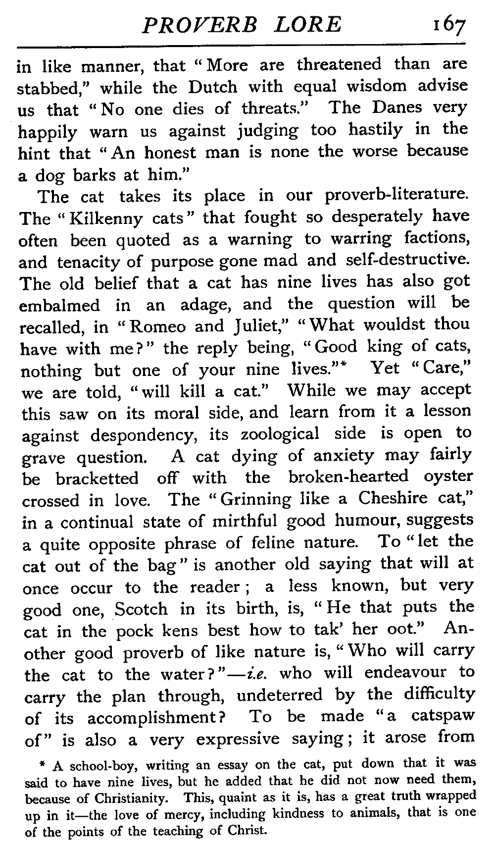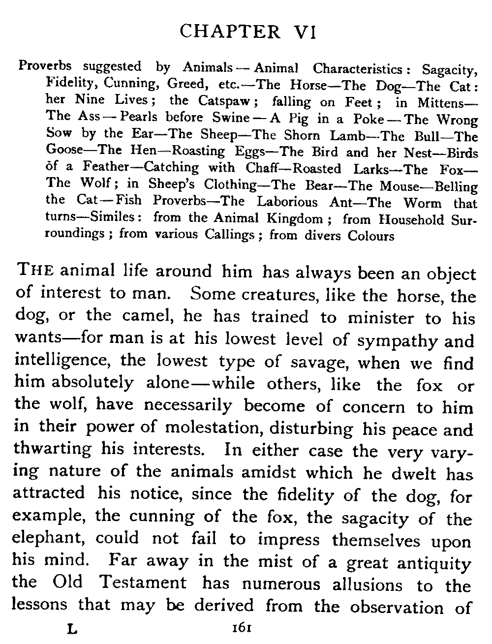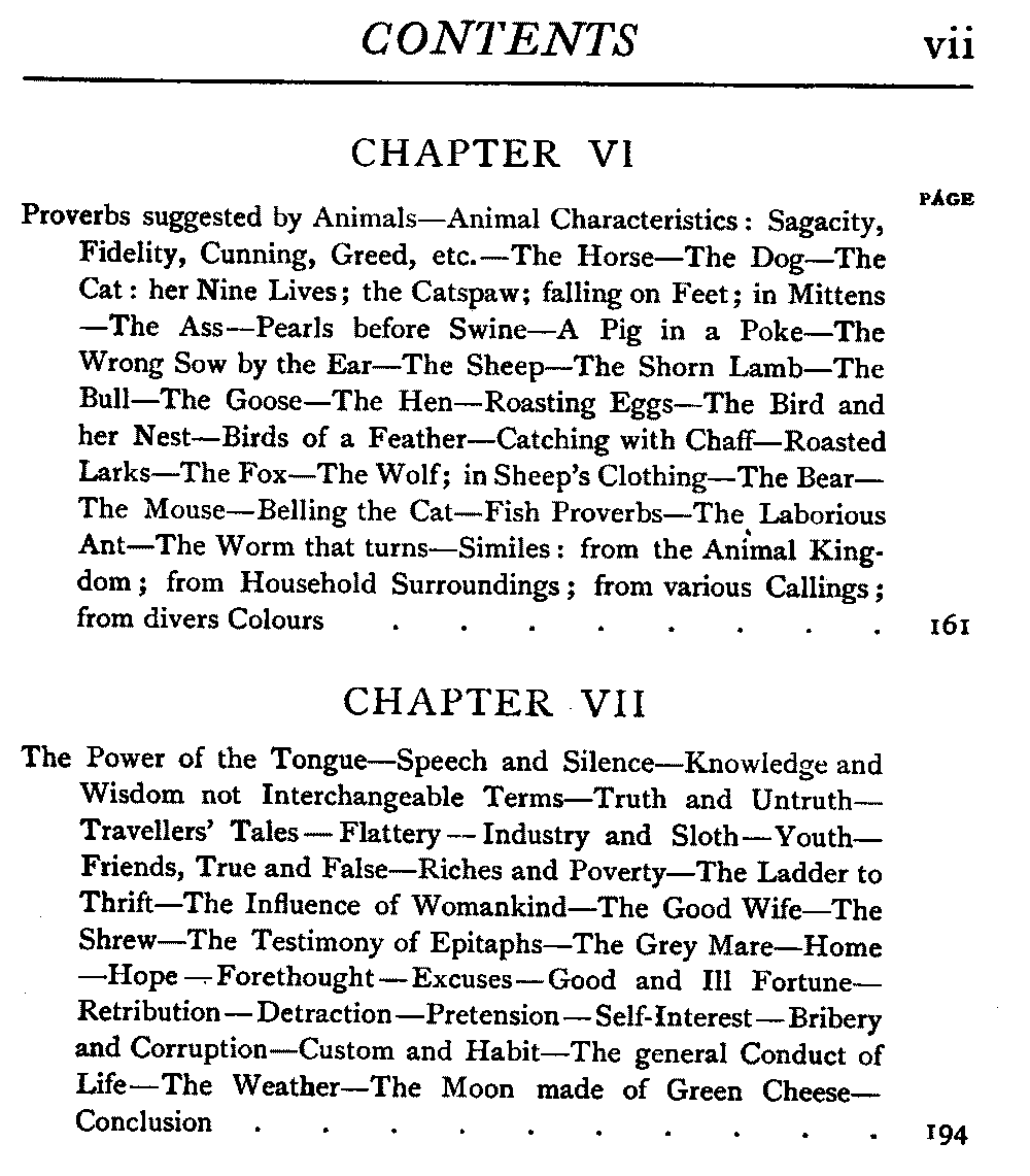 | Proverbs suggested by Animals—Animal Characteristics: Sagacity, Fidelity, Cunning, Greed, etc.—The Horse—The Dog—The Cat: her Nine Lives; the Catspaw; falling on Feet; in Mittens—The Ass—Pearls before Swine—A Pig in a Poke—The Wrong Sow by the Ear—The Sheep—The Shorn Lamb—The Bull—The Goose—The Hen—Roasting Eggs—The Bird and her Nest—Birds of a Feather—Catching with Chaff—Roasted Larks—The Fox—The Wolf; in Sheep's Clothing—The Bear—The Mouse—Belling the Cat—Fish Proverbs—The Laborious Ant—The Worm that turns—Similes: from the Animal Kingdom; from Household Surroundings; from various Callings; from divers Colours | 161 |