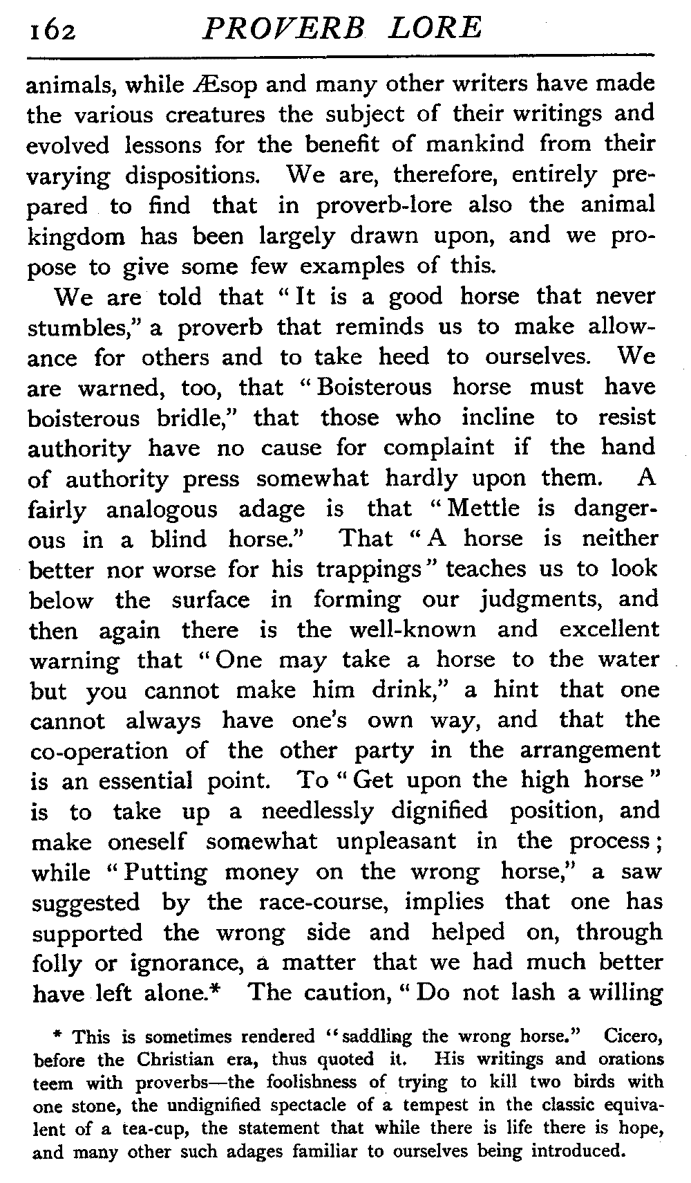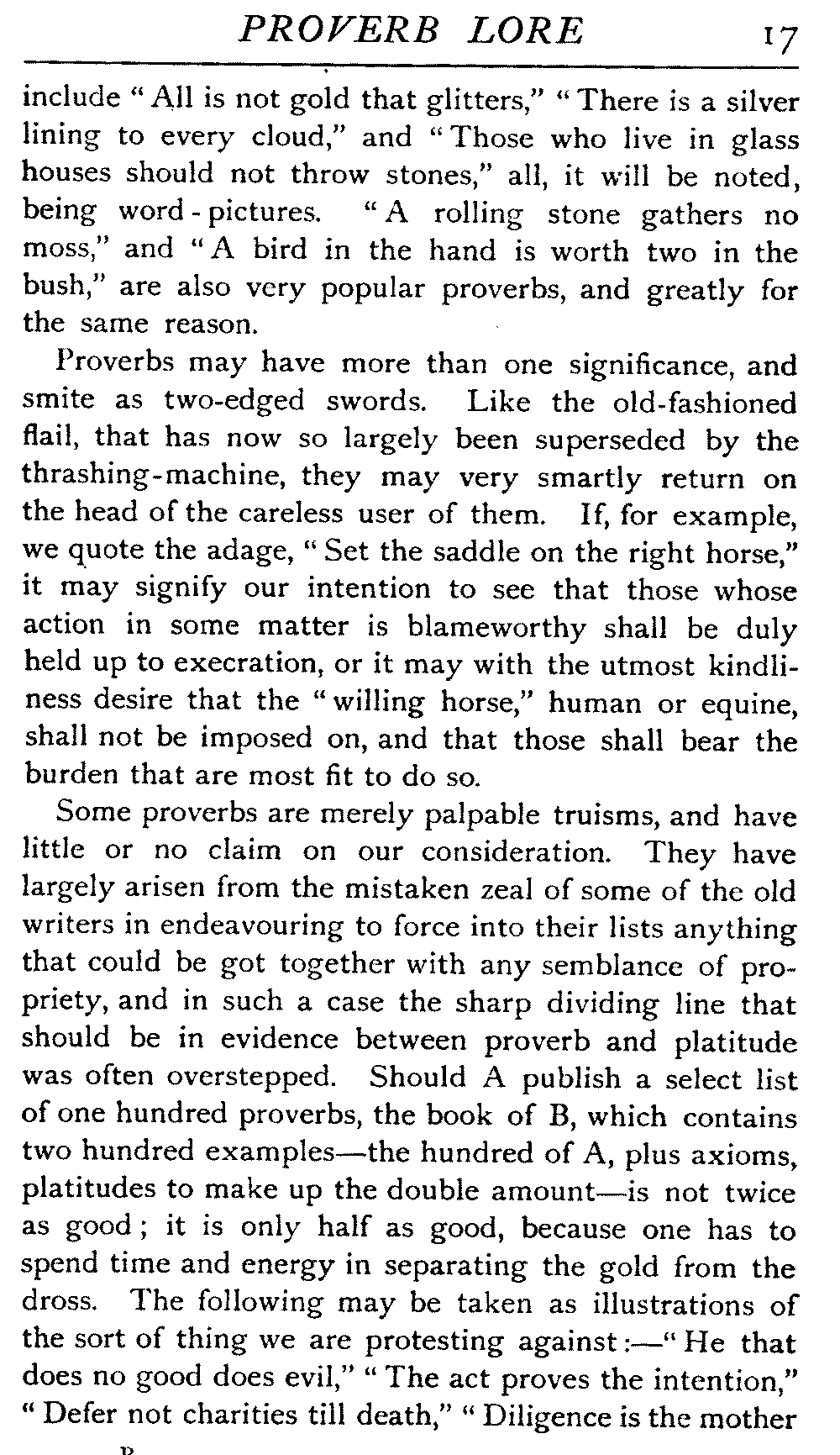 Proverbs may have more than one significance, and smite as two-edged swords. Like the old-fashioned flail, that has now so largely been superseded by the thrashing-machine, they may very smartly return on the head of the careless user of them. If, for example, we quote the adage, "Set the saddle on the right horse," it may signify our intention to see that those whose action in some matter is blameworthy shall be duly held up to execration, or it may with the utmost kindliness desire that the "willing horse," human or equine, shall not be imposed on, and that those shall bear the burden that are most fit to do so.