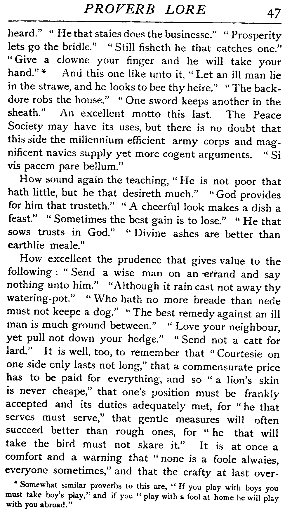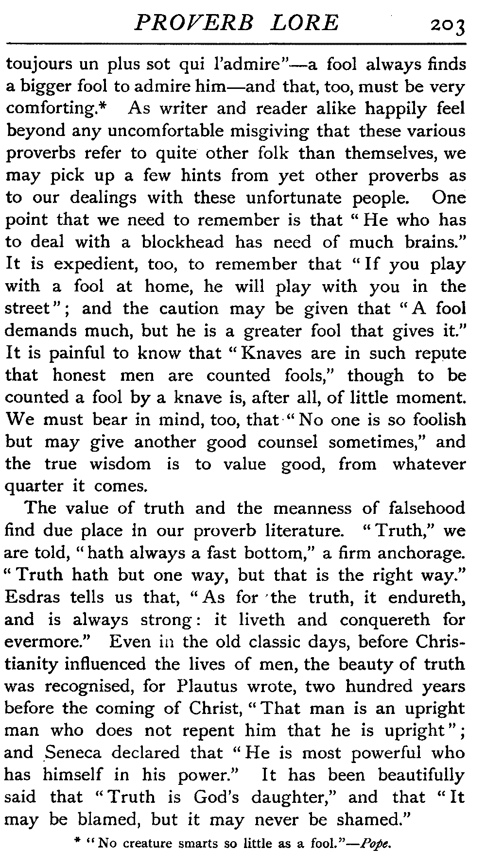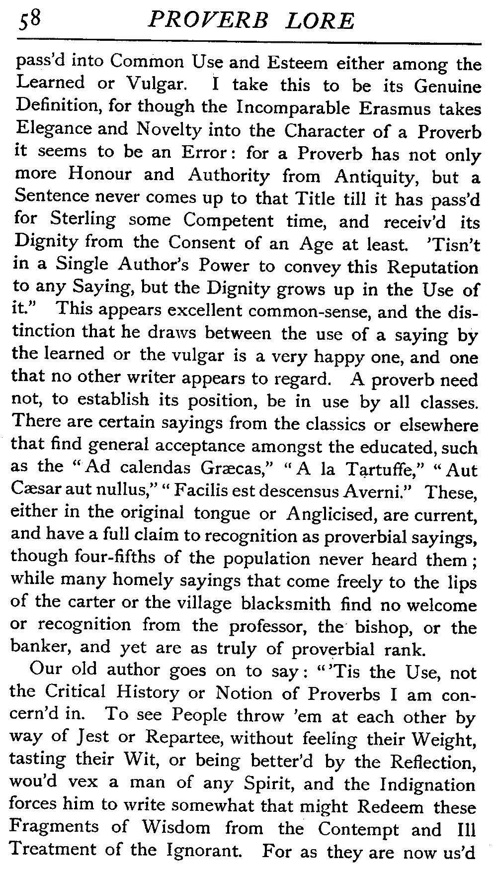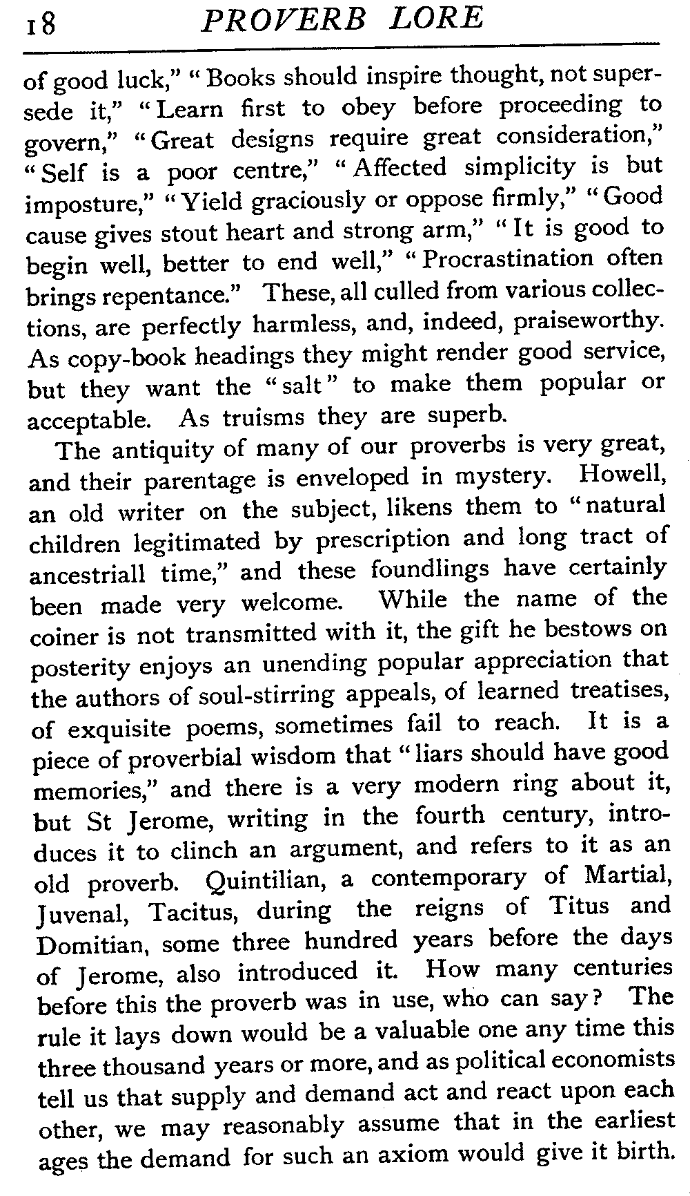 The antiquity of many of our proverbs is very great, and their parentage is enveloped in mystery. Howell, an old writer on the subject, likens them to "natural children legitimated by prescription and long tract of ancestriall time," and these foundlings have certainly been made very welcome. While the name of the coiner is not transmitted with it, the gift he bestows on posterity enjoys an unending popular appreciation that the authors of soul-stirring appeals, of learned treatises, of exquisite poems, sometimes fail to reach. It is a piece of proverbial wisdom that "liars should have good memories," and there is a very modern ring about it, but St Jerome, writing in the fourth century, introduces it to clinch an argument, and refers to it as an old proverb. Quintilian, a contemporary of Martial, Juvenal, Tacitus, during the reigns of Titus and Domitian, some three hundred years before the days of Jerome, also introduced it. How many centuries before this the proverb was in use, who can say? The rule it lays down would be a valuable one any time this three thousand years or more, and as political economists tell us that supply and demand act and react upon each other, we may reasonably assume that in the earliest ages the demand for such an axiom would give it birth. [19]There is a homely ring in the saying that "He who lies down with dogs will rise up with fleas," and we could well imagine it starting into circulation somewhere about the time of our great-grandfathers, when manners were a little coarser, or at all events, a little more coarsely expressed, and when, without circumlocution, a spade was a spade; but over eighteen centuries ago Seneca quoted this proverb, and we find it in his writings in all its homely directness—"Qui cum canibus concumbunt cum pulicibus surgent."