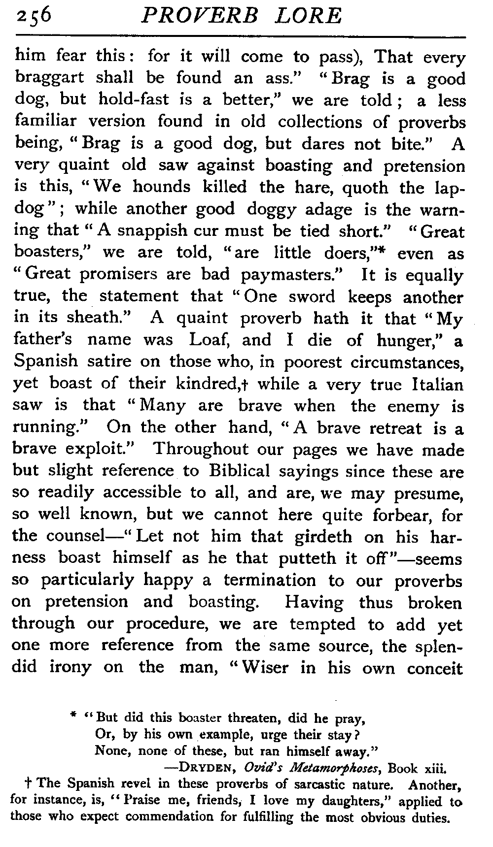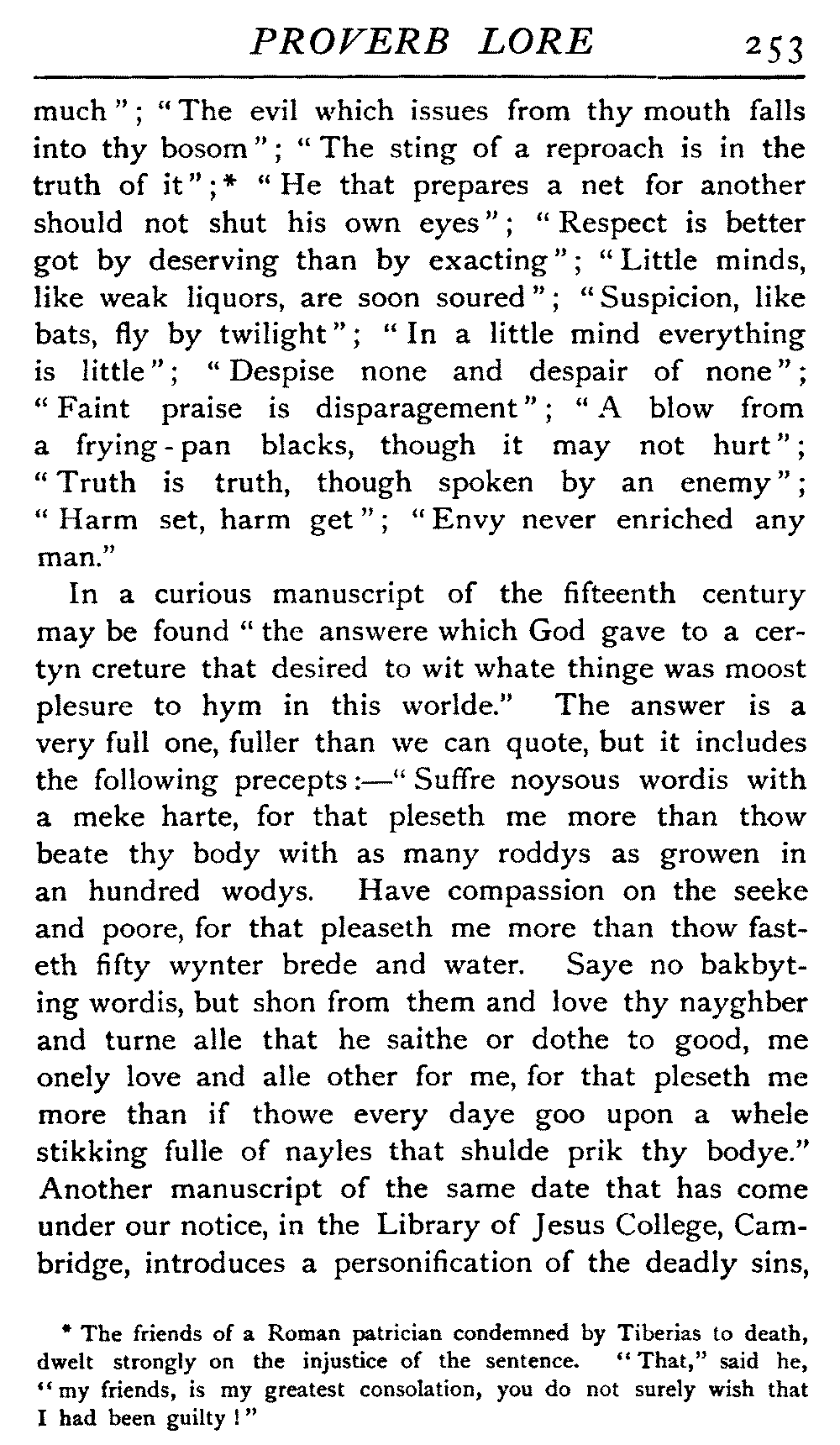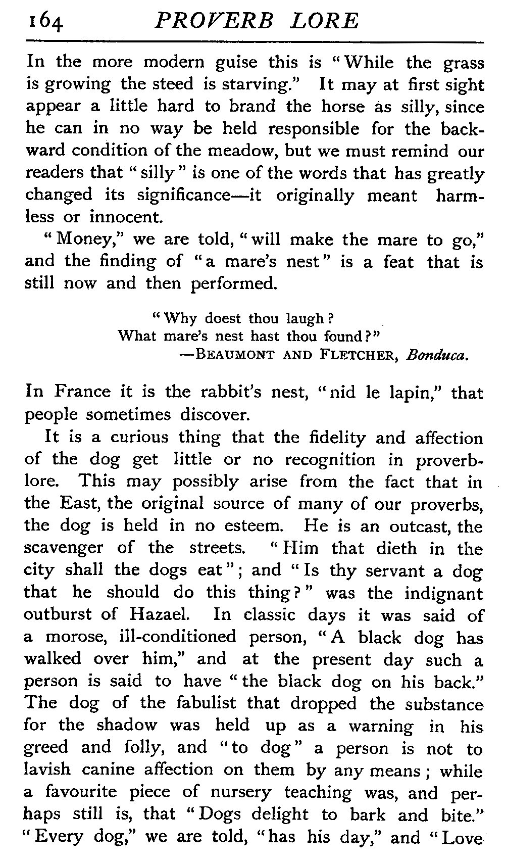 The antiquity of many of our proverbs is very great, and their parentage is enveloped in mystery. Howell, an old writer on the subject, likens them to "natural children legitimated by prescription and long tract of ancestriall time," and these foundlings have certainly been made very welcome. While the name of the coiner is not transmitted with it, the gift he bestows on posterity enjoys an unending popular appreciation that the authors of soul-stirring appeals, of learned treatises, of exquisite poems, sometimes fail to reach. It is a piece of proverbial wisdom that "liars should have good memories," and there is a very modern ring about it, but St Jerome, writing in the fourth century, introduces it to clinch an argument, and refers to it as an old proverb. Quintilian, a contemporary of Martial, Juvenal, Tacitus, during the reigns of Titus and Domitian, some three hundred years before the days of Jerome, also introduced it. How many centuries before this the proverb was in use, who can say? The rule it lays down would be a valuable one any time this three thousand years or more, and as political economists tell us that supply and demand act and react upon each other, we may reasonably assume that in the earliest ages the demand for such an axiom would give it birth. [19]There is a homely ring in the saying that "He who lies down with dogs will rise up with fleas," and we could well imagine it starting into circulation somewhere about the time of our great-grandfathers, when manners were a little coarser, or at all events, a little more coarsely expressed, and when, without circumlocution, a spade was a spade; but over eighteen centuries ago Seneca quoted this proverb, and we find it in his writings in all its homely directness—"Qui cum canibus concumbunt cum pulicibus surgent."