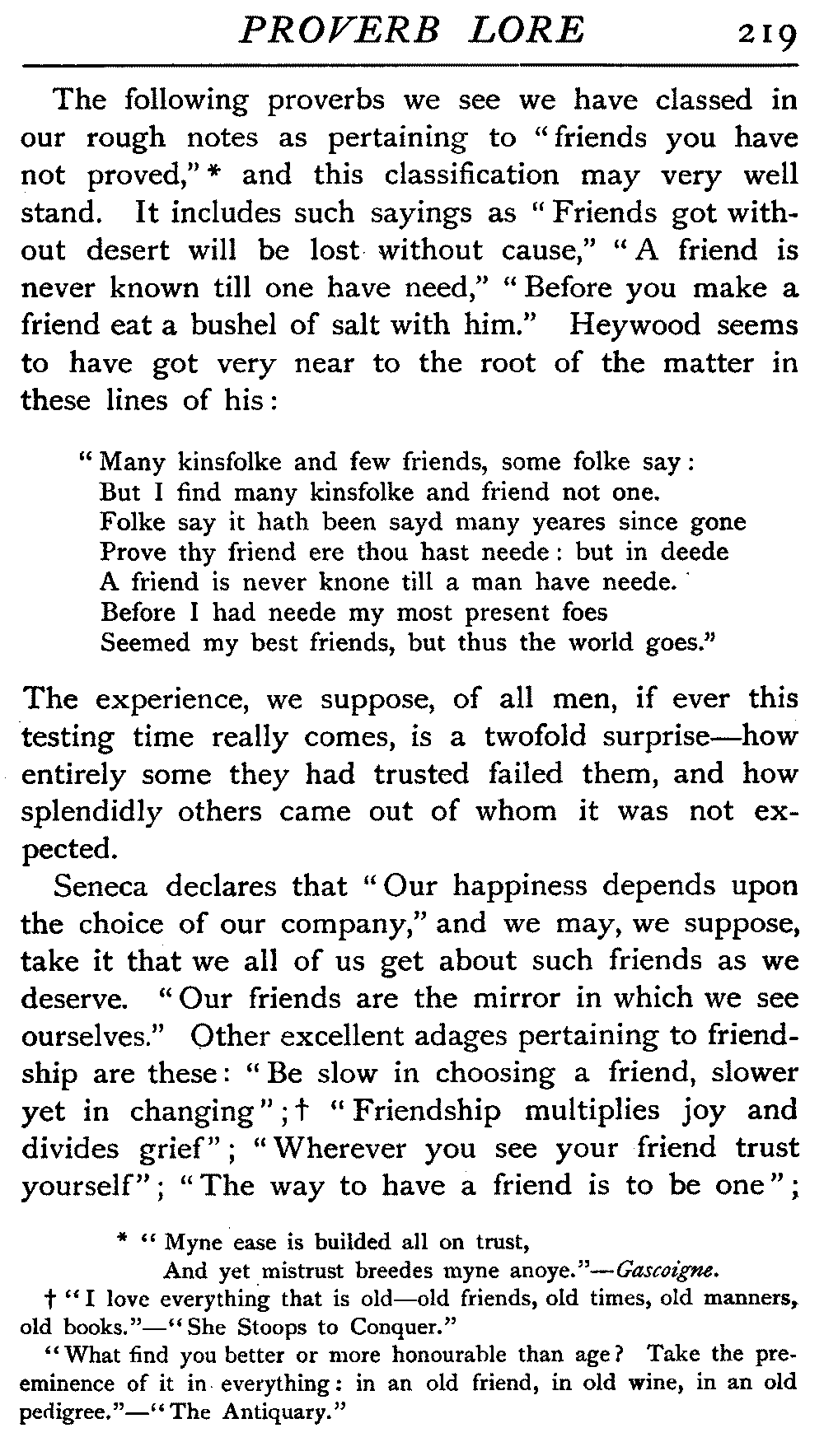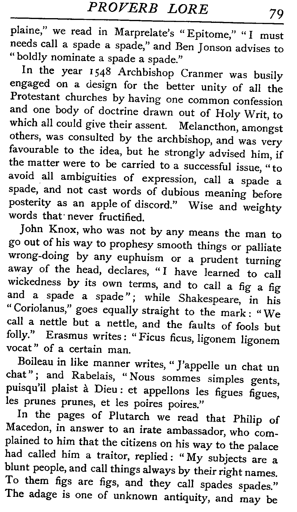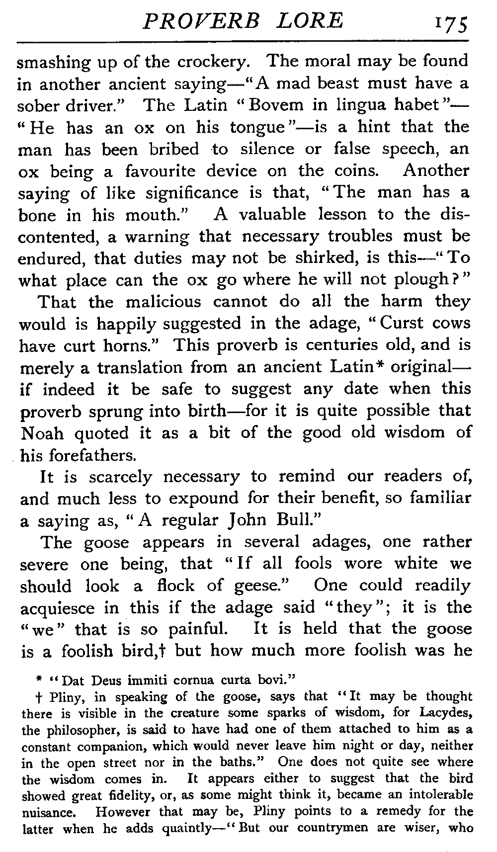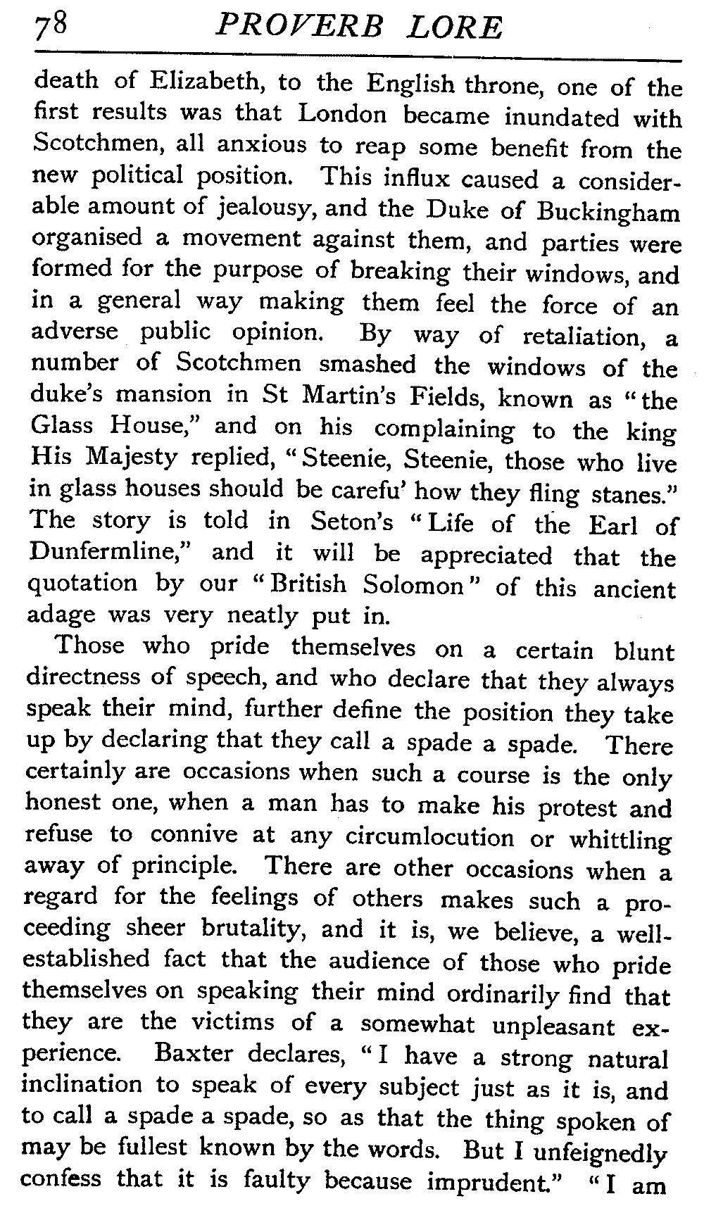 The antiquity of many of our proverbs is very great, and their parentage is enveloped in mystery. Howell, an old writer on the subject, likens them to "natural children legitimated by prescription and long tract of ancestriall time," and these foundlings have certainly been made very welcome. While the name of the coiner is not transmitted with it, the gift he bestows on posterity enjoys an unending popular appreciation that the authors of soul-stirring appeals, of learned treatises, of exquisite poems, sometimes fail to reach. It is a piece of proverbial wisdom that "liars should have good memories," and there is a very modern ring about it, but St Jerome, writing in the fourth century, introduces it to clinch an argument, and refers to it as an old proverb. Quintilian, a contemporary of Martial, Juvenal, Tacitus, during the reigns of Titus and Domitian, some three hundred years before the days of Jerome, also introduced it. How many centuries before this the proverb was in use, who can say? The rule it lays down would be a valuable one any time this three thousand years or more, and as political economists tell us that supply and demand act and react upon each other, we may reasonably assume that in the earliest ages the demand for such an axiom would give it birth. [19]There is a homely ring in the saying that "He who lies down with dogs will rise up with fleas," and we could well imagine it starting into circulation somewhere about the time of our great-grandfathers, when manners were a little coarser, or at all events, a little more coarsely expressed, and when, without circumlocution, a spade was a spade; but over eighteen centuries ago Seneca quoted this proverb, and we find it in his writings in all its homely directness—"Qui cum canibus concumbunt cum pulicibus surgent."