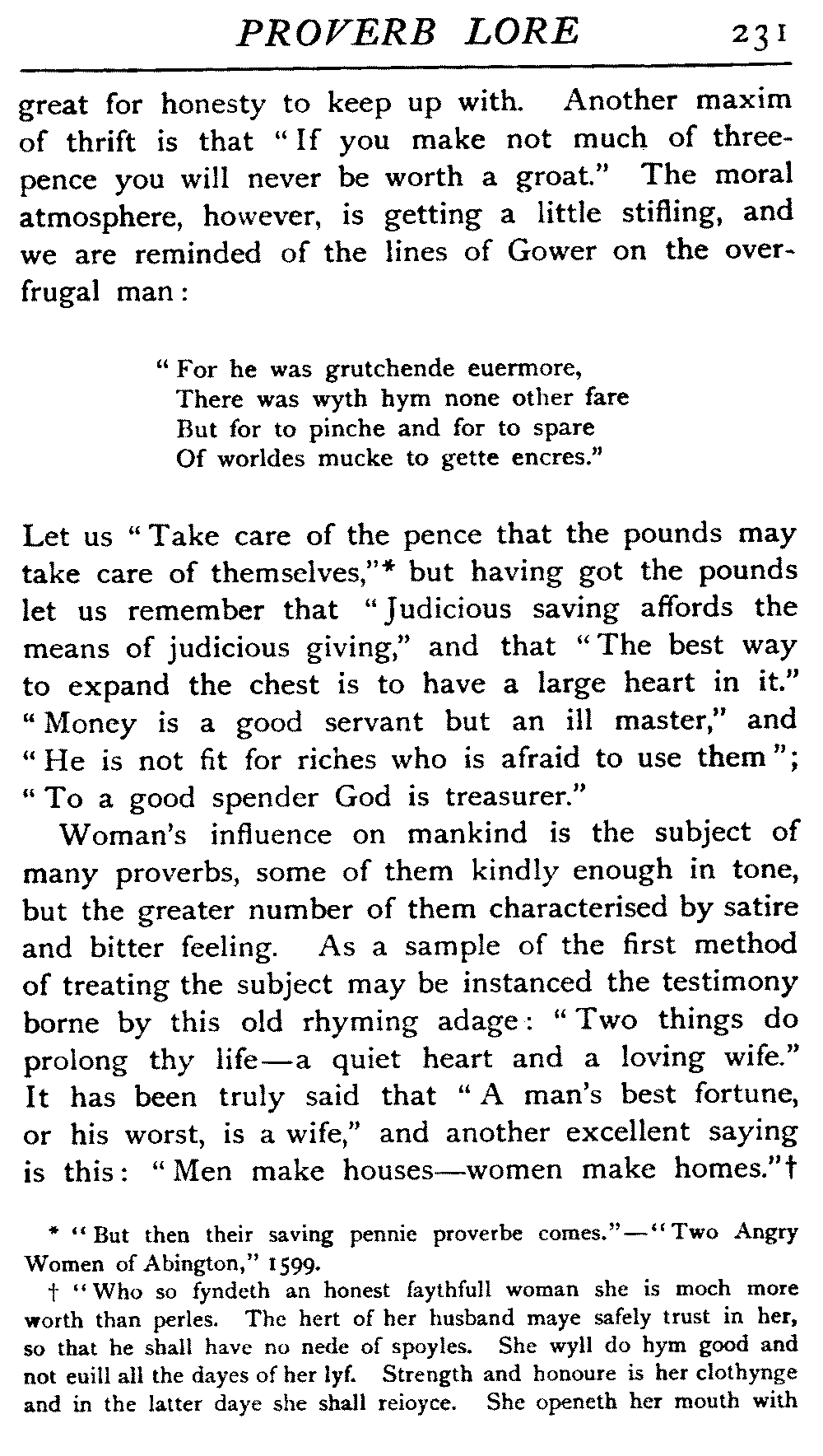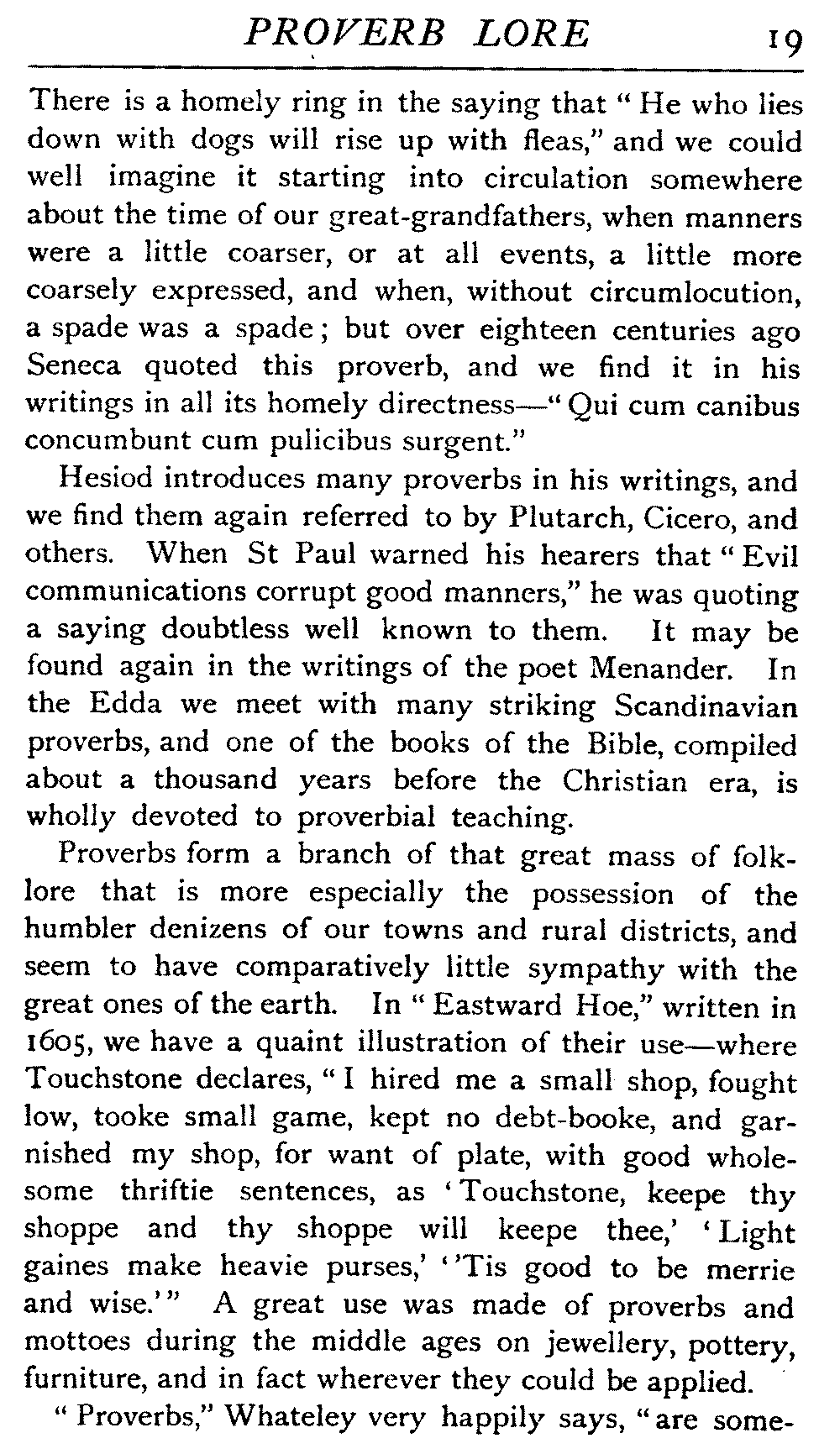 Proverbs form a branch of that great mass of folk-lore that is more especially the possession of the humbler denizens of our towns and rural districts, and seem to have comparatively little sympathy with the great ones of the earth. In "Eastward Hoe," written in 1605, we have a quaint illustration of their use—where Touchstone declares, "I hired me a small shop, fought low, tooke small game, kept no debt-booke, and garnished my shop, for want of plate, with good wholesome thriftie sentences, as 'Touchstone, keepe thy shoppe and thy shoppe will keepe thee,' 'Light gaines make heavie purses,' ''Tis good to be merrie and wise.'" A great use was made of proverbs and mottoes during the middle ages on jewellery, pottery, furniture, and in fact wherever they could be applied.