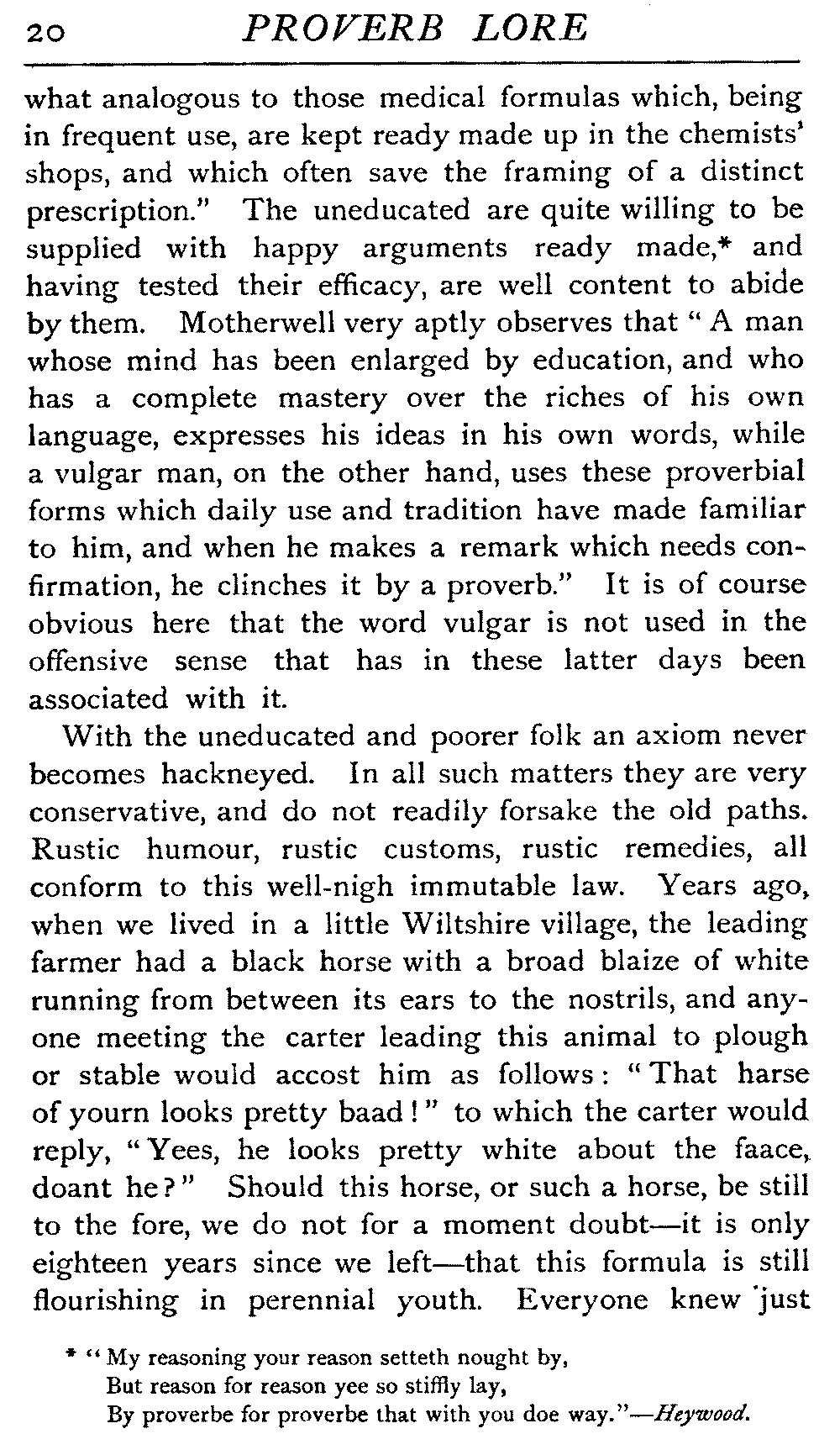 With the uneducated and poorer folk an axiom never becomes hackneyed. In all such matters they are very conservative, and do not readily forsake the old paths. Rustic humour, rustic customs, rustic remedies, all conform to this well-nigh immutable law. Years ago, when we lived in a little Wiltshire village, the leading farmer had a black horse with a broad blaize of white running from between its ears to the nostrils, and anyone meeting the carter leading this animal to plough or stable would accost him as follows: "That harse of yourn looks pretty baad!" to which the carter would reply, "Yees, he looks pretty white about the faace, doant he?" Should this horse, or such a horse, be still to the fore, we do not for a moment doubt—it is only eighteen years since we left—that this formula is still flourishing in perennial youth. Everyone knew just [21]what to say and when to slowly chuckle, and so everybody was entirely satisfied, and the sally was a guaranteed success. It had ripened with age, and had long passed the troublesome experimental stage.