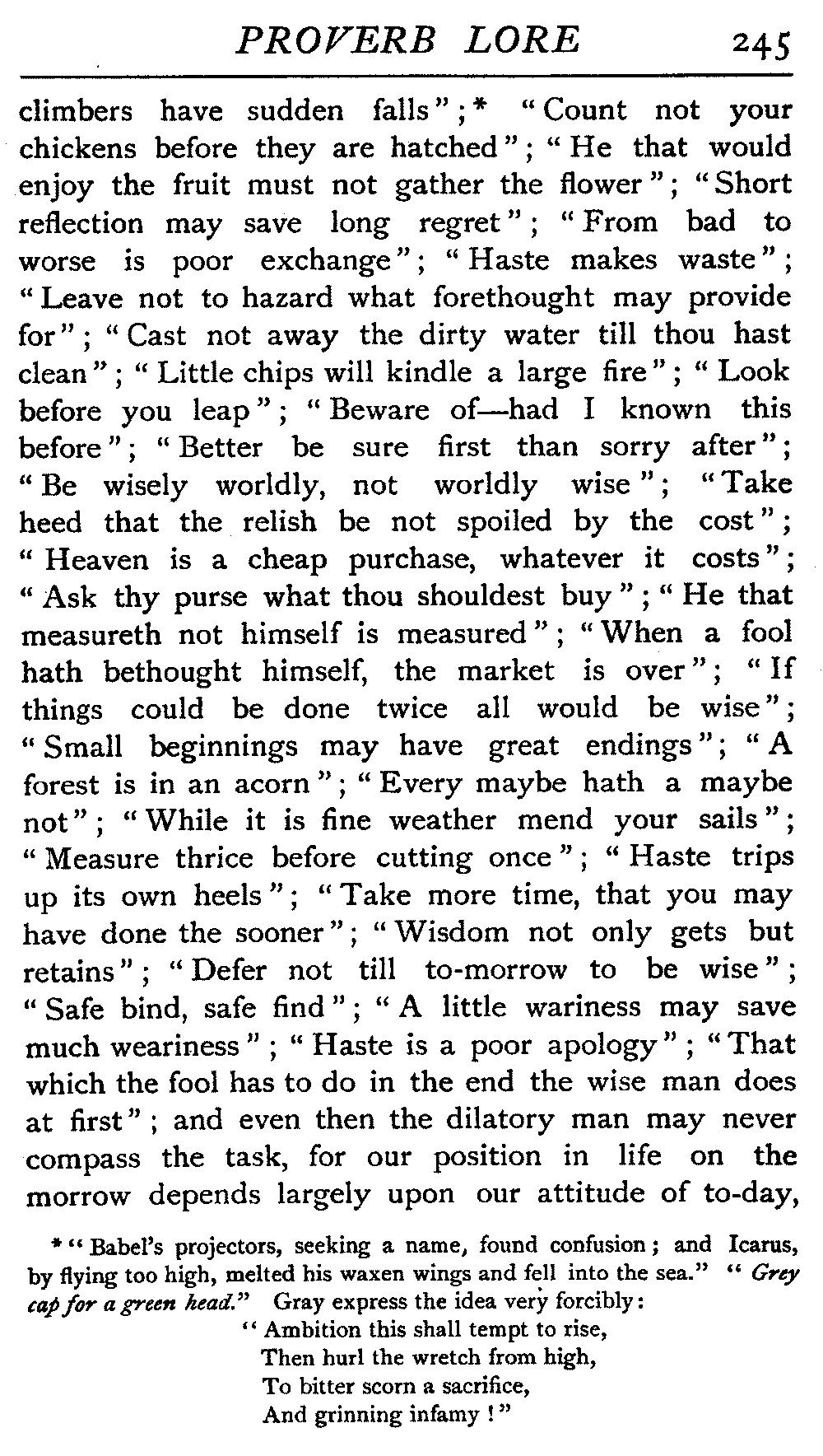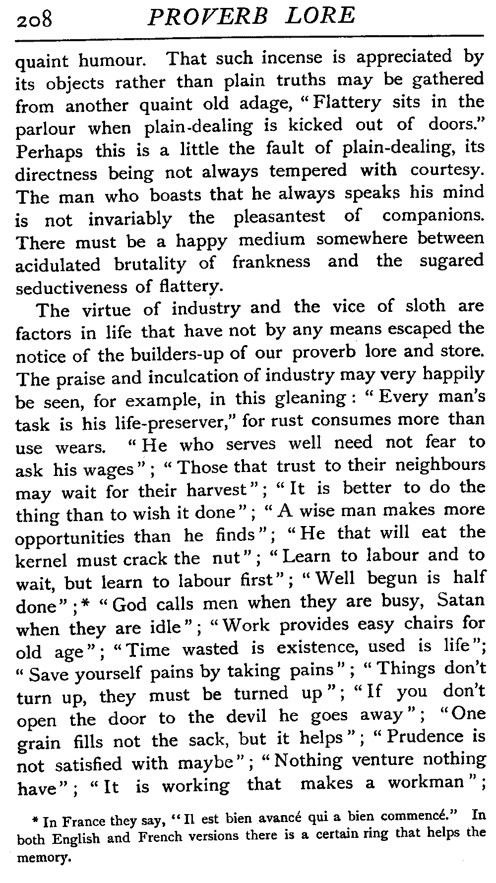 Some proverbs are merely palpable truisms, and have little or no claim on our consideration. They have largely arisen from the mistaken zeal of some of the old writers in endeavouring to force into their lists anything that could be got together with any semblance of propriety, and in such a case the sharp dividing line that should be in evidence between proverb and platitude was often overstepped. Should A publish a select list of one hundred proverbs, the book of B, which contains two hundred examples—the hundred of A, plus axioms, platitudes to make up the double amount—is not twice as good; it is only half as good, because one has to spend time and energy in separating the gold from the dross. The following may be taken as illustrations of the sort of thing we are protesting against:—"He that does no good does evil," "The act proves the intention," "Defer not charities till death," "Diligence is the mother [18]of good luck," "Books should inspire thought, not supersede it," "Learn first to obey before proceeding to govern," "Great designs require great consideration," "Self is a poor centre," "Affected simplicity is but imposture," "Yield graciously or oppose firmly," "Good cause gives stout heart and strong arm," "It is good to begin well, better to end well," "Procrastination often brings repentance." These, all culled from various collections, are perfectly harmless, and, indeed, praiseworthy. As copy-book headings they might render good service, but they want the "salt" to make them popular or acceptable. As truisms they are superb.