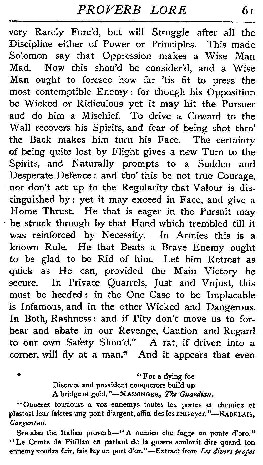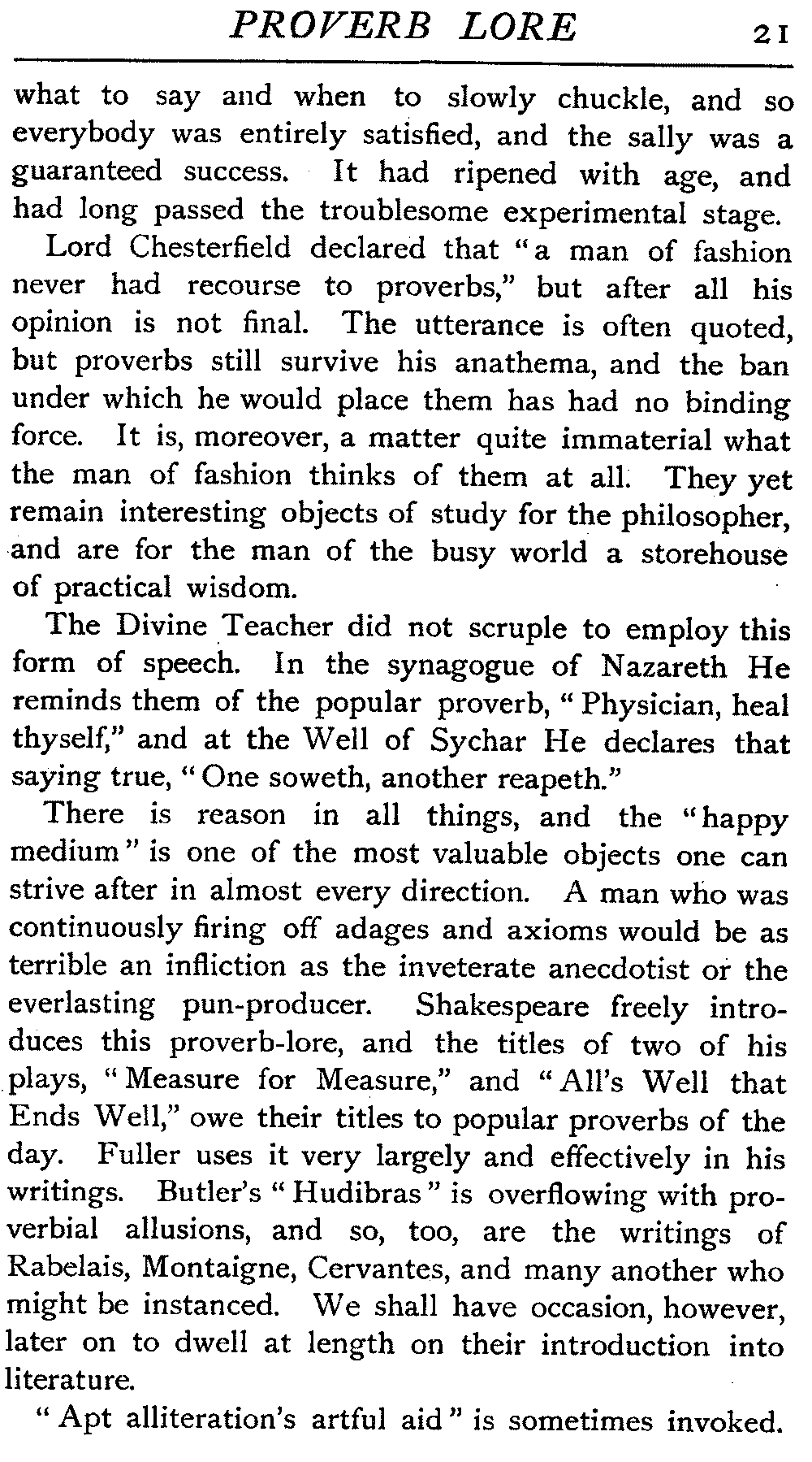 There is reason in all things, and the "happy medium" is one of the most valuable objects one can strive after in almost every direction. A man who was continuously firing off adages and axioms would be as terrible an infliction as the inveterate anecdotist or the everlasting pun-producer. Shakespeare freely introduces this proverb-lore, and the titles of two of his plays, "Measure for Measure," and "All's Well that Ends Well," owe their titles to popular proverbs of the day. Fuller uses it very largely and effectively in his writings. Butler's "Hudibras" is overflowing with proverbial allusions, and so, too, are the writings of Rabelais, Montaigne, Cervantes, and many another who might be instanced. We shall have occasion, however, later on to dwell at length on their introduction into literature.