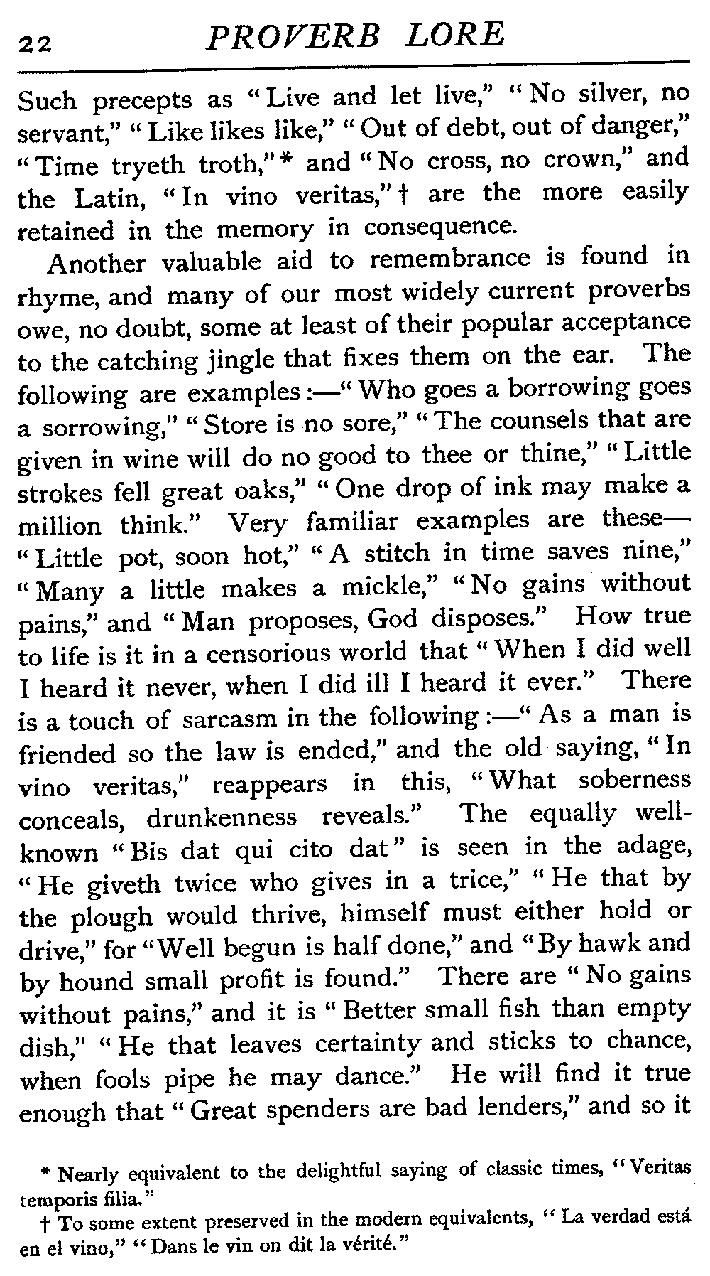 "Apt alliteration's artful aid" is sometimes invoked. [22]Such precepts as "Live and let live," "No silver, no servant," "Like likes like," "Out of debt, out of danger," "Time tryeth troth,"[22:A] and "No cross, no crown," and the Latin, "In vino veritas,"[22:B] are the more easily retained in the memory in consequence.
