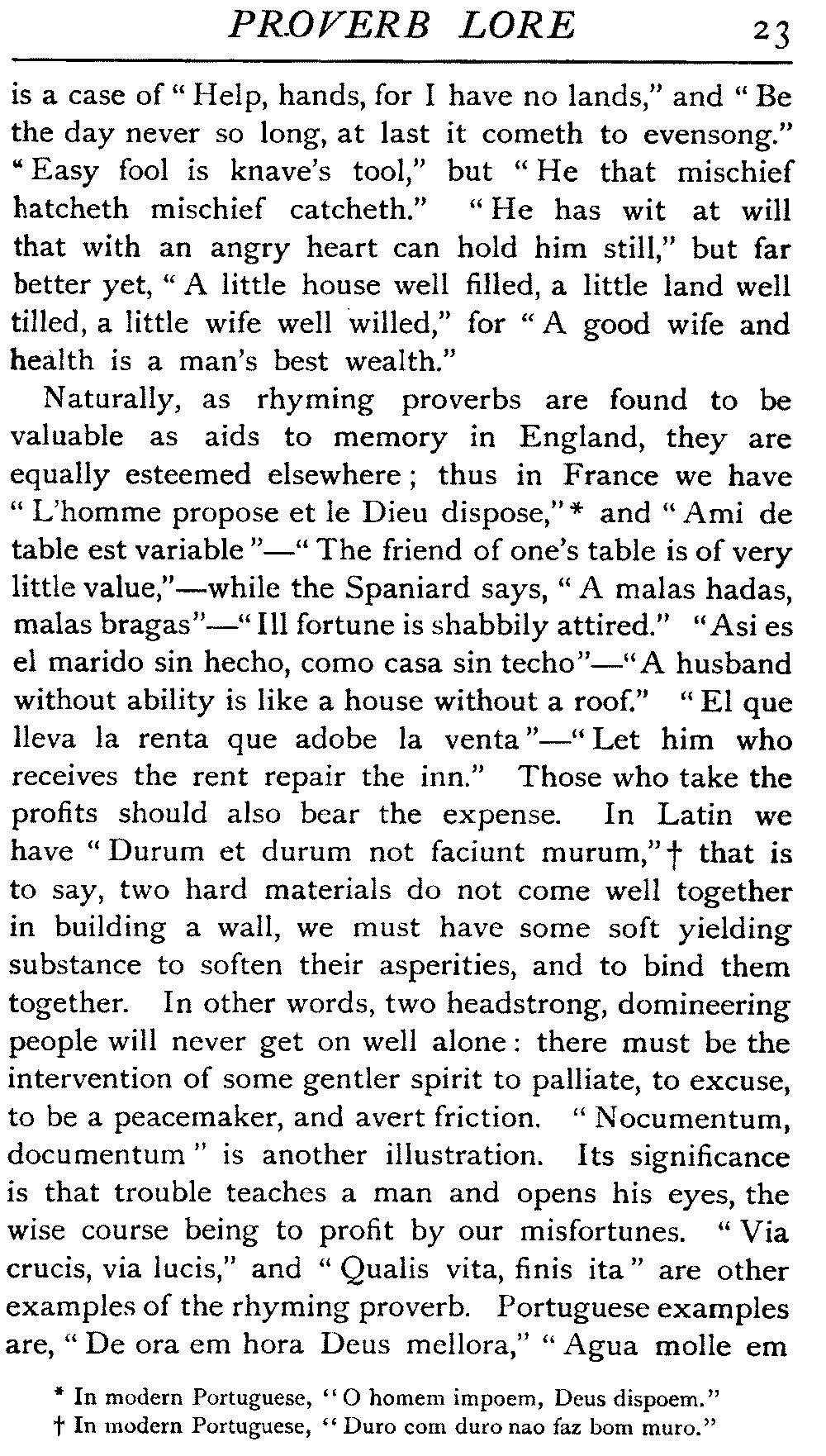 Naturally, as rhyming proverbs are found to be valuable as aids to memory in England, they are equally esteemed elsewhere; thus in France we have "L'homme propose et le Dieu dispose,"[23:A] and "Ami de table est variable"—"The friend of one's table is of very little value,"—while the Spaniard says, "A malas hadas, malas bragas"—"Ill fortune is shabbily attired." "Asi es el marido sin hecho, como casa sin techo"—"A husband without ability is like a house without a roof." "El que lleva la renta que adobe la venta"—"Let him who receives the rent repair the inn." Those who take the profits should also bear the expense. In Latin we have "Durum et durum non faciunt murum,"[23:B] that is to say, two hard materials do not come well together in building a wall, we must have some soft yielding substance to soften their asperities, and to bind them together. In other words, two headstrong, domineering people will never get on well alone: there must be the intervention of some gentler spirit to palliate, to excuse, to be a peacemaker, and avert friction. "Nocumentum, documentum" is another illustration. Its significance is that trouble teaches a man and opens his eyes, the wise course being to profit by our misfortunes. "Via crucis, via lucis," and "Qualis vita, finis ita" are other examples of the rhyming proverb. Portuguese examples are, "De ora em hora Deus mellora," "Agua molle em [24]pedra dura tanto dà até que fura," "Quem do alheio veste na praça o despe." Greek, German, Italian and other proverbs equally conform to this custom of aiding the memory by a rhyming treatment; but enough has been brought forward to indicate the point.