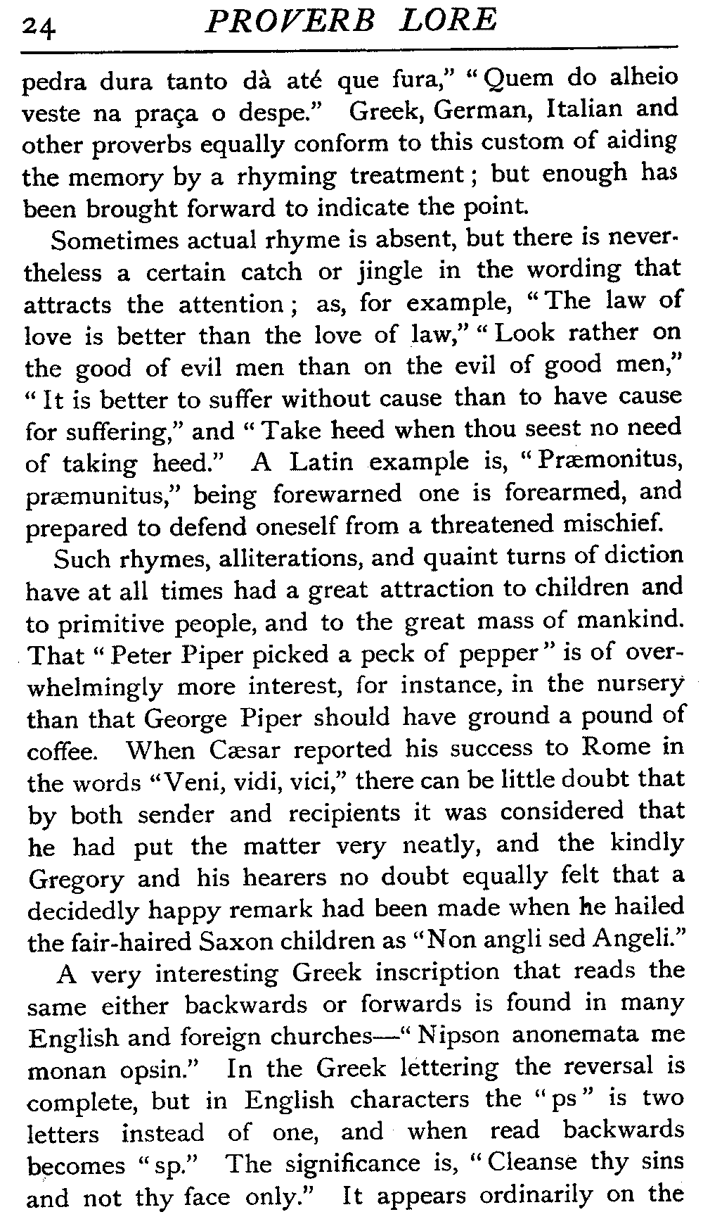 Such rhymes, alliterations, and quaint turns of diction have at all times had a great attraction to children and to primitive people, and to the great mass of mankind. That "Peter Piper picked a peck of pepper" is of overwhelmingly more interest, for instance, in the nursery than that George Piper should have ground a pound of coffee. When Cæsar reported his success to Rome in the words "Veni, vidi, vici," there can be little doubt that by both sender and recipients it was considered that he had put the matter very neatly, and the kindly Gregory and his hearers no doubt equally felt that a decidedly happy remark had been made when he hailed the fair-haired Saxon children as "Non angli sed Angeli."