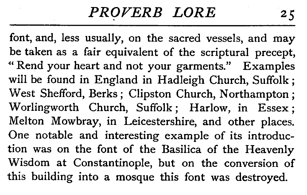 A very interesting Greek inscription that reads the same either backwards or forwards is found in many English and foreign churches—"Nipson anonemata me monan opsin." In the Greek lettering the reversal is complete, but in English characters the "ps" is two letters instead of one, and when read backwards becomes "sp." The significance is, "Cleanse thy sins and not thy face only." It appears ordinarily on the [25]font, and, less usually, on the sacred vessels, and may be taken as a fair equivalent of the scriptural precept, "Rend your heart and not your garments." Examples will be found in England in Hadleigh Church, Suffolk; West Shefford, Berks; Clipston Church, Northampton; Worlingworth Church, Suffolk; Harlow, in Essex; Melton Mowbray, in Leicestershire, and other places. One notable and interesting example of its introduction was on the font of the Basilica of the Heavenly Wisdom at Constantinople, but on the conversion of this building into a mosque this font was destroyed.