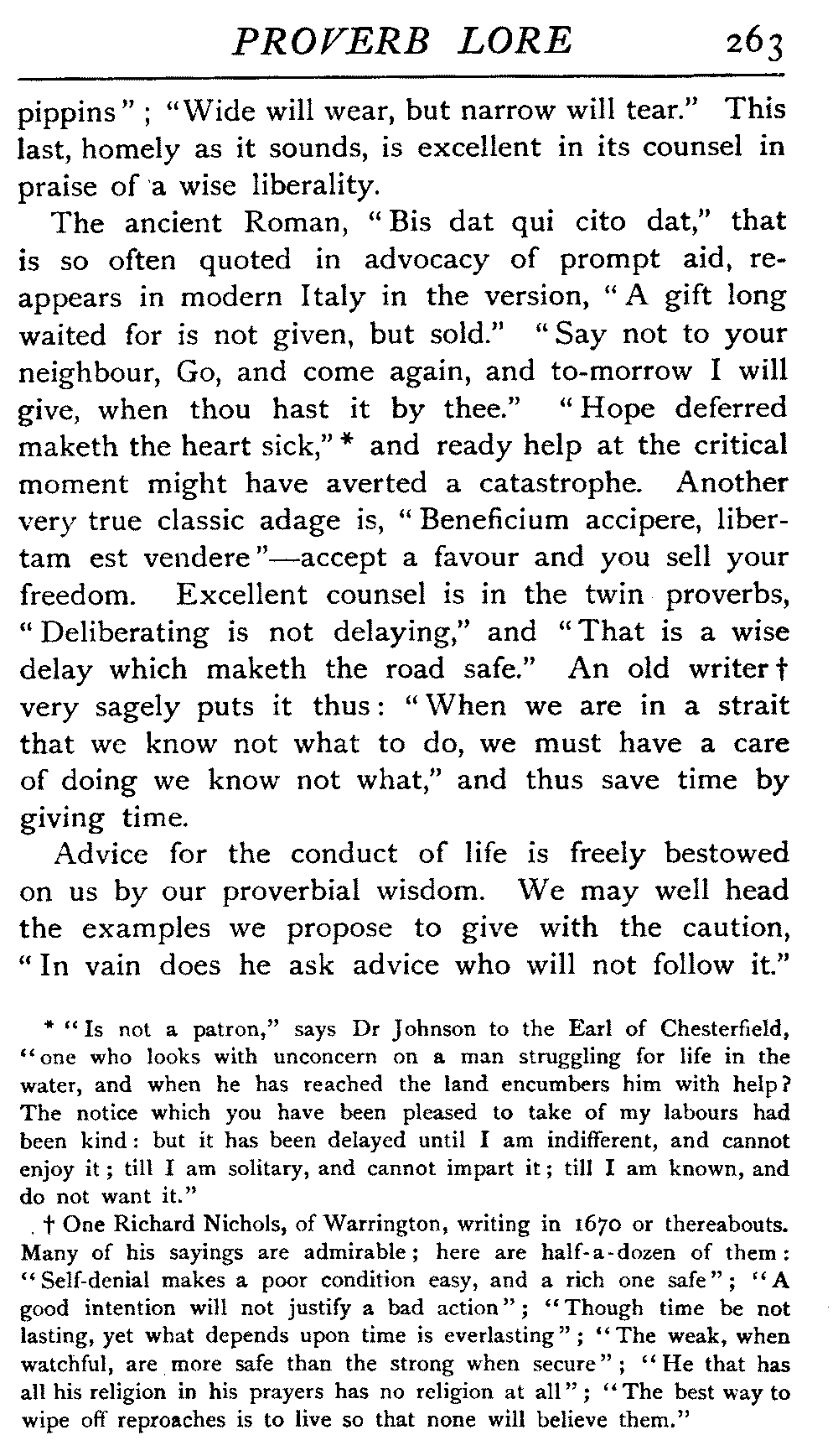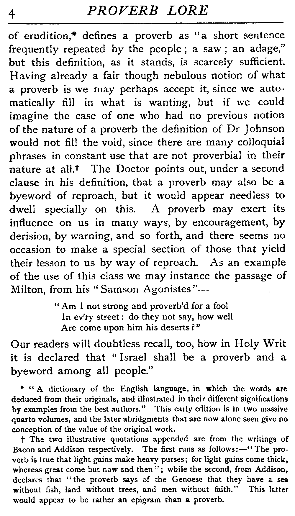 Dr Johnson, in his noble dictionary, a splendid mass [4]of erudition,[4:A] defines a proverb as "a short sentence frequently repeated by the people; a saw; an adage," but this definition, as it stands, is scarcely sufficient. Having already a fair though nebulous notion of what a proverb is we may perhaps accept it, since we automatically fill in what is wanting, but if we could imagine the case of one who had no previous notion of the nature of a proverb the definition of Dr Johnson would not fill the void, since there are many colloquial phrases in constant use that are not proverbial in their nature at all.[4:B] The Doctor points out, under a second clause in his definition, that a proverb may also be a byeword of reproach, but it would appear needless to dwell specially on this. A proverb may exert its influence on us in many ways, by encouragement, by derision, by warning, and so forth, and there seems no occasion to make a special section of those that yield their lesson to us by way of reproach. As an example of the use of this class we may instance the passage of Milton, from his "Samson Agonistes"—