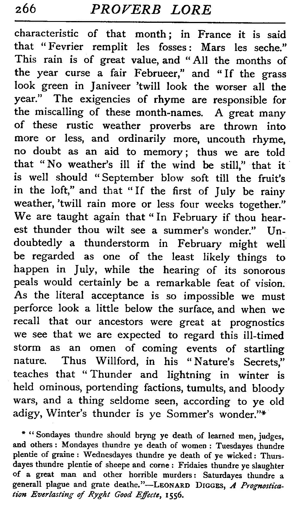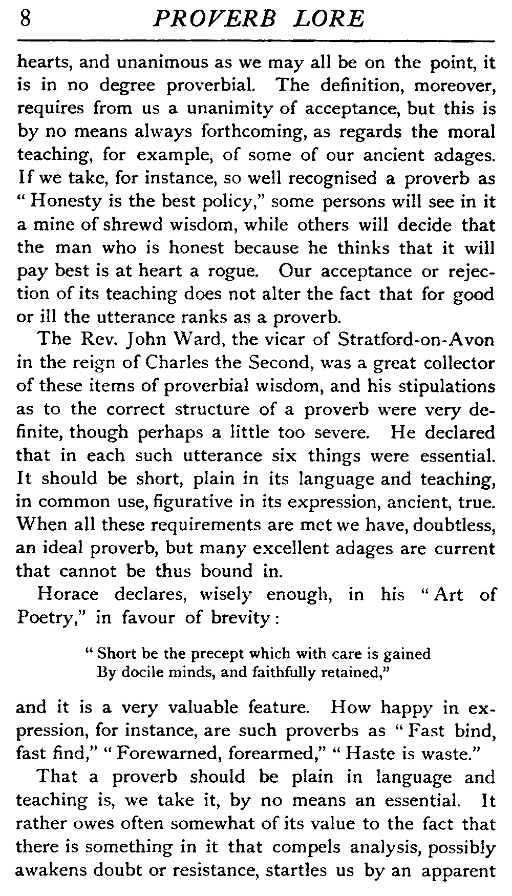 The Rev. John Ward, the vicar of Stratford-on-Avon in the reign of Charles the Second, was a great collector of these items of proverbial wisdom, and his stipulations as to the correct structure of a proverb were very definite, though perhaps a little too severe. He declared that in each such utterance six things were essential. It should be short, plain in its language and teaching, in common use, figurative in its expression, ancient, true. When all these requirements are met we have, doubtless, an ideal proverb, but many excellent adages are current that cannot be thus bound in.