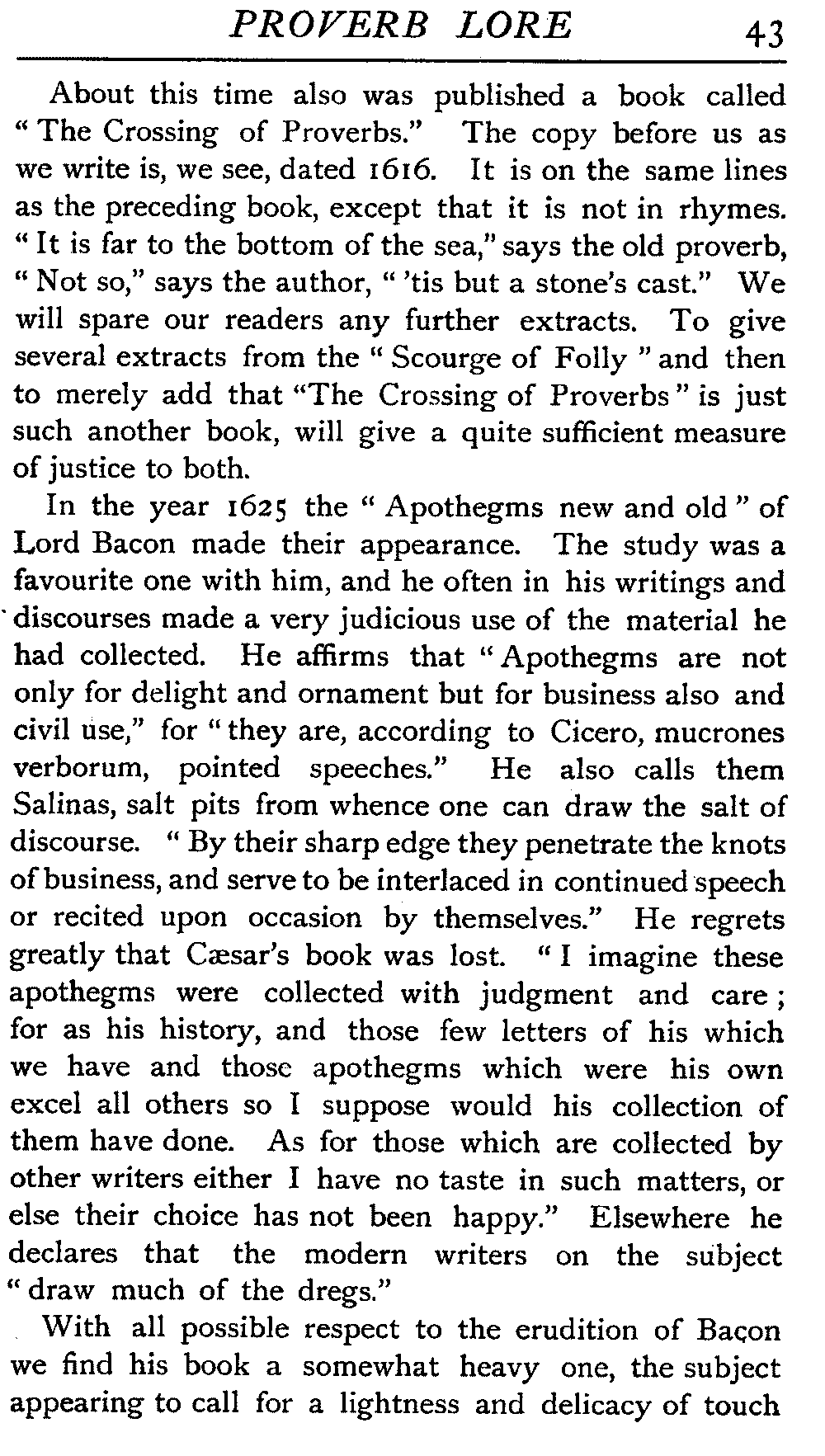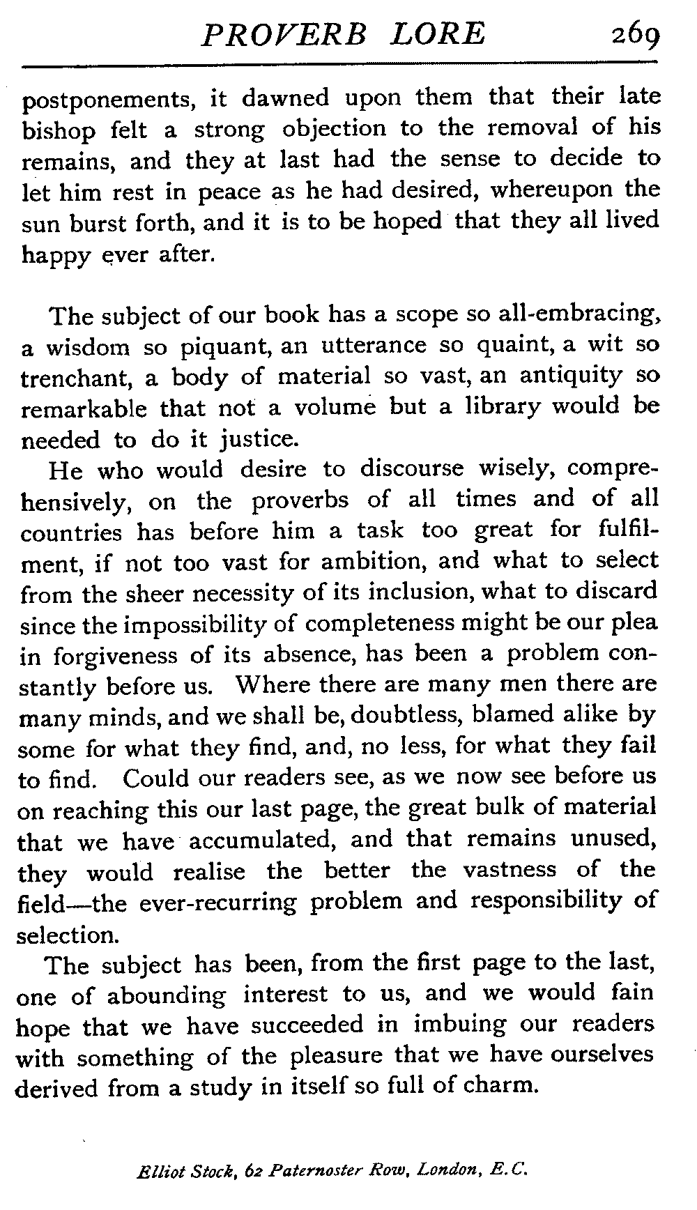 Lord Chesterfield declared that "a man of fashion never had recourse to proverbs," but after all his opinion is not final. The utterance is often quoted, but proverbs still survive his anathema, and the ban under which he would place them has had no binding force. It is, moreover, a matter quite immaterial what the man of fashion thinks of them at all. They yet remain interesting objects of study for the philosopher, and are for the man of the busy world a storehouse of practical wisdom.