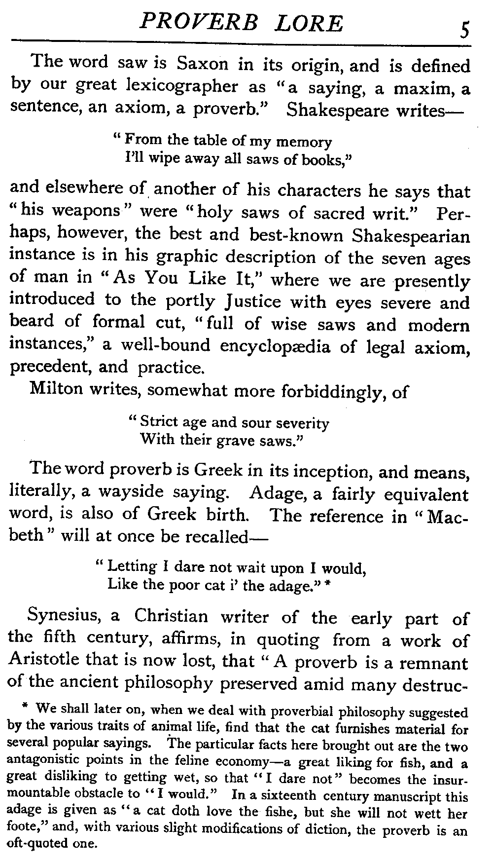 [5] The word saw is Saxon in its origin, and is defined by our great lexicographer as "a saying, a maxim, a sentence, an axiom, a proverb." Shakespeare writes—