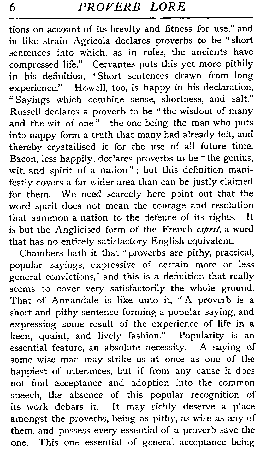 Synesius, a Christian writer of the early part of the fifth century, affirms, in quoting from a work of Aristotle that is now lost, that "A proverb is a remnant of the ancient philosophy preserved amid many destructions [6]on account of its brevity and fitness for use," and in like strain Agricola declares proverbs to be "short sentences into which, as in rules, the ancients have compressed life." Cervantes puts this yet more pithily in his definition, "Short sentences drawn from long experience." Howell, too, is happy in his declaration, "Sayings which combine sense, shortness, and salt." Russell declares a proverb to be "the wisdom of many and the wit of one"—the one being the man who puts into happy form a truth that many had already felt, and thereby crystallised it for the use of all future time. Bacon, less happily, declares proverbs to be "the genius, wit, and spirit of a nation"; but this definition manifestly covers a far wider area than can be justly claimed for them. We need scarcely here point out that the word spirit does not mean the courage and resolution that summon a nation to the defence of its rights. It is but the Anglicised form of the French esprit, a word that has no entirely satisfactory English equivalent.
