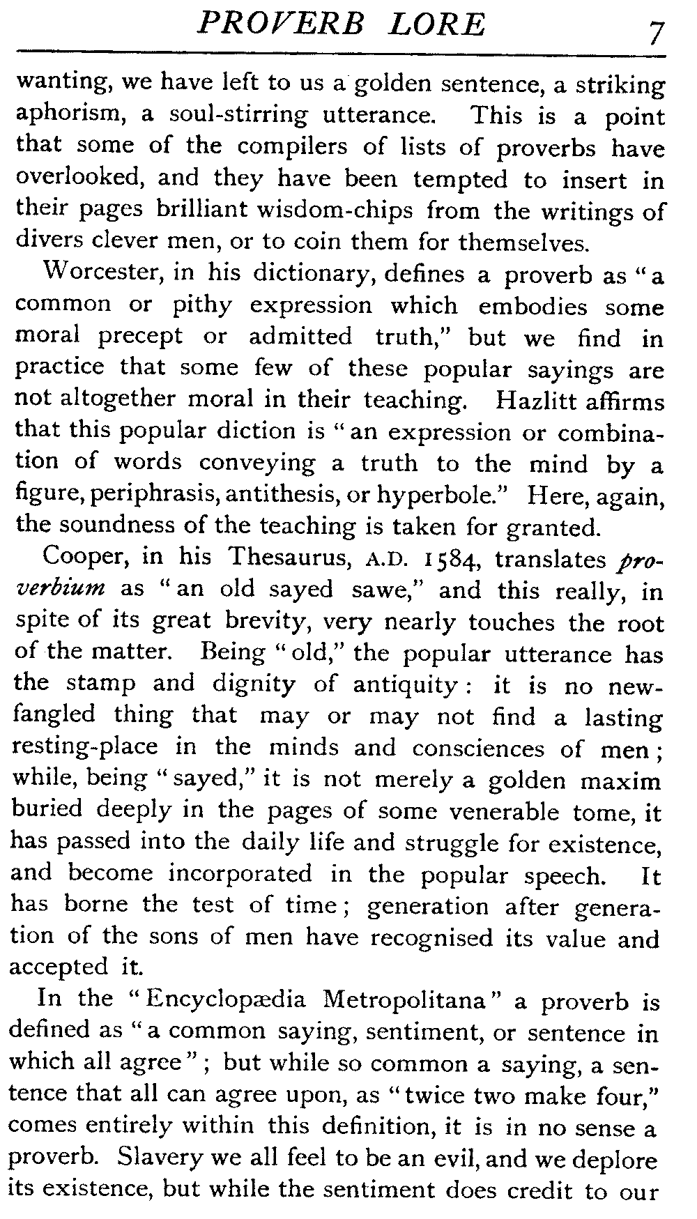 Worcester, in his dictionary, defines a proverb as "a common or pithy expression which embodies some moral precept or admitted truth," but we find in practice that some few of these popular sayings are not altogether moral in their teaching. Hazlitt affirms that this popular diction is "an expression or combination of words conveying a truth to the mind by a figure, periphrasis, antithesis, or hyperbole." Here, again, the soundness of the teaching is taken for granted.