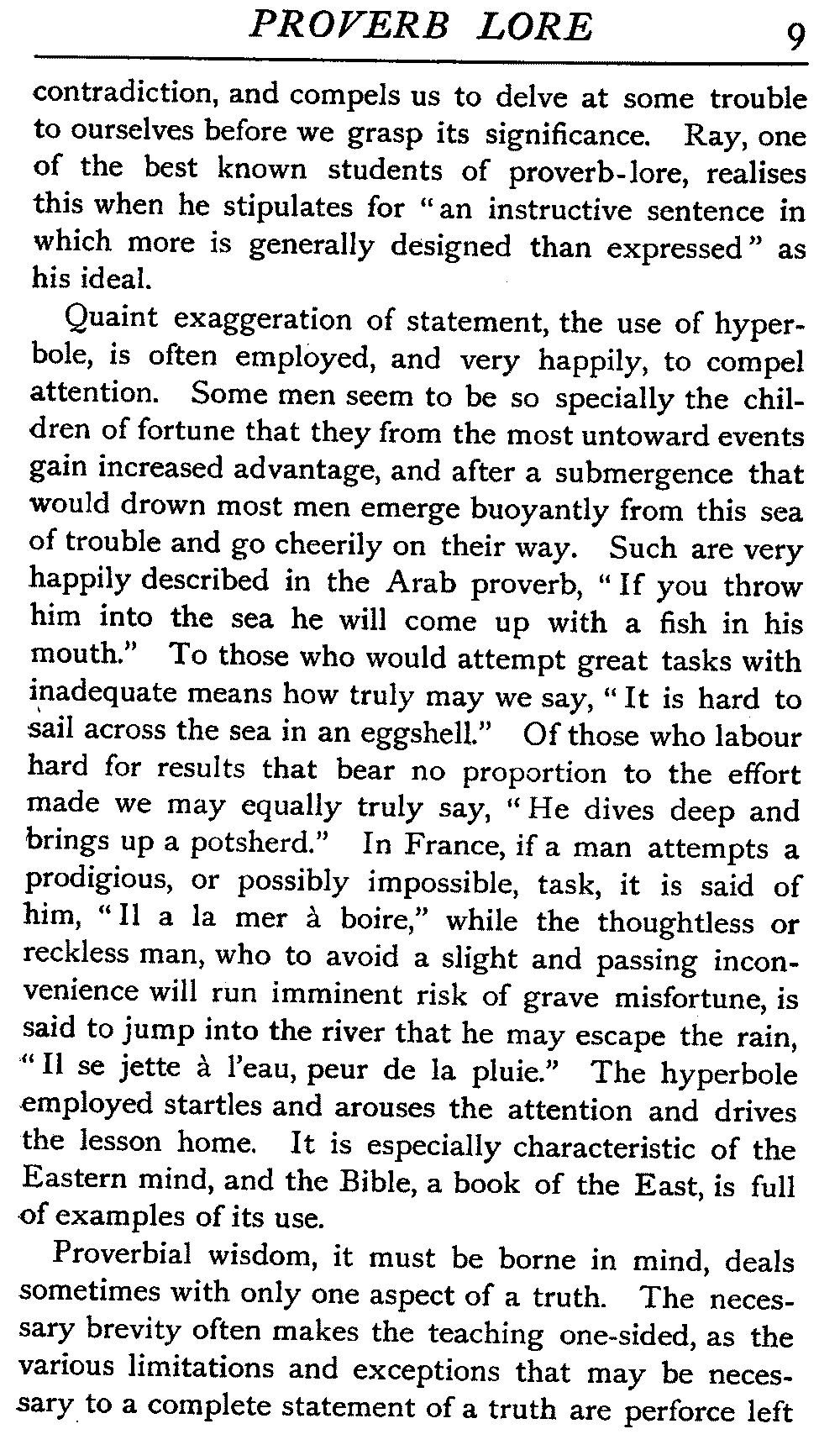 Quaint exaggeration of statement, the use of hyperbole, is often employed, and very happily, to compel attention. Some men seem to be so specially the children of fortune that they from the most untoward events gain increased advantage, and after a submergence that would drown most men emerge buoyantly from this sea of trouble and go cheerily on their way. Such are very happily described in the Arab proverb, "If you throw him into the sea he will come up with a fish in his mouth." To those who would attempt great tasks with inadequate means how truly may we say, "It is hard to sail across the sea in an eggshell." Of those who labour hard for results that bear no proportion to the effort made we may equally truly say, "He dives deep and brings up a potsherd." In France, if a man attempts a prodigious, or possibly impossible, task, it is said of him, "Il a la mer à boire," while the thoughtless or reckless man, who to avoid a slight and passing inconvenience will run imminent risk of grave misfortune, is said to jump into the river that he may escape the rain, "Il se jette à l'eau, peur de la pluie." The hyperbole employed startles and arouses the attention and drives the lesson home. It is especially characteristic of the Eastern mind, and the Bible, a book of the East, is full of examples of its use.