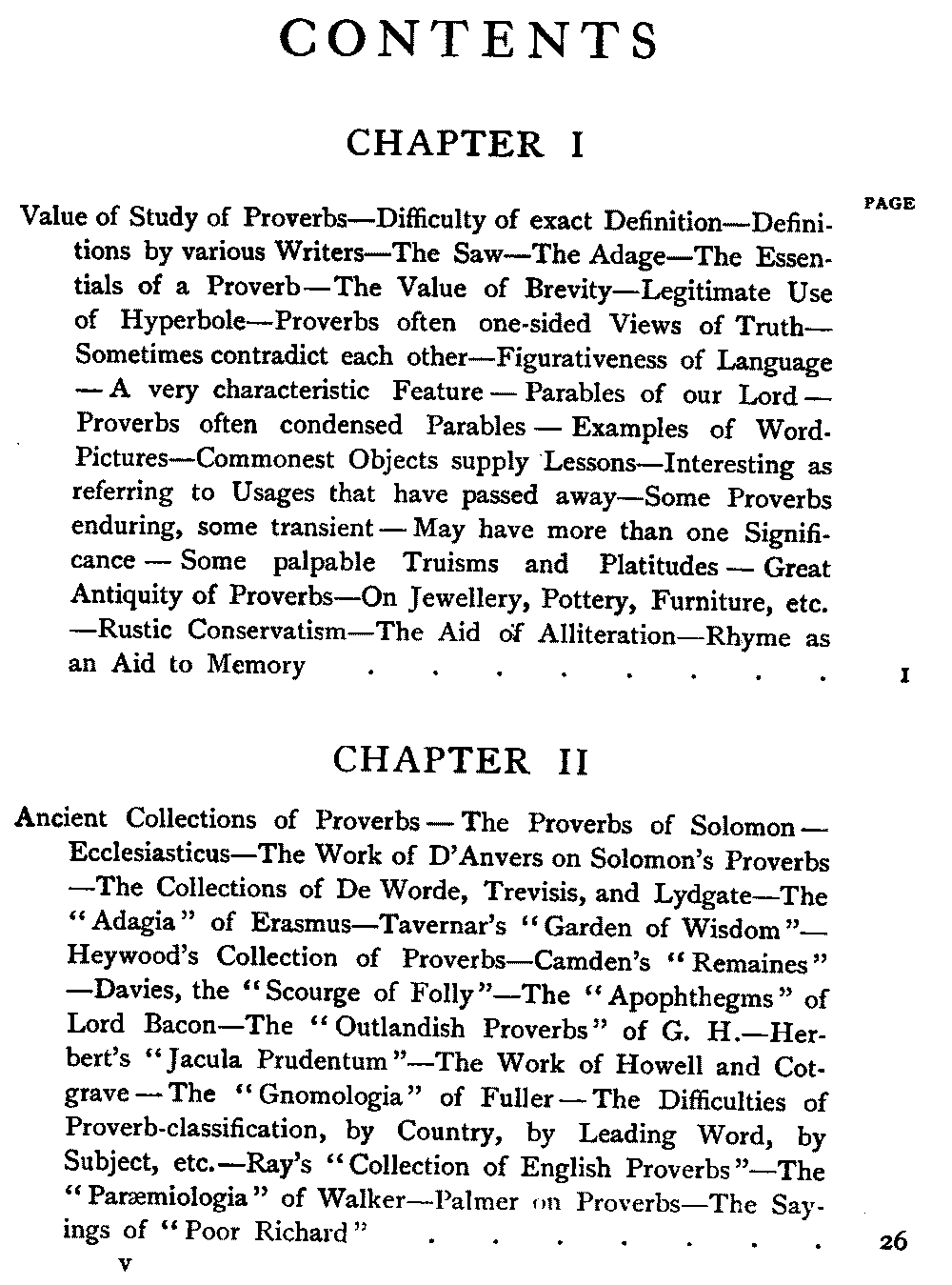 | Value of Study of Proverbs—Difficulty of exact Definition—Definitions by various Writers—The Saw—The Adage—The Essentials of a Proverb—The Value of Brevity—Legitimate Use of Hyperbole—Proverbs often one-sided Views of Truth—Sometimes contradict each other—Figurativeness of Language—A very characteristic Feature—Parables of our Lord—Proverbs often condensed Parables—Examples of Word-Pictures—Commonest Objects supply Lessons—Interesting as referring to Usages that have passed away—Some Proverbs enduring, some transient—May have more than one Significance—Some palpable Truisms and Platitudes—Great Antiquity of Proverbs—On Jewellery, Pottery, Furniture, etc.—Rustic Conservatism—The Aid of Alliteration—Rhyme as an Aid to Memory | 1 |