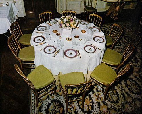 Theodore R. Davis, who designed the State china purchased during the administration of President Rutherford B. Hayes, wrote an article, published in the May 1899 issue of the Ladies’ Home Journal, on the “Presidential Porcelain of a Century.” He records that in 1860 he saw the State Dining Room of the White House set up for the formal dinner given [Pg 112]for the visiting Prince of Wales, and that “the dishes were more or less odd, but generally comprised what was known as the ‘red edge set’.”